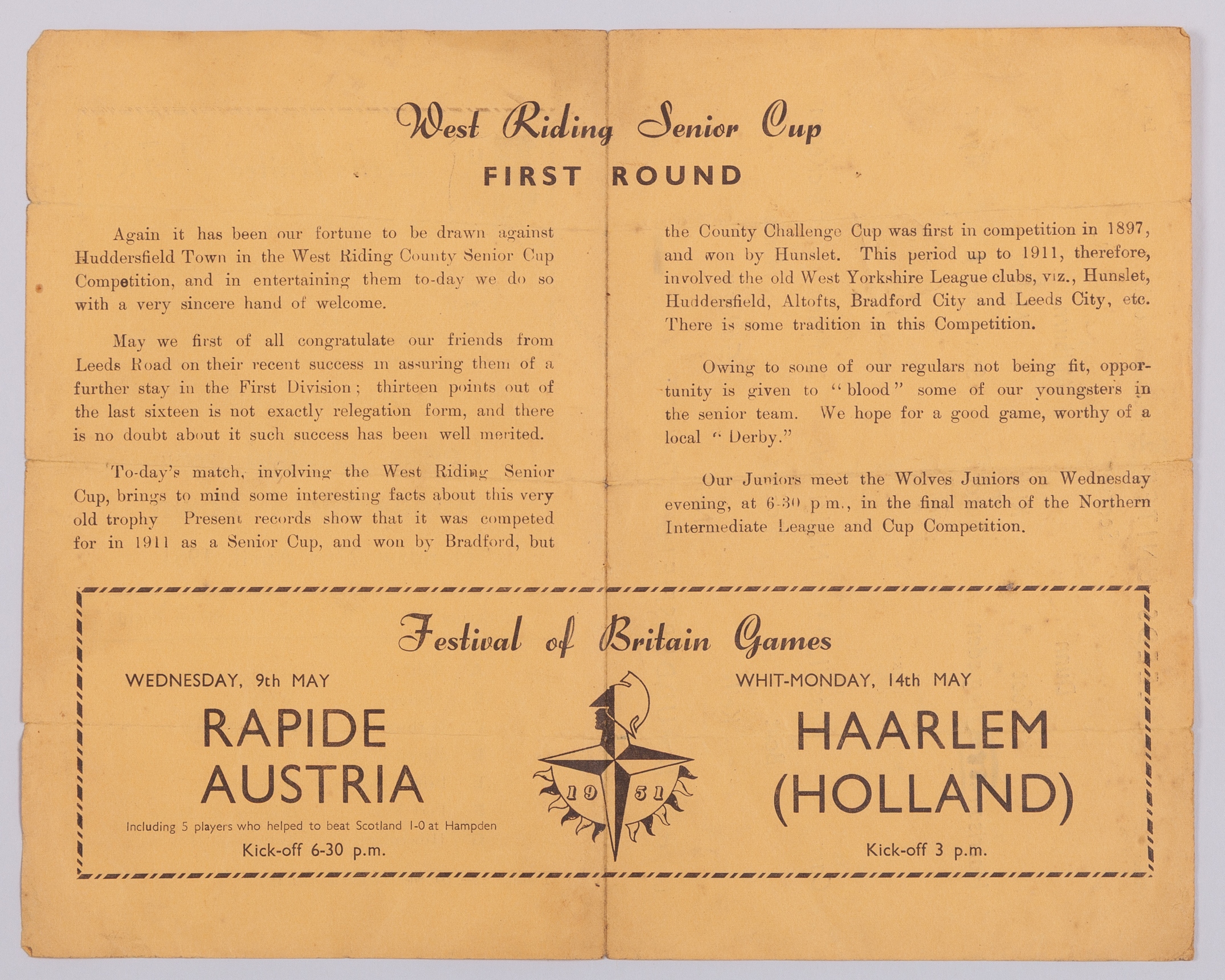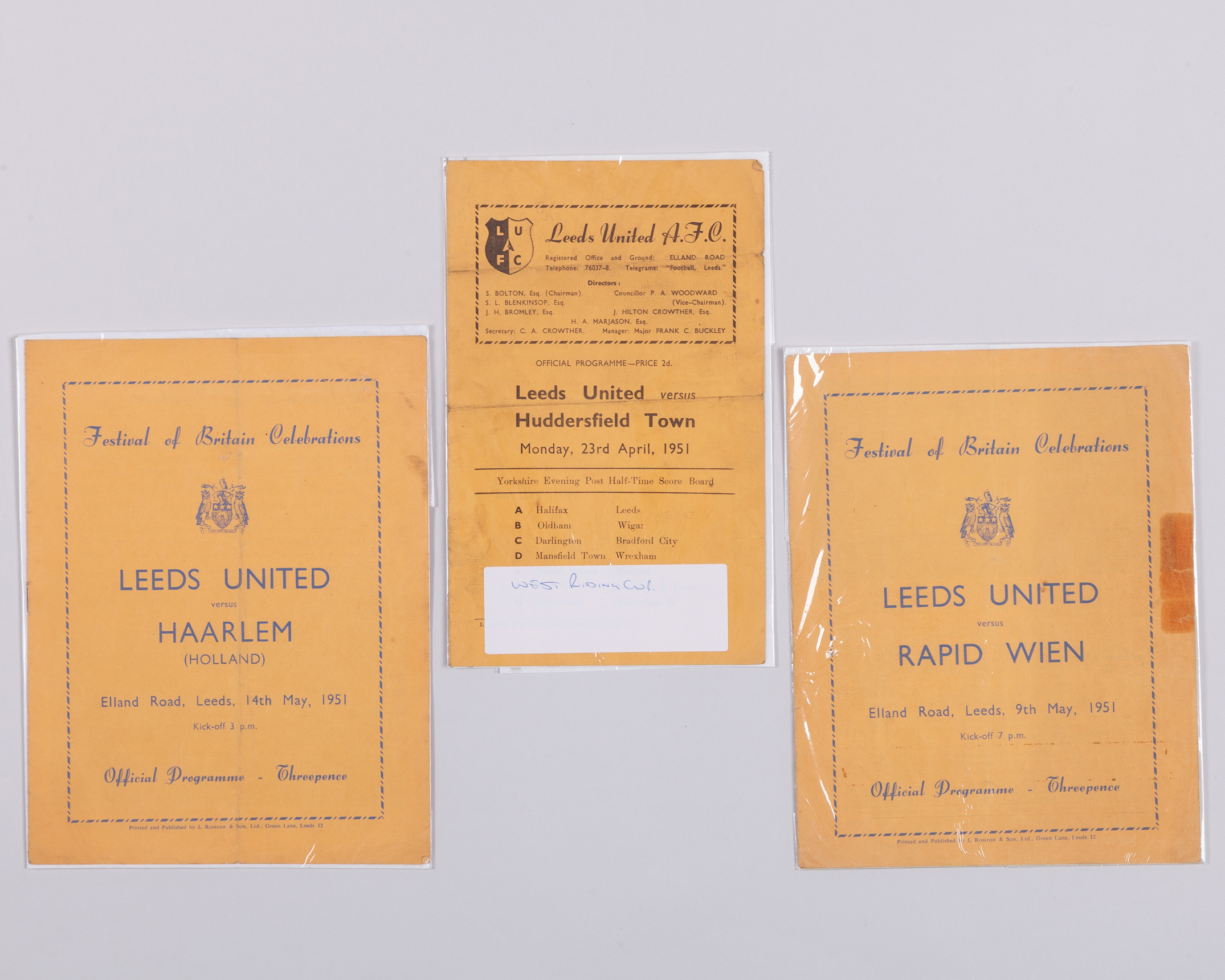 Leeds United v. Rapid Wien and Haarlem Festival of Britain Celebration match programmes, 1951, 9th May and 14th May and Leeds United v. Huddersfield Town, 23rd April 1951, folds (3)
