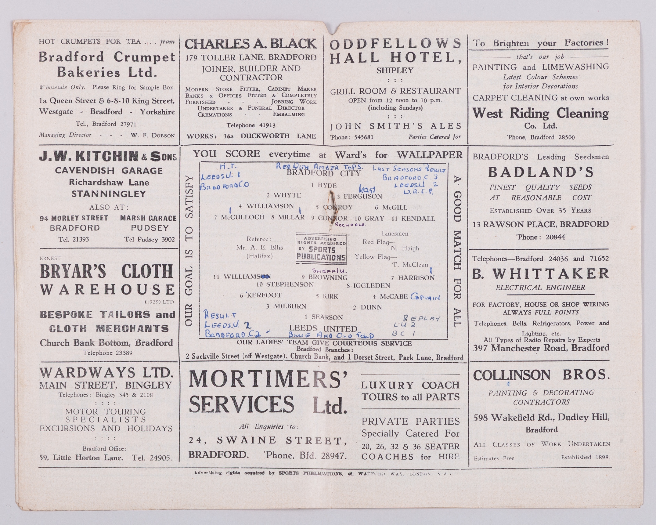 Bradford City v. Leeds United, West Riding Cup Semi-Final match programme, 2nd May 1951, fold, text on team page