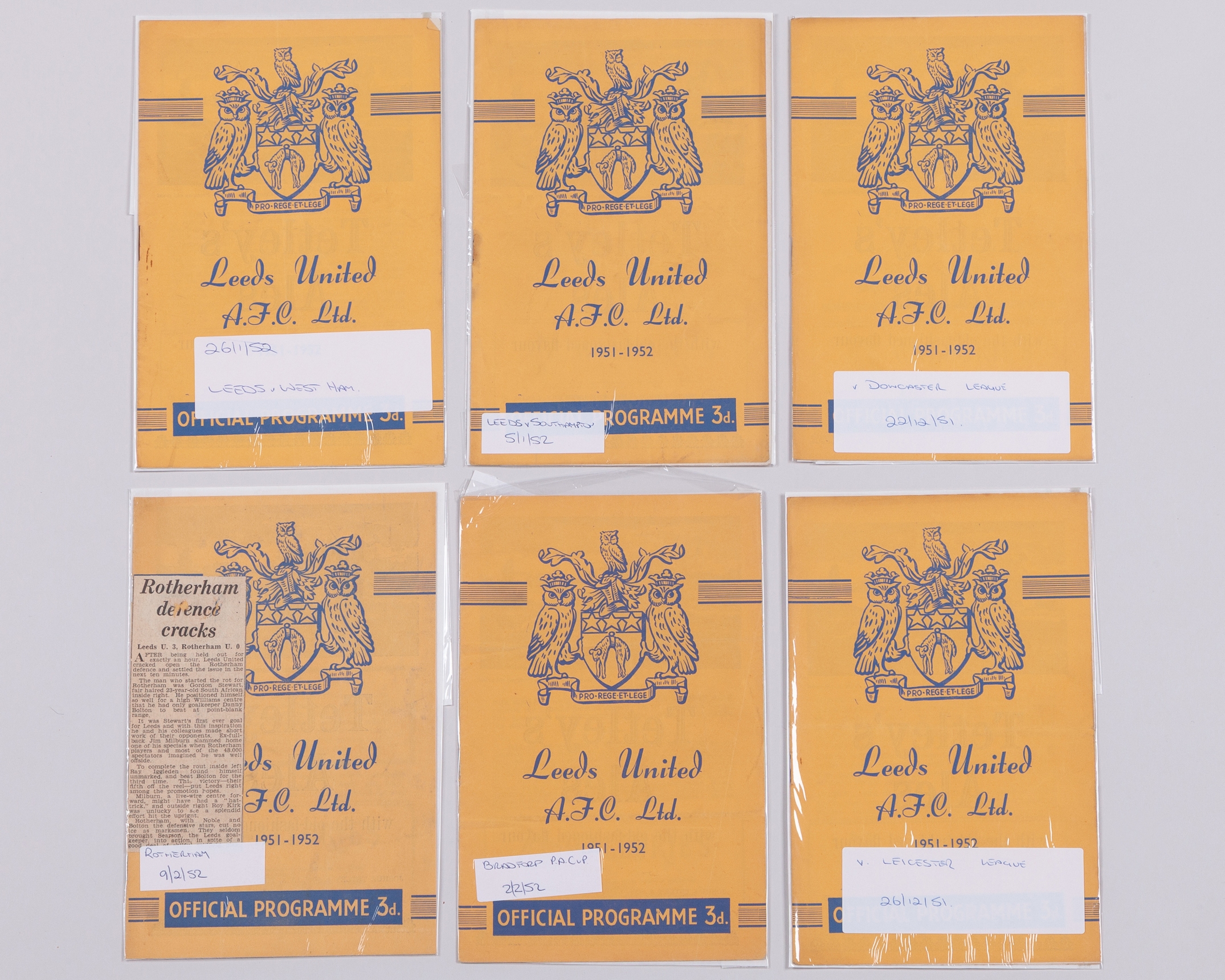 Six Leeds United home match programmes, 1951-52 comprising Doncaster Rovers, 22nd December 1951, Leicester city, 26th December 1951, Southampton, 5th January 1952, West Ham United, 26th January 1952, Bradford, F.A.Cup, 2nd February 1952 and Rotherham, folds, some text (6)