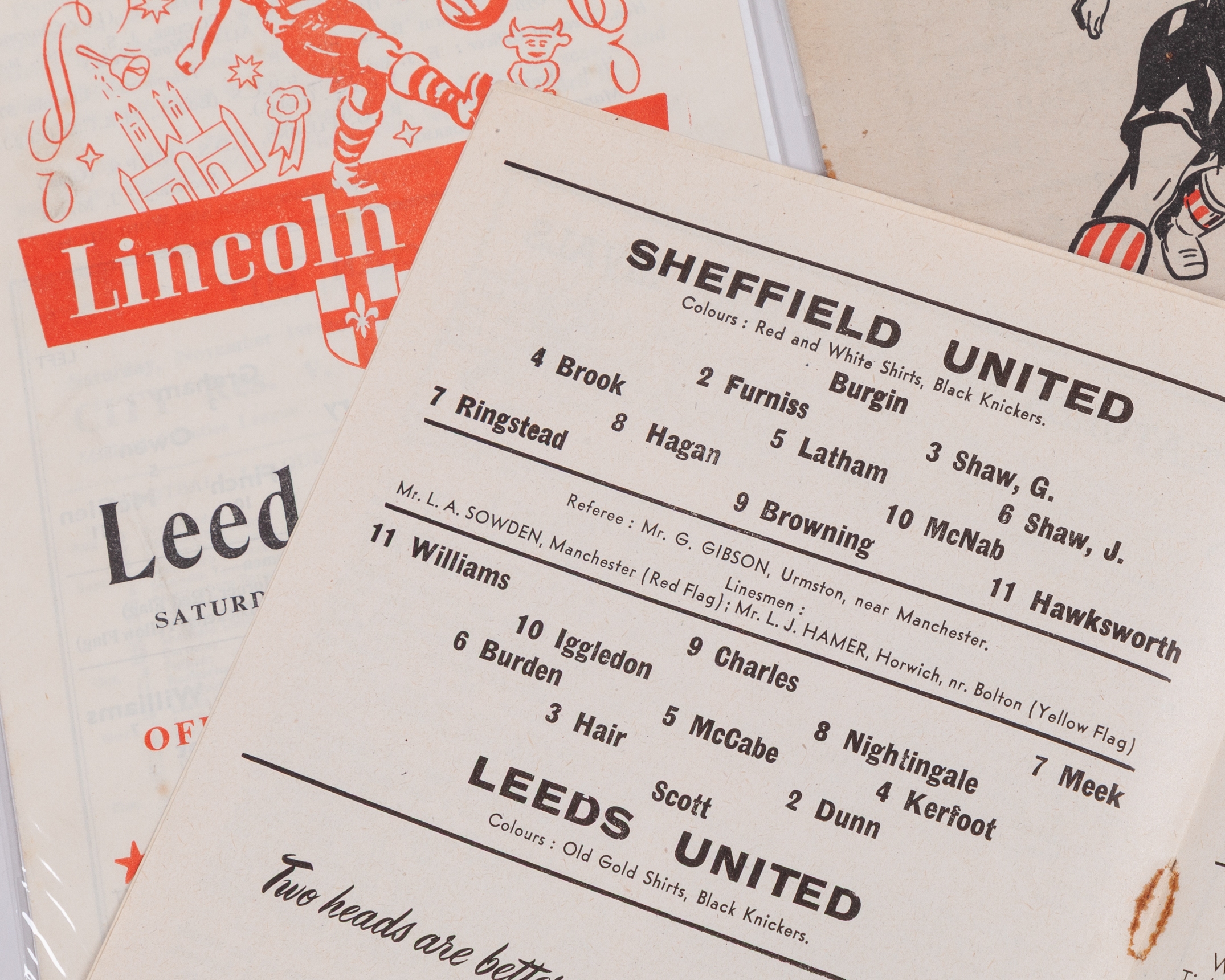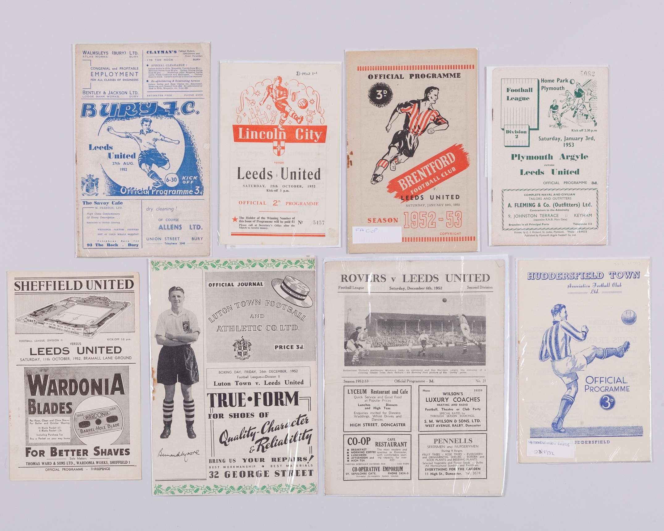 Eight Leeds United away match programmes, 1952-53 comprising Huddersfield Town, 23rd August 1952, Bury, 27th August 1952, Sheffield United, 11th October 1952, Lincoln City, 25th October 1952, Doncaster Rovers, 6th December 1952, Luton Town, 26th December 1952, Plymouth, 3rd January 1953 and Brentford, F.A.Cup. 20th January 1953, folds (8)