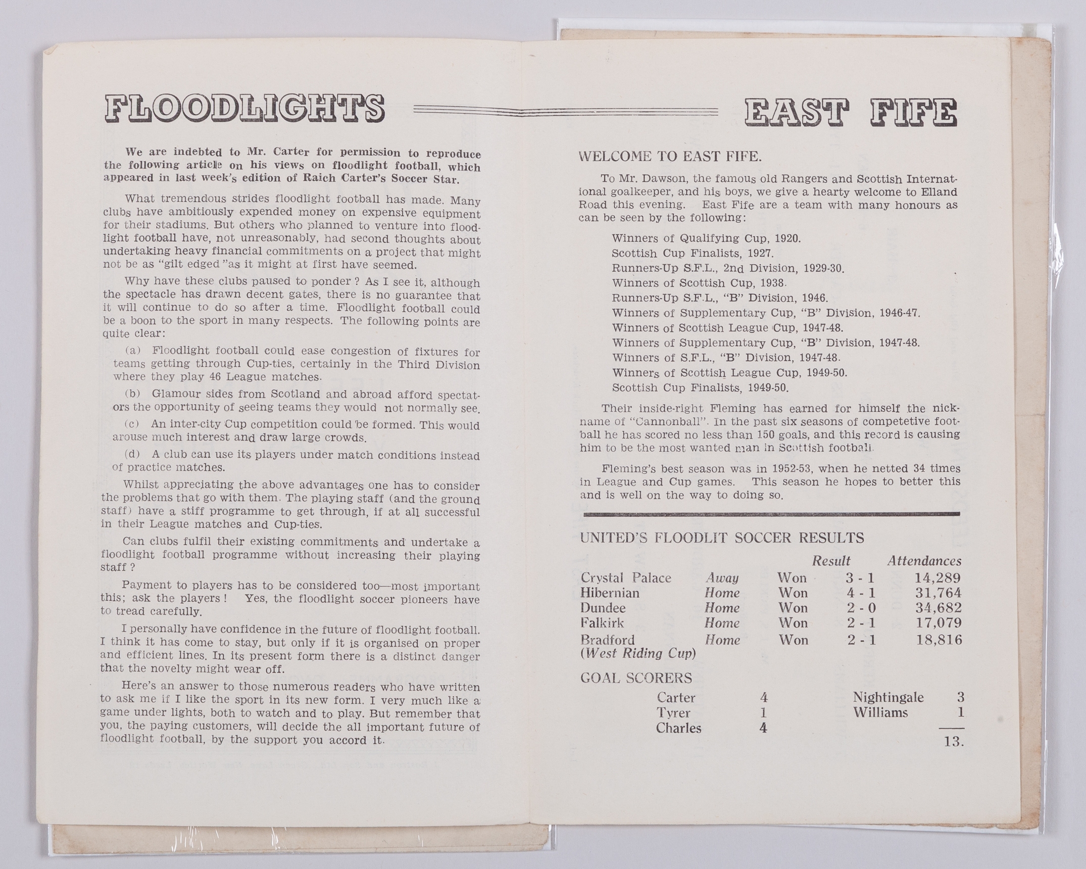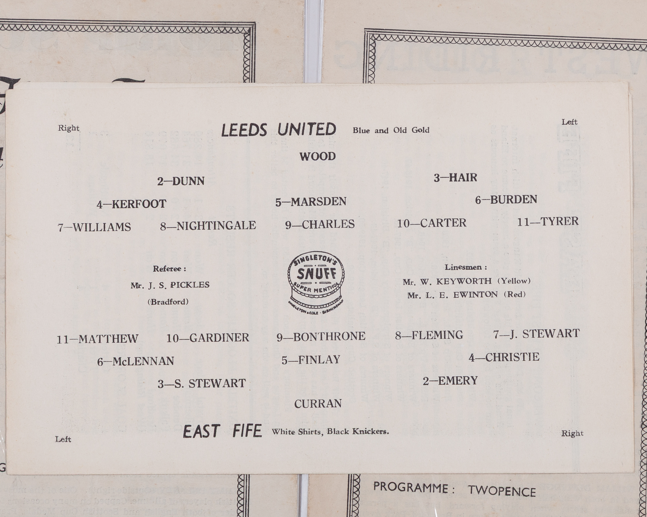 Four Leeds United floodlit match programmes, comprising Dundee, 16th November, Falkirk, 23rd November, Bradford, 30th November and East Fife, 7th December 1953, folds (4)