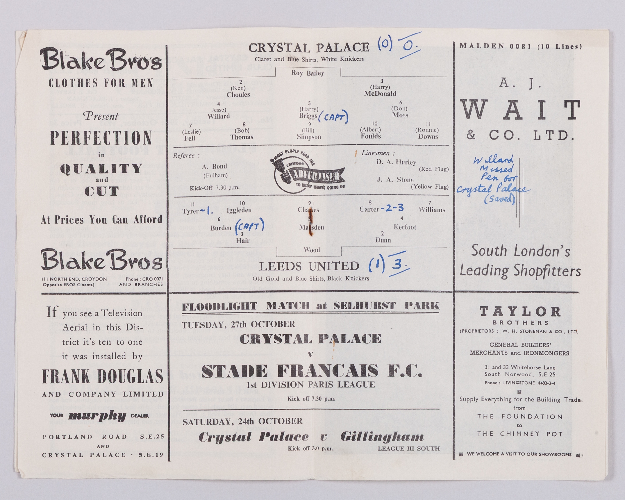 Crystal Palace v. Leeds United Floodlight match programme, 20th October 1953, folds, text on team pages