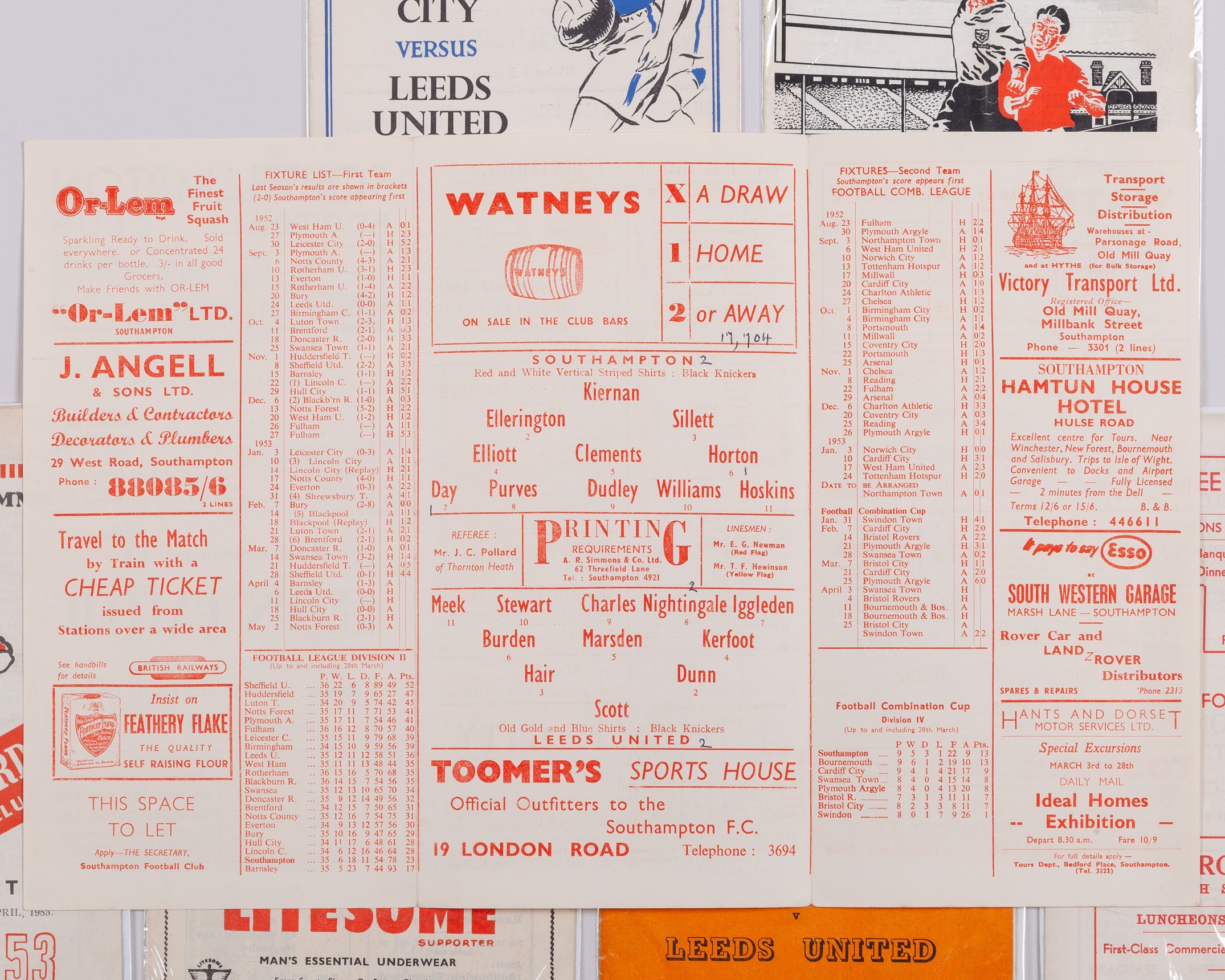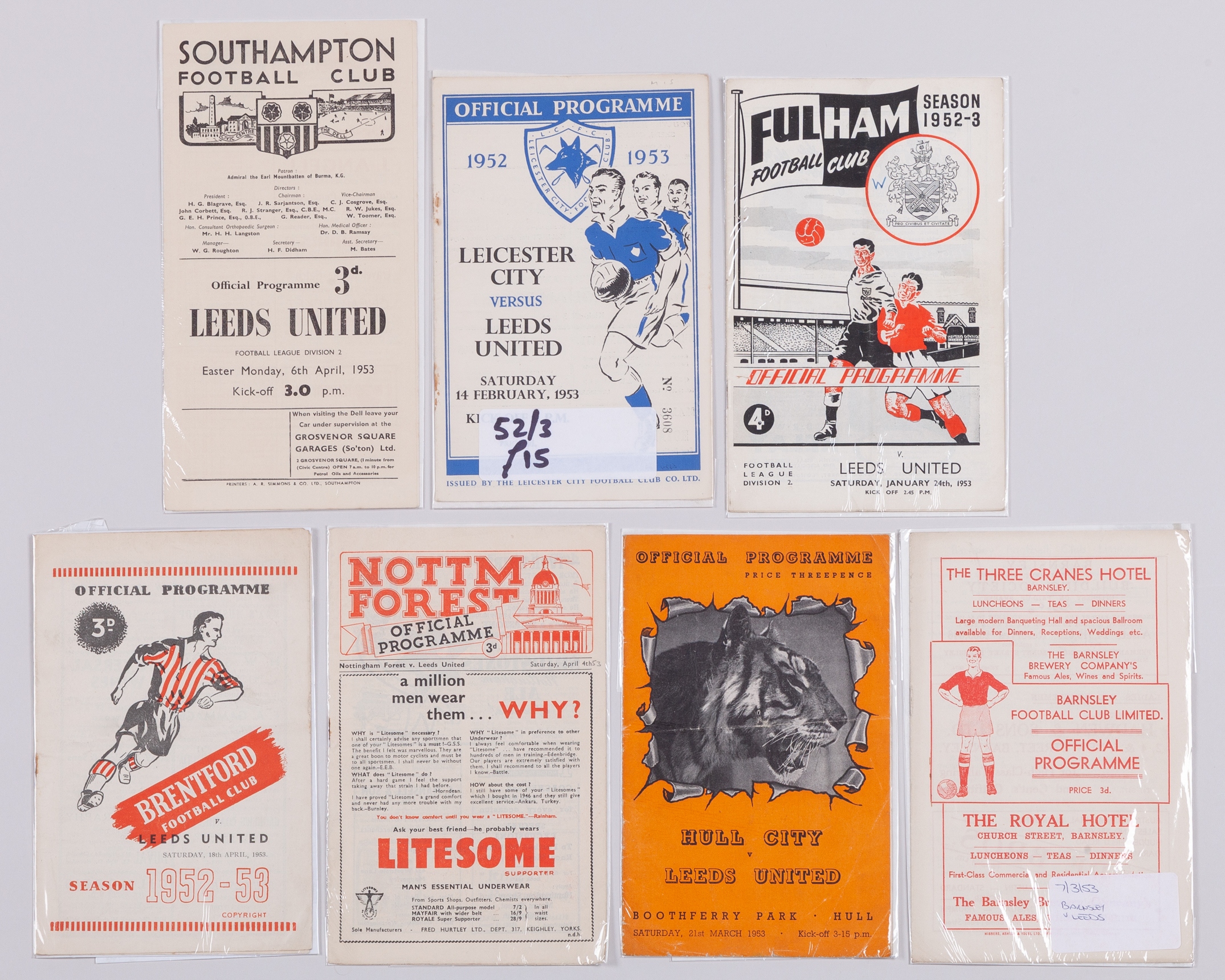 Seven Leeds United away match programmes 1953 comprising Fulham, 24th January 1953, Leicester City, 14th February 1953, Barnsley, 7th March 1953, Hull City, 21st March 1953, Nottingham Forest, 4th April 1953, Southampton, 6th April 1953 and Brentford, 18th April 1953, folds (7)