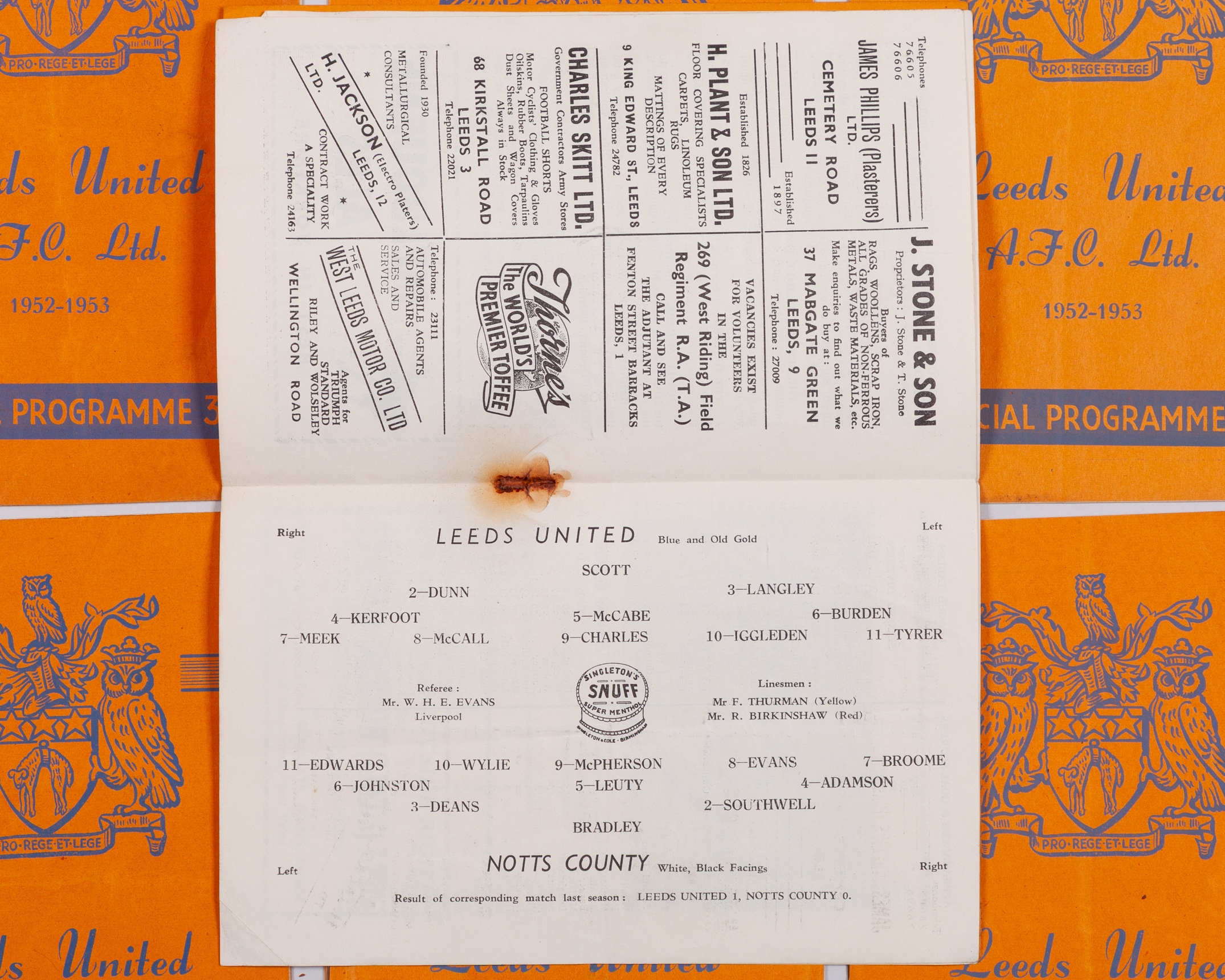 Seven Leeds United home match programmes, 1953 comprising West Ham United, 7th February 1953, Notts County, 21st February 1953, Sheffield United, 28th February 1953, Lincoln, 14th March 1953, Blackburn, 28th March 1953, Everton, 11th April 1953 and Notts Forest, 22nd April 1953, folds, some text (7)