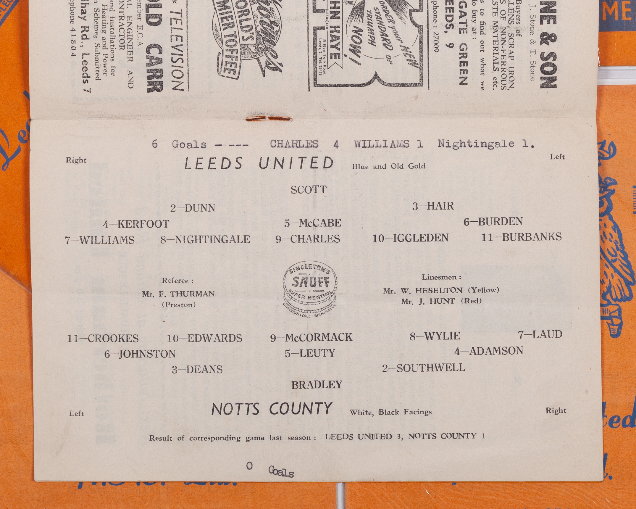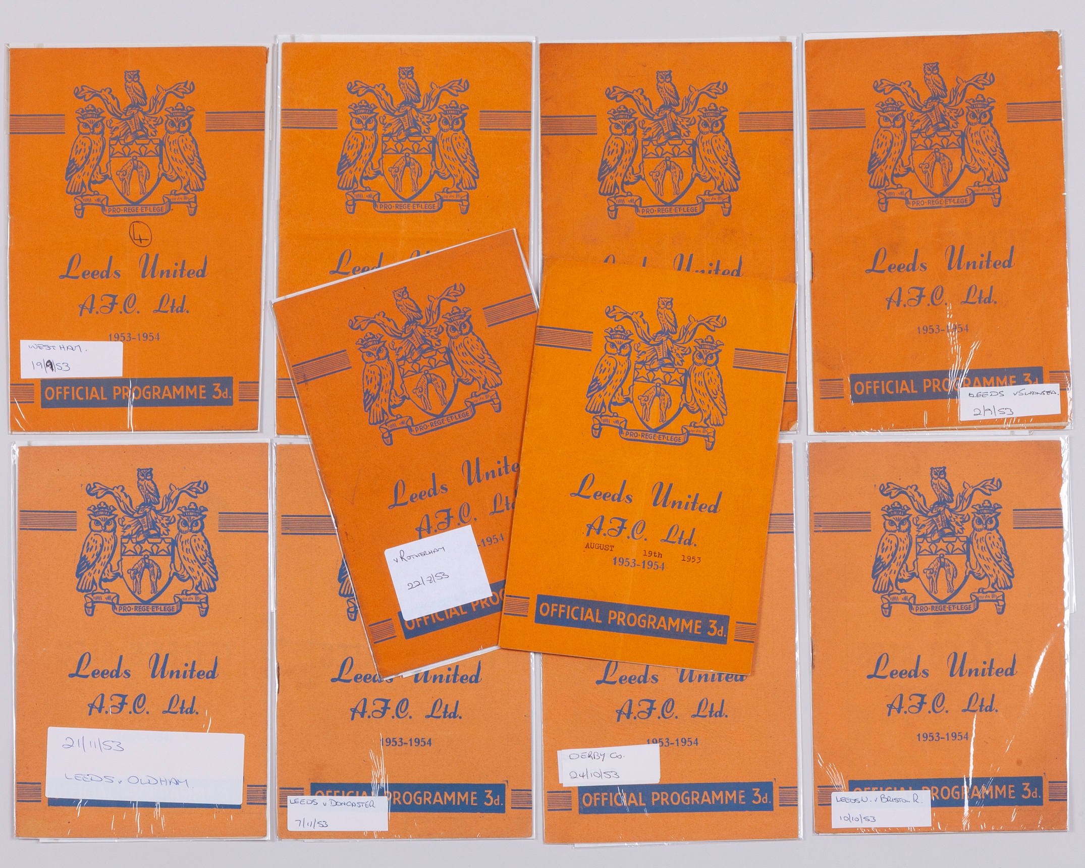 Ten Leeds United home match programmes, 1953-54 comprising Notts County, 19th August 1953, Rotherham, 22th August 1953, Swansea, 2nd September 1953, Stoke City, 5th September 1953, Plymouth Argyle, 16th September 1953, West Ham United, 19th September 1953, Bristol Rovers, 10th October 1953, Derby County, 24th October 1953, Doncaster, 7th November 1953 and Oldham, 21st November 1953, folds, some text (10)