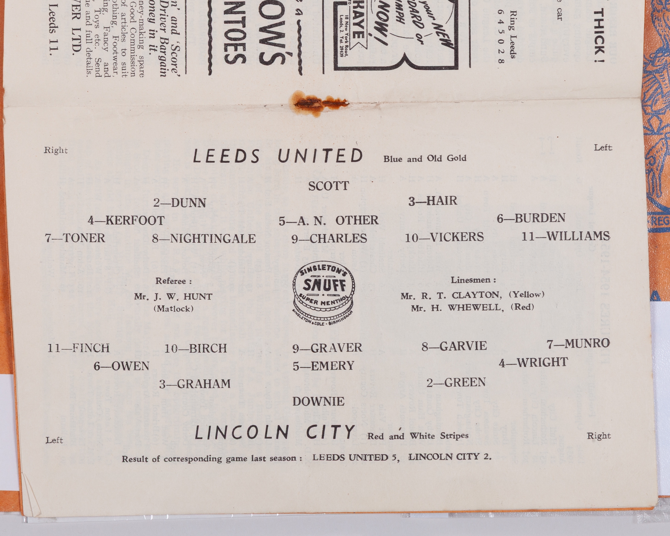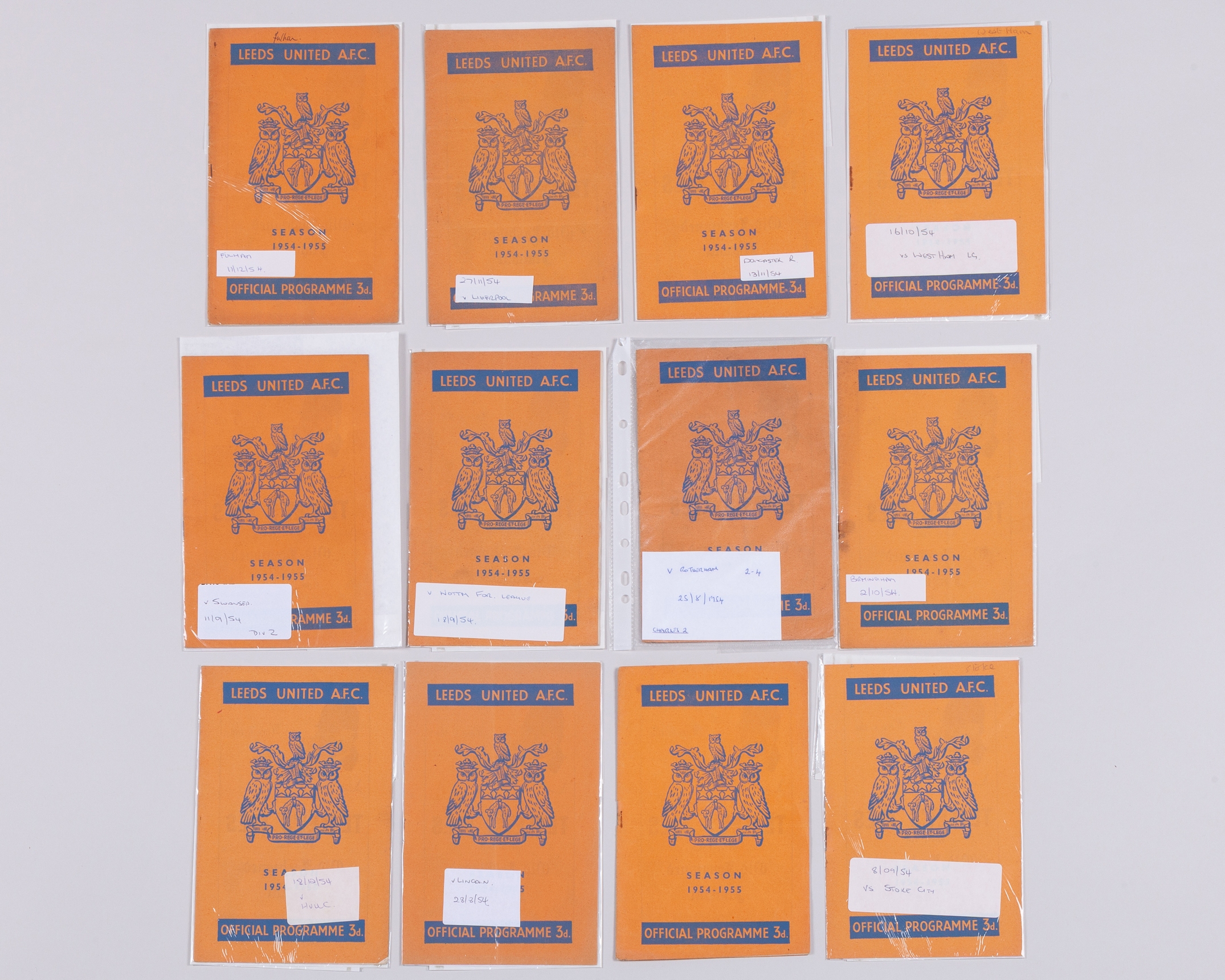 Twelve Leeds United home match programmes 1954-55 comprising Rotherham, 28th August 1954, Lincoln, 28th August 1954, (two copies), Stoke City, 8th September 1954, Swansea, 11th September 1954, Nottingham Forest, 18th September 1964, Birmingham, 2nd October 1954, West Ham United, 16th October 1954, Doncaster Rovers, 13th November 1954, Liverpool, 27th November 1954, Fulham, 11th December 1954 and Hull City, 18th December 1954, folds, some text (12)