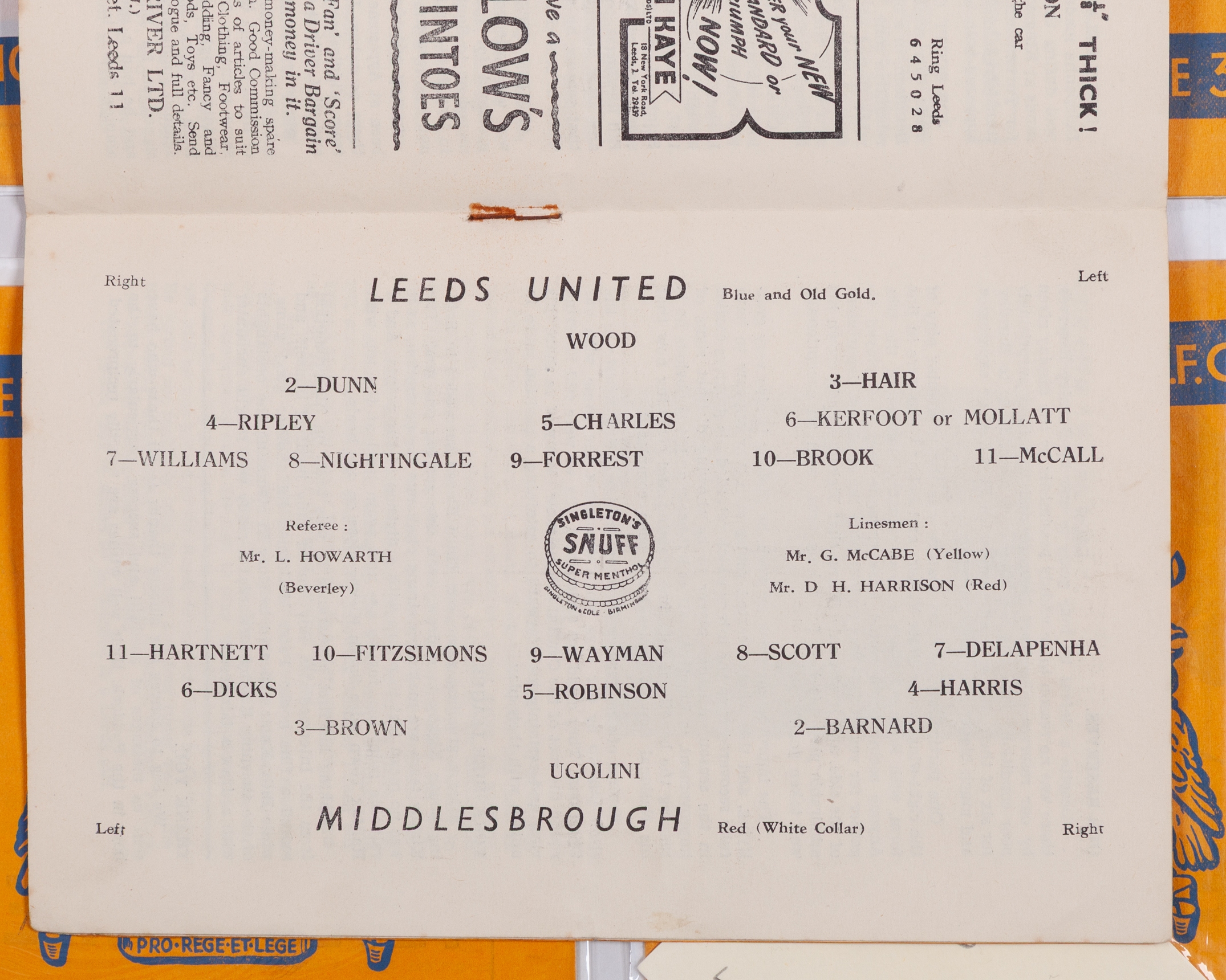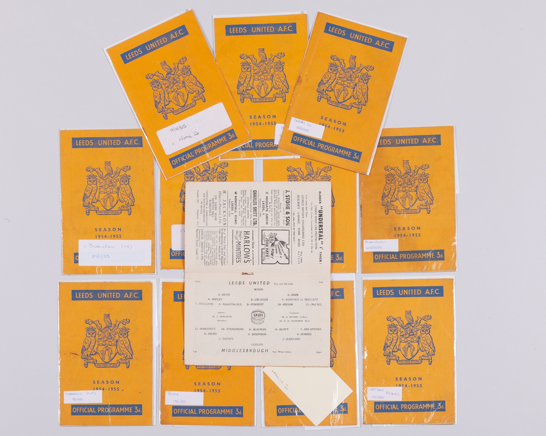 Twelve Leeds United home match programmes 1954-55 comprising Middlesbrough, 25th December 1854, Torquay, F.A.Cup, 8th January 1955, Bury, 15th January 1955, Blackpool, Friendly 29th January 1955, Ipswich Town, 12th February 1955, West Bromwich Albion, Friendly, 19th February 1955, Derby County, 26th February 1955, Bristol Rovers, 12th March 1955, Port Vale, 26th March 1955, Notts County, 9th April 1955, Luton Town, 11th April and Blackburn, 23rd April 1955, folds, some text (12)