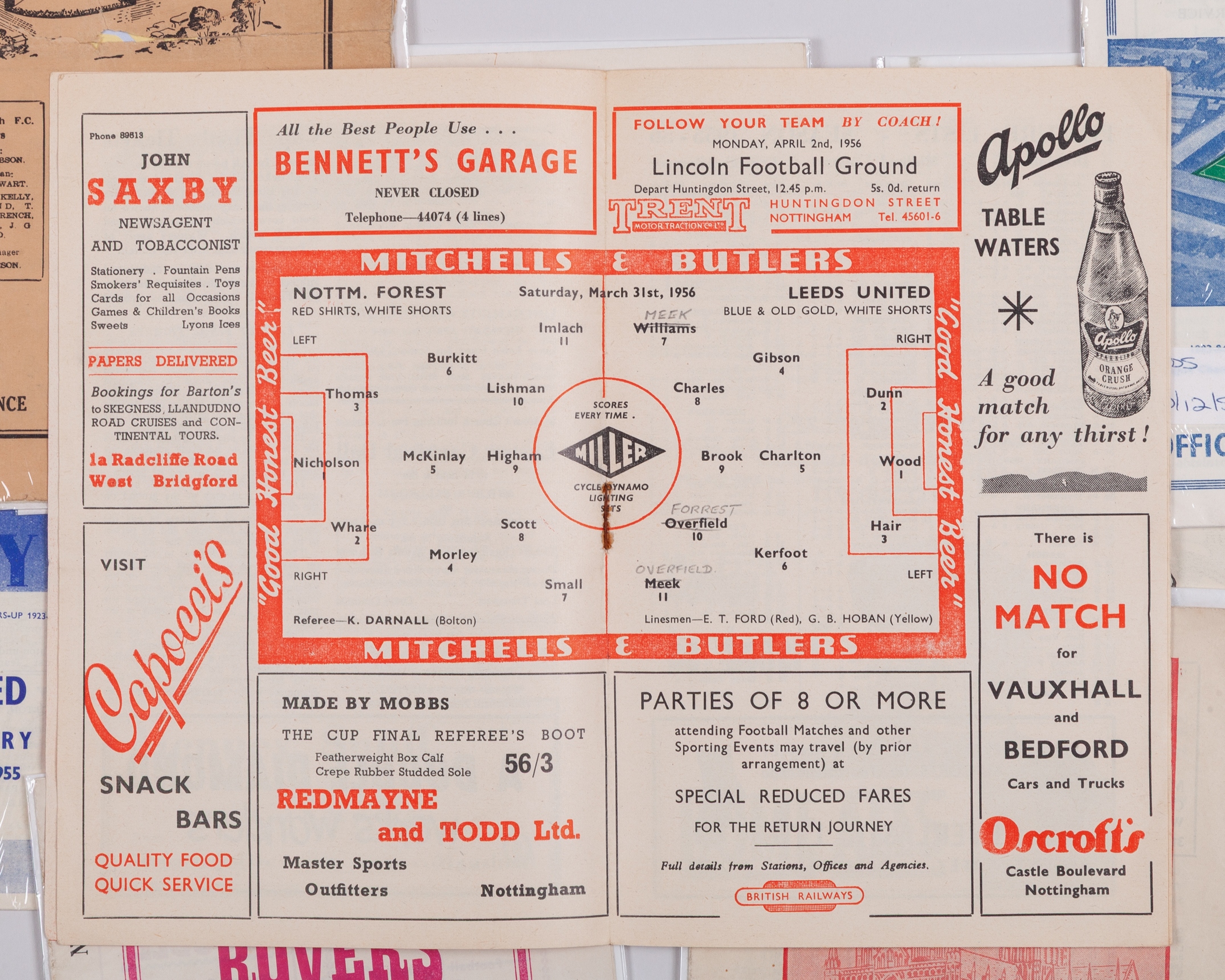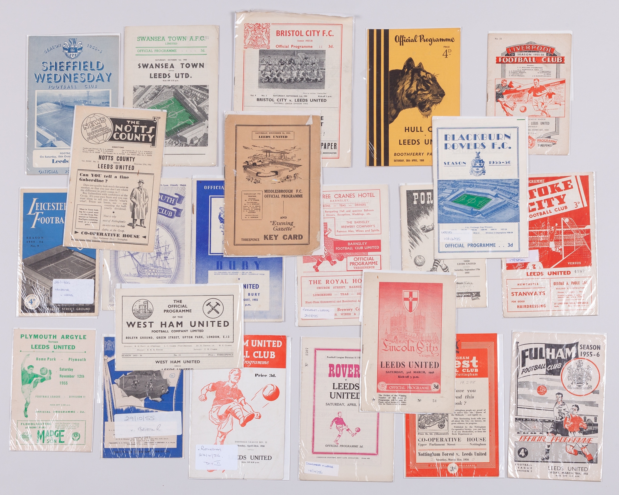 Complete run of Leeds United away match programmes, 1955-56, including Portsmouth Friendly, 18th February 1956, folds, some text (22)