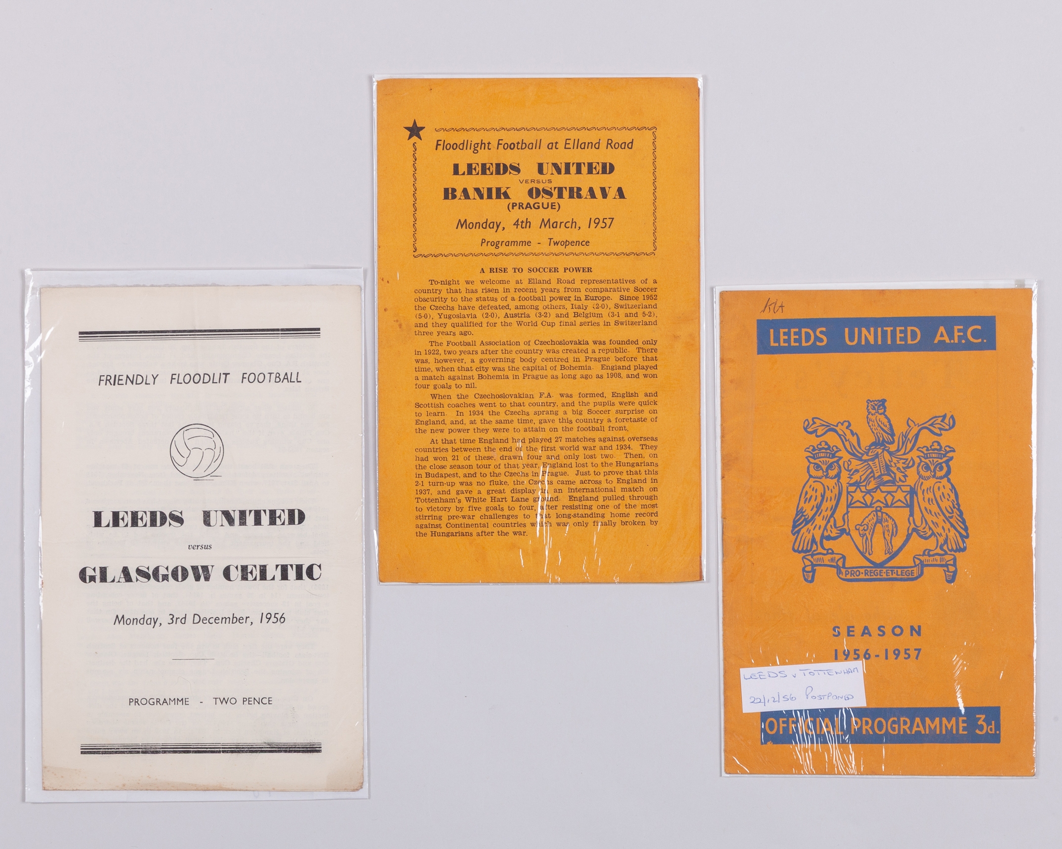 Leeds United v. Tottenham Hotspur postponed match programme, 22nd December 1956, Leeds United v. Celtic, Floodlit match, 3rd December 1956 and Leeds United v. Banik Ostrava, 4th March 1957, folds (3)