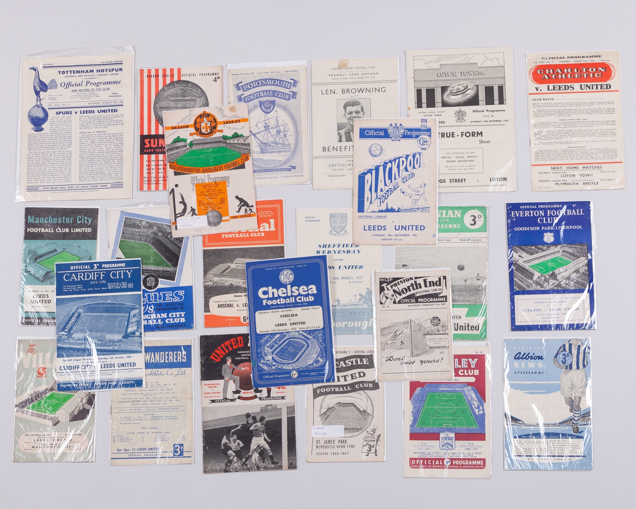 Complete run of Leeds United away match programmes, 1956-57, including Bolton Wanderers, 12th January 1957, punch holes, Hibernian v. Leeds United, 18th March 1957 and Combined United/Wednesday XI v. Leeds United, Len Browning Benefit match programme, 1st October 1956, folds, some text (23)