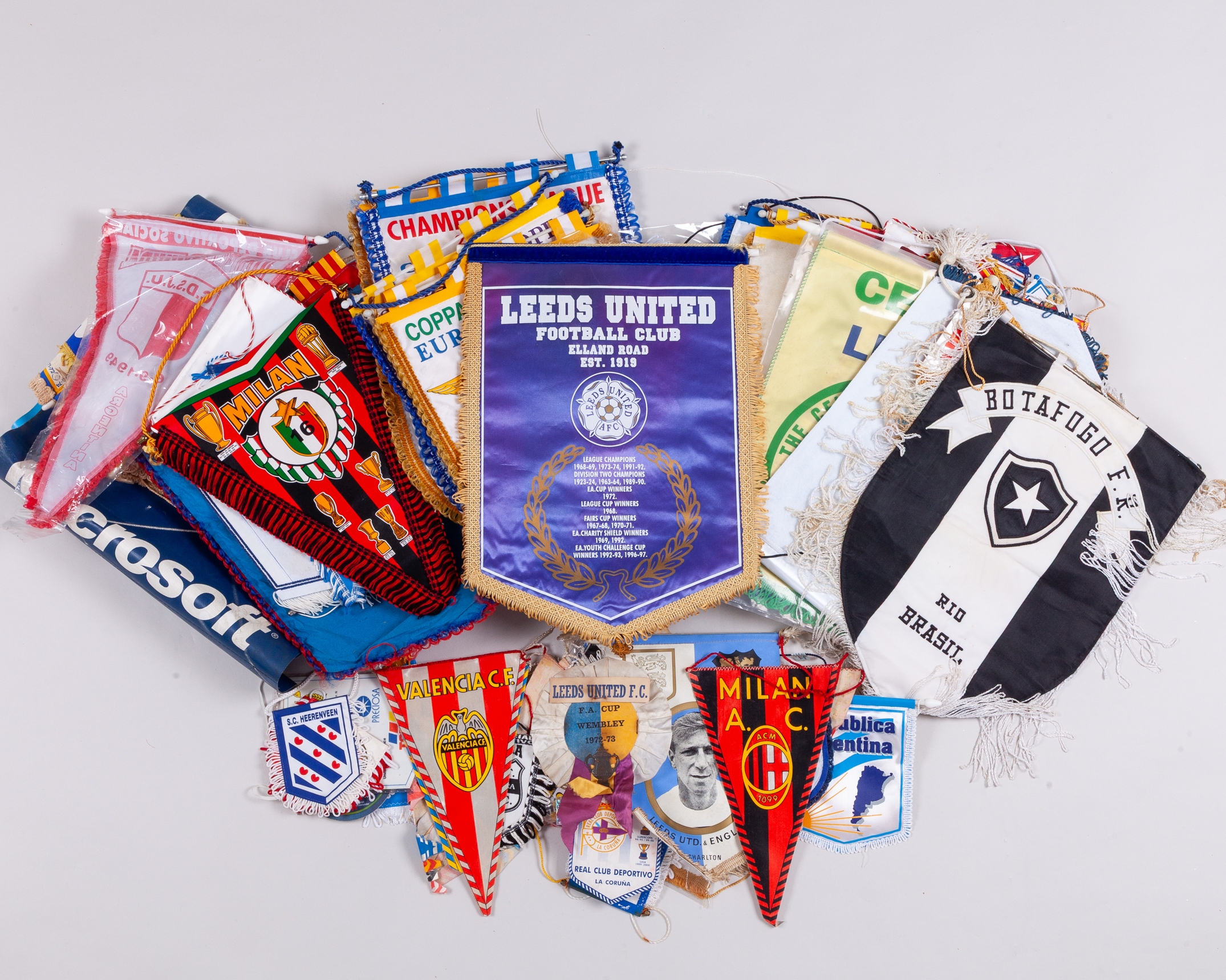 Five Leeds United F.A.Cup rosettes and another Leeds rosette and a collection of pennants