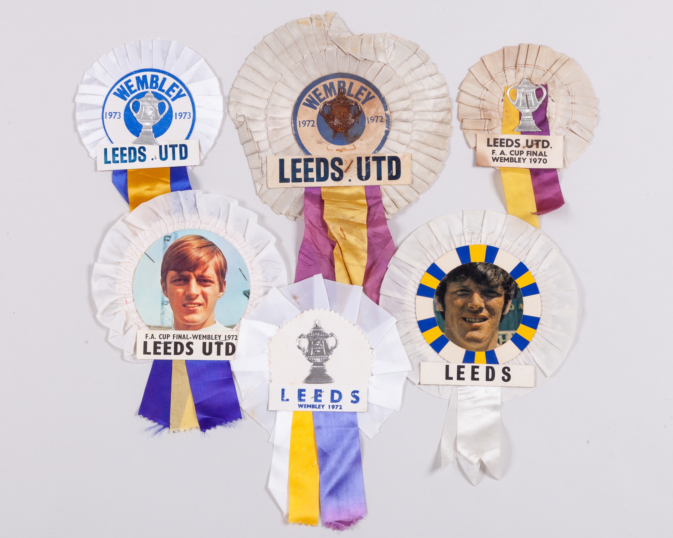 Five Leeds United F.A.Cup rosettes and another Leeds rosette