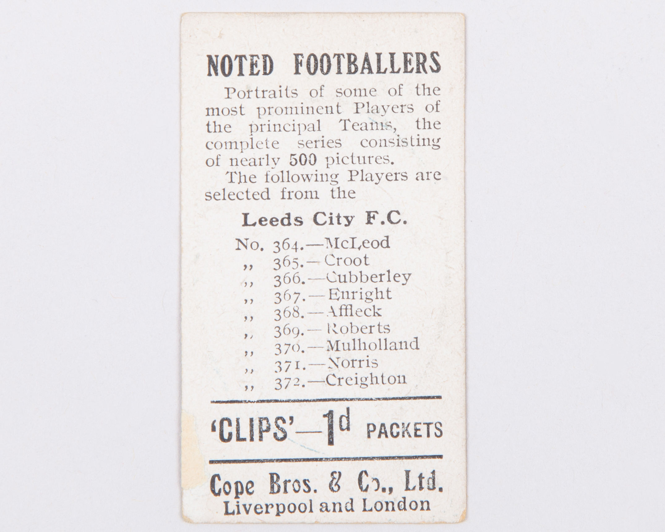 Eleven Leeds City cigarette cards including Cope's Clips, No.305 Croot, Prominent Footballers, D. Dougal, Scissors card, William McLeod, Chruchman's J.H. Spiers etc (11) with Grapnel Mixture reprinted set