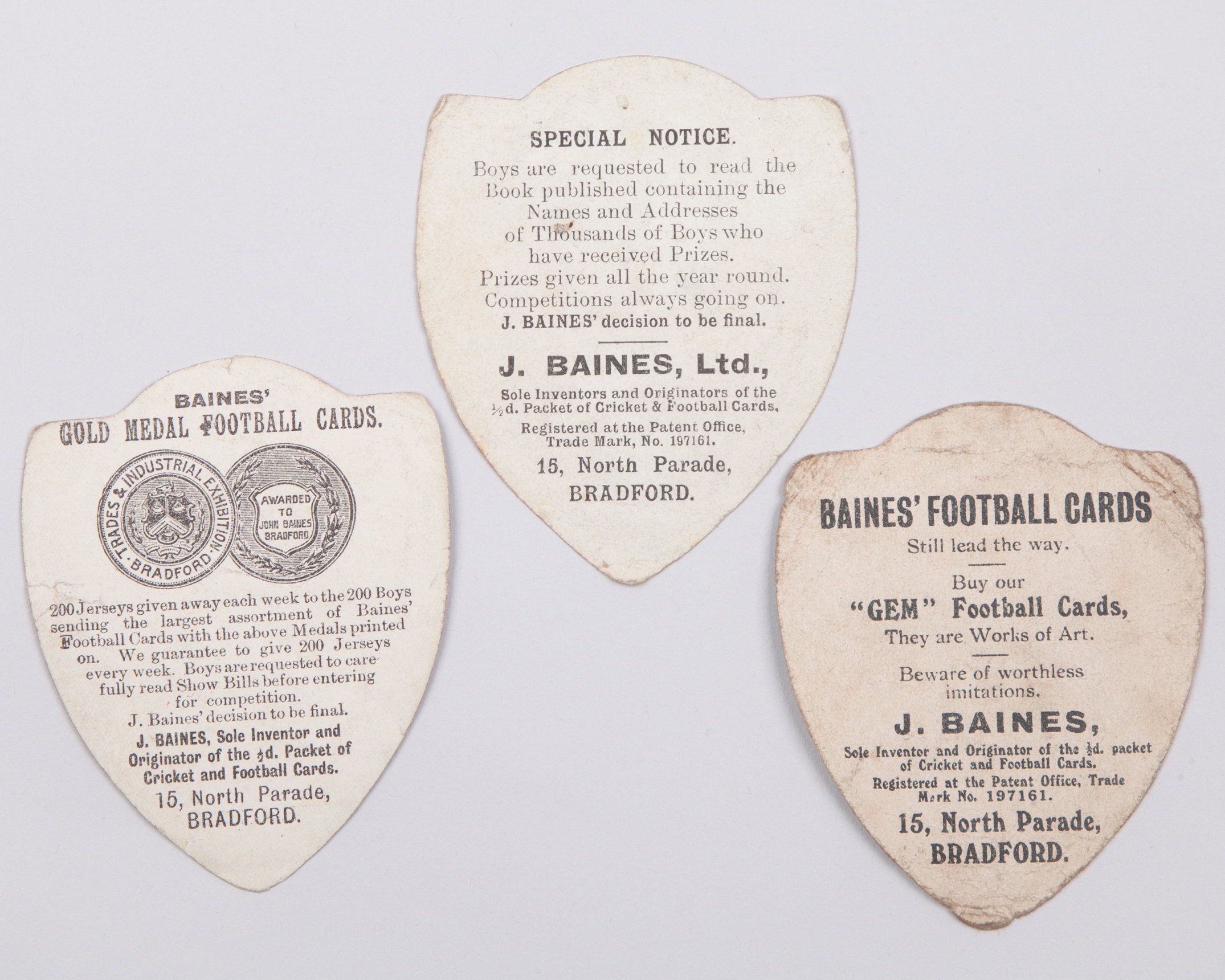 Three Leeds City Baines Leeds shield-shaped cards, Singleton, Jack White and Leeds City (3)