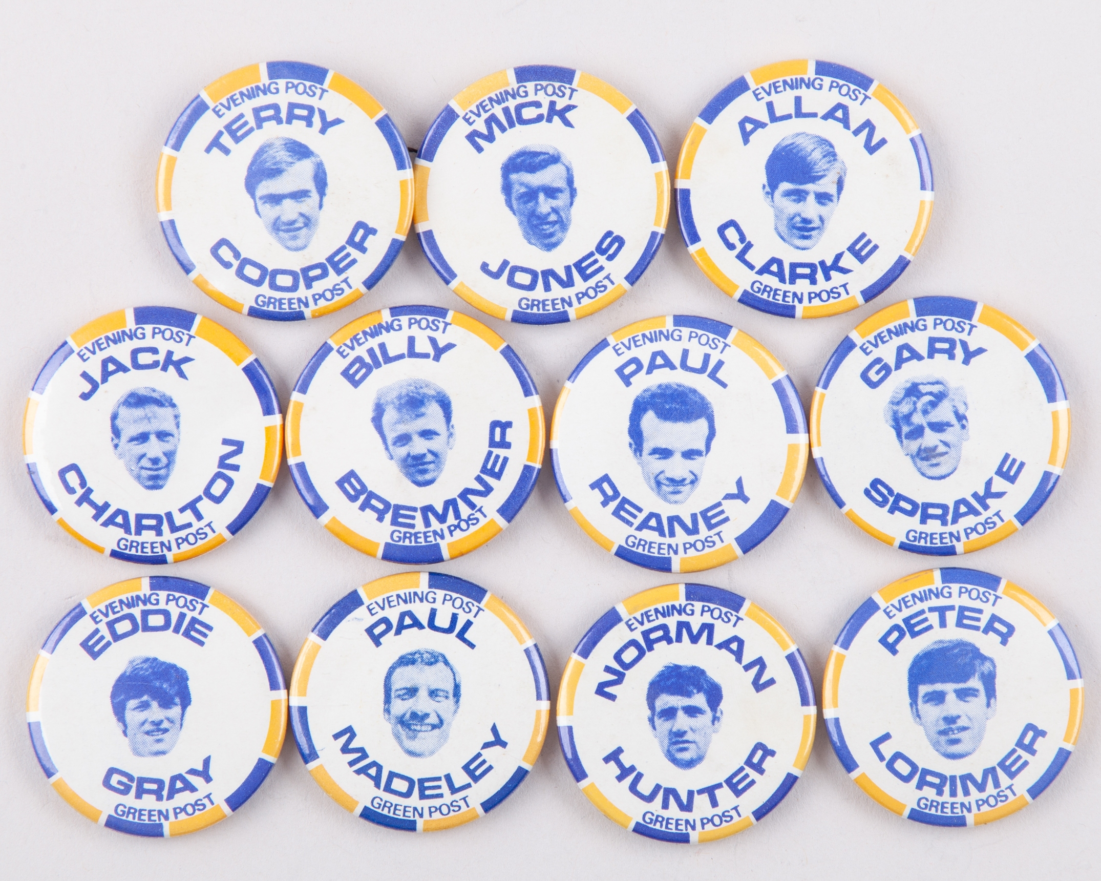 Eleven Evening Post Leeds United lapel badges including Billy Bremner, Mick Jones, Norman Hunter, Jack Charlton (11)