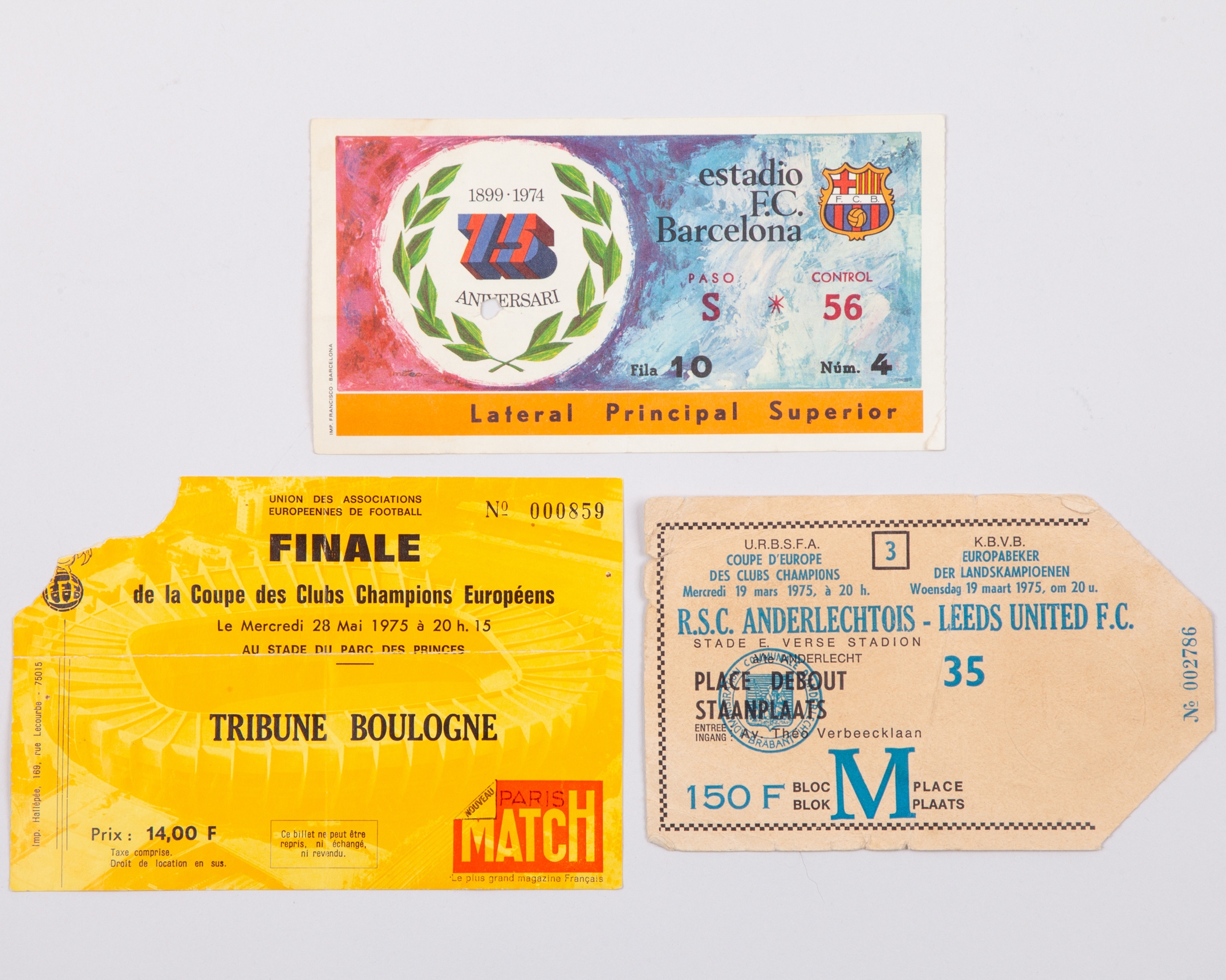 Anderlecht v. Leeds United, European Cup, 2nd leg, 19th March 1975, European Cup Final ticket, 28th May 1975 and Barcelona v. Leeds United European Cup semi-final ticket, 24th April 1975 (3)