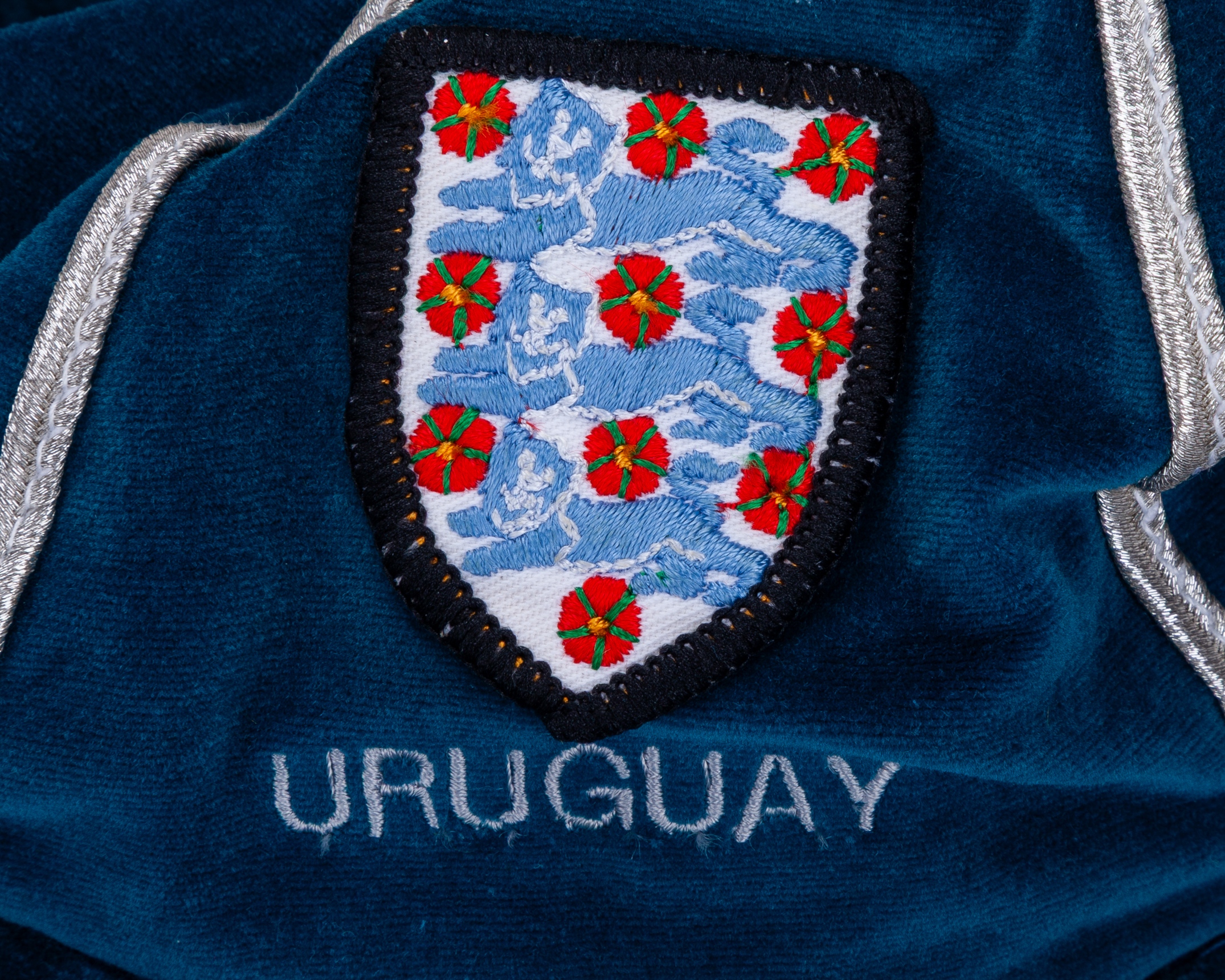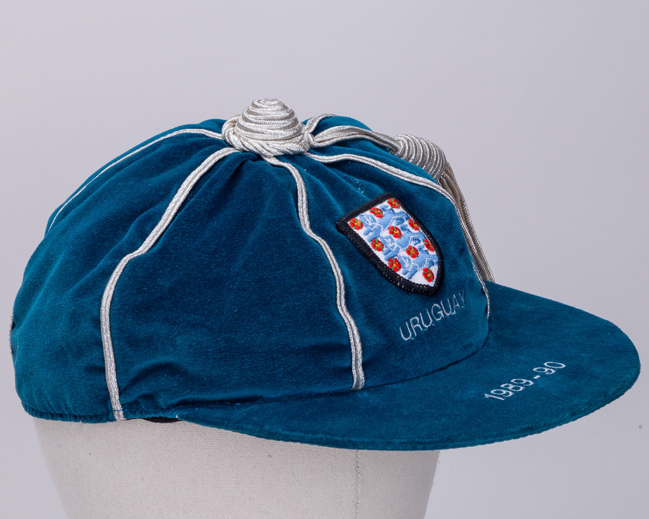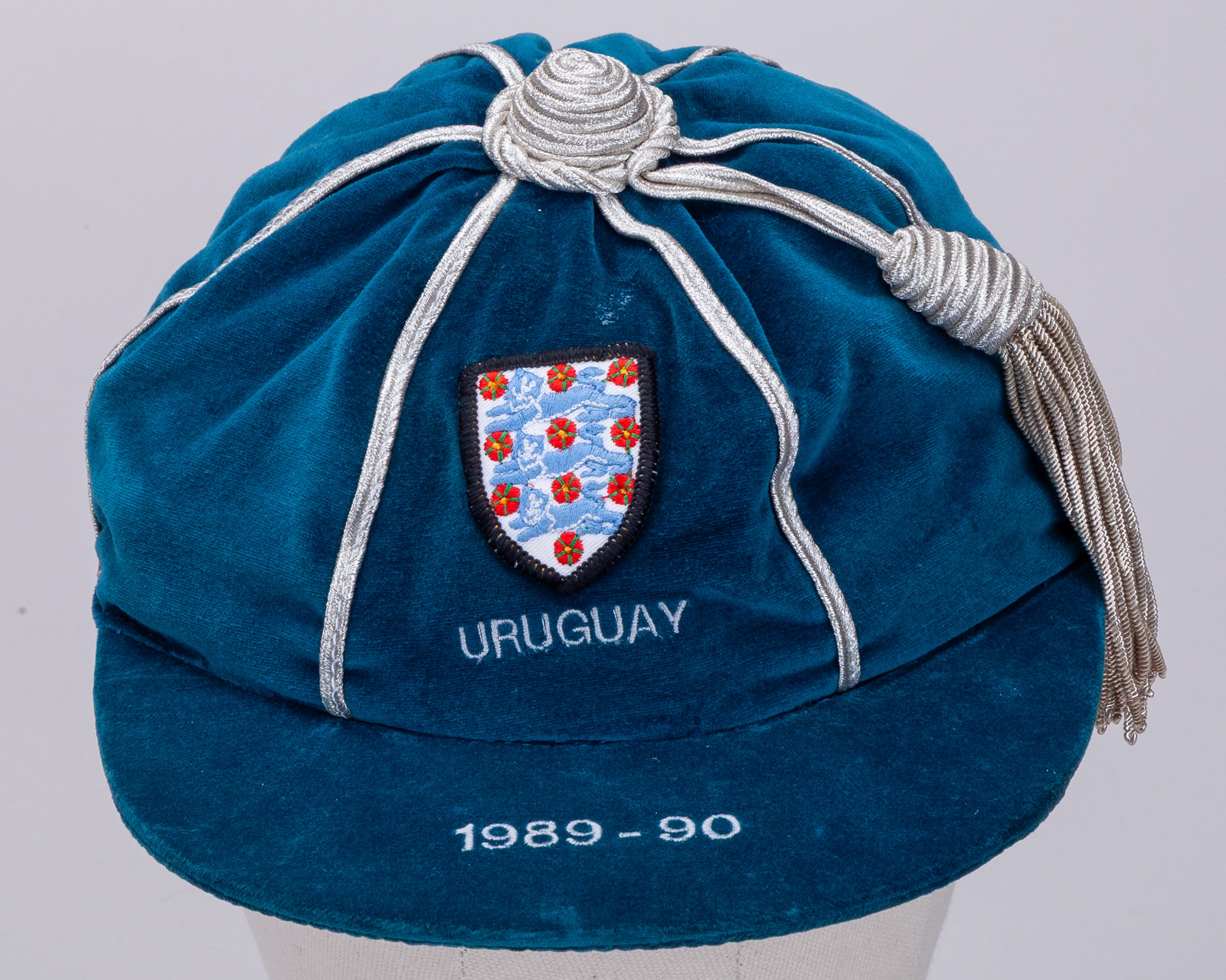 Paul Parker blue England v. Uruguay International cap, 1988-89, blue velvet cap with silver tassel and braiding inscribed URUGUAY, 1988-89, the interior inscribed Paul Parker