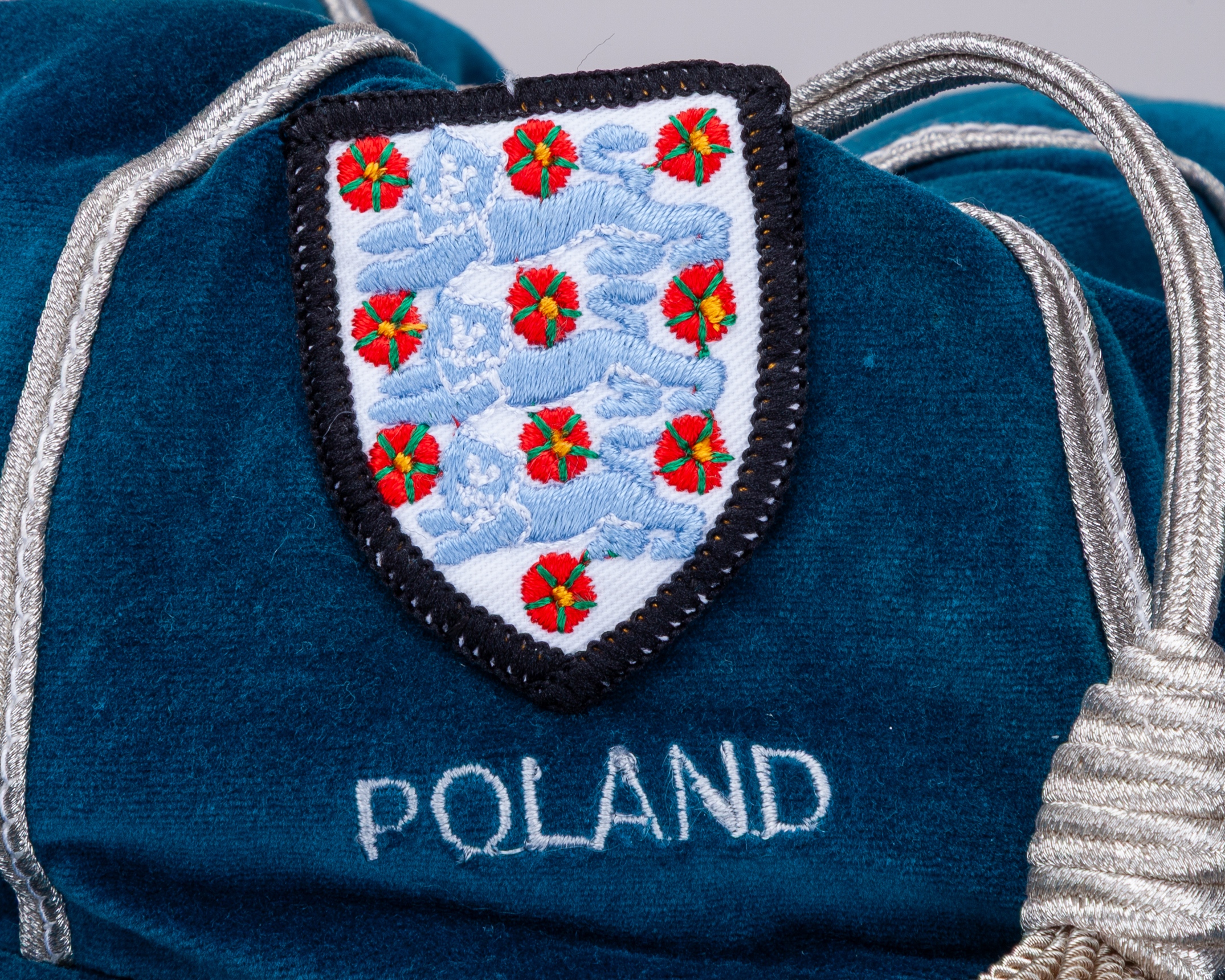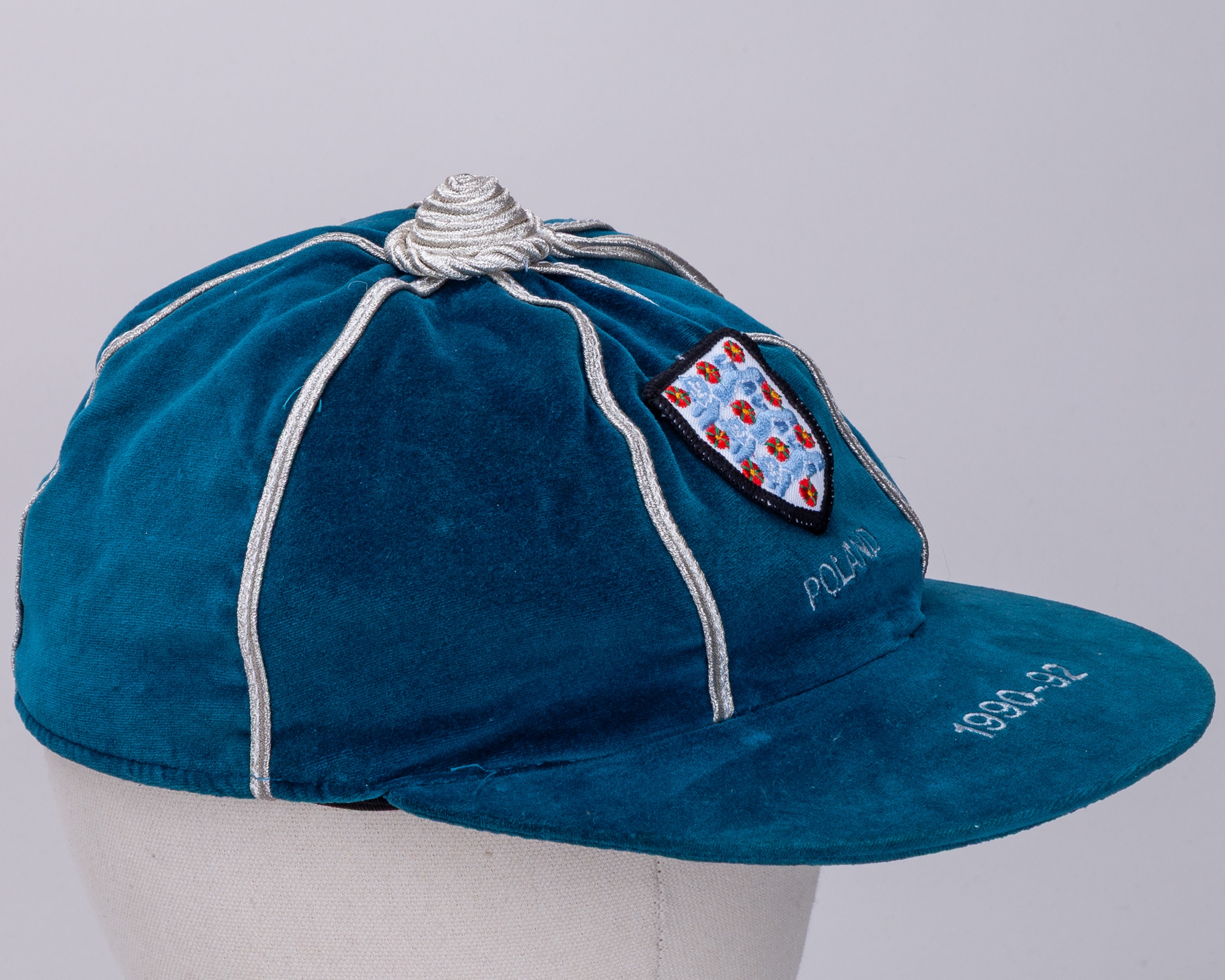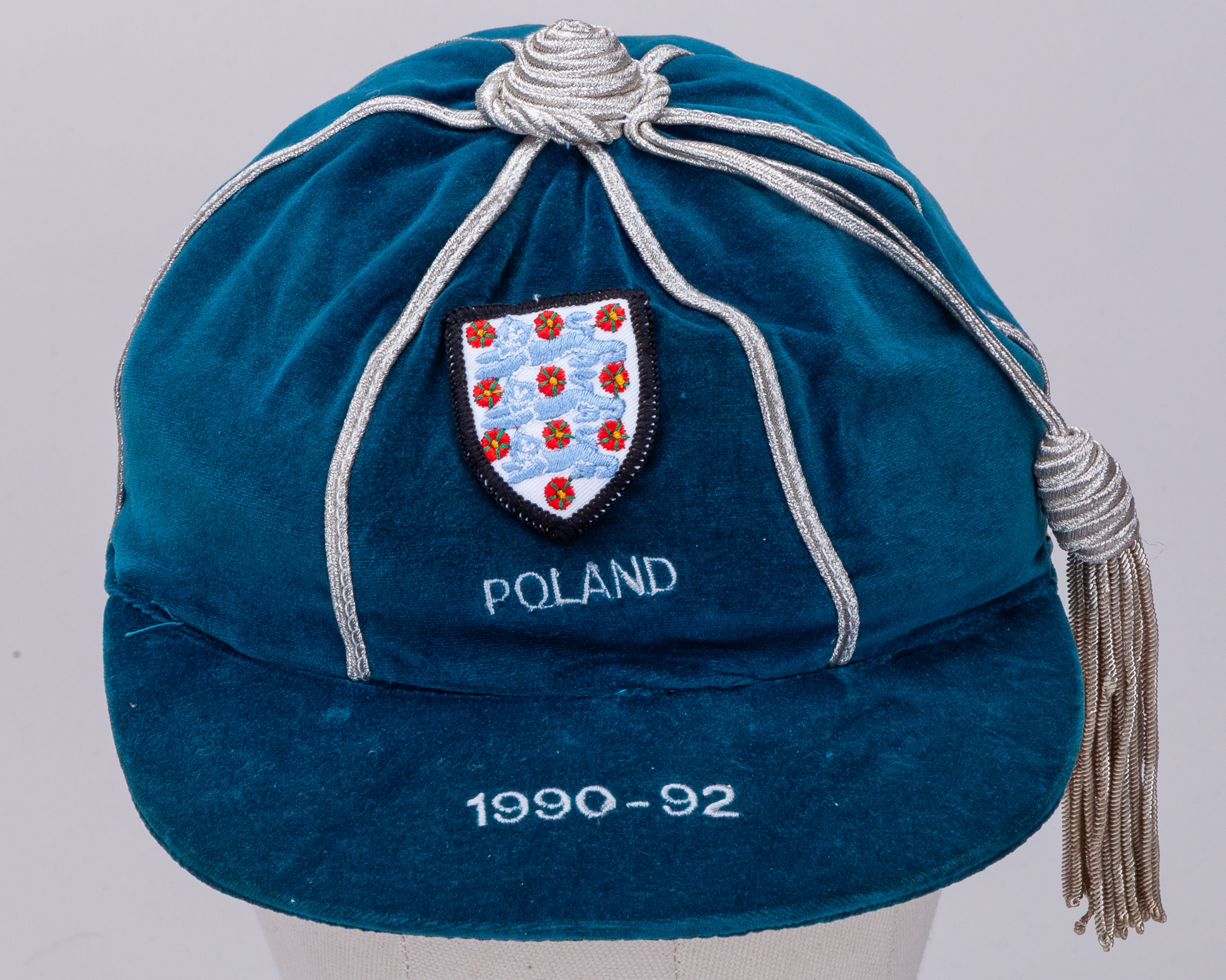 Paul Parker blue England v. Poland International cap, 1990-92, blue velvet cap with silver tassel and braiding inscribed POLAND, 1990-92, the interior inscribed Paul Parker