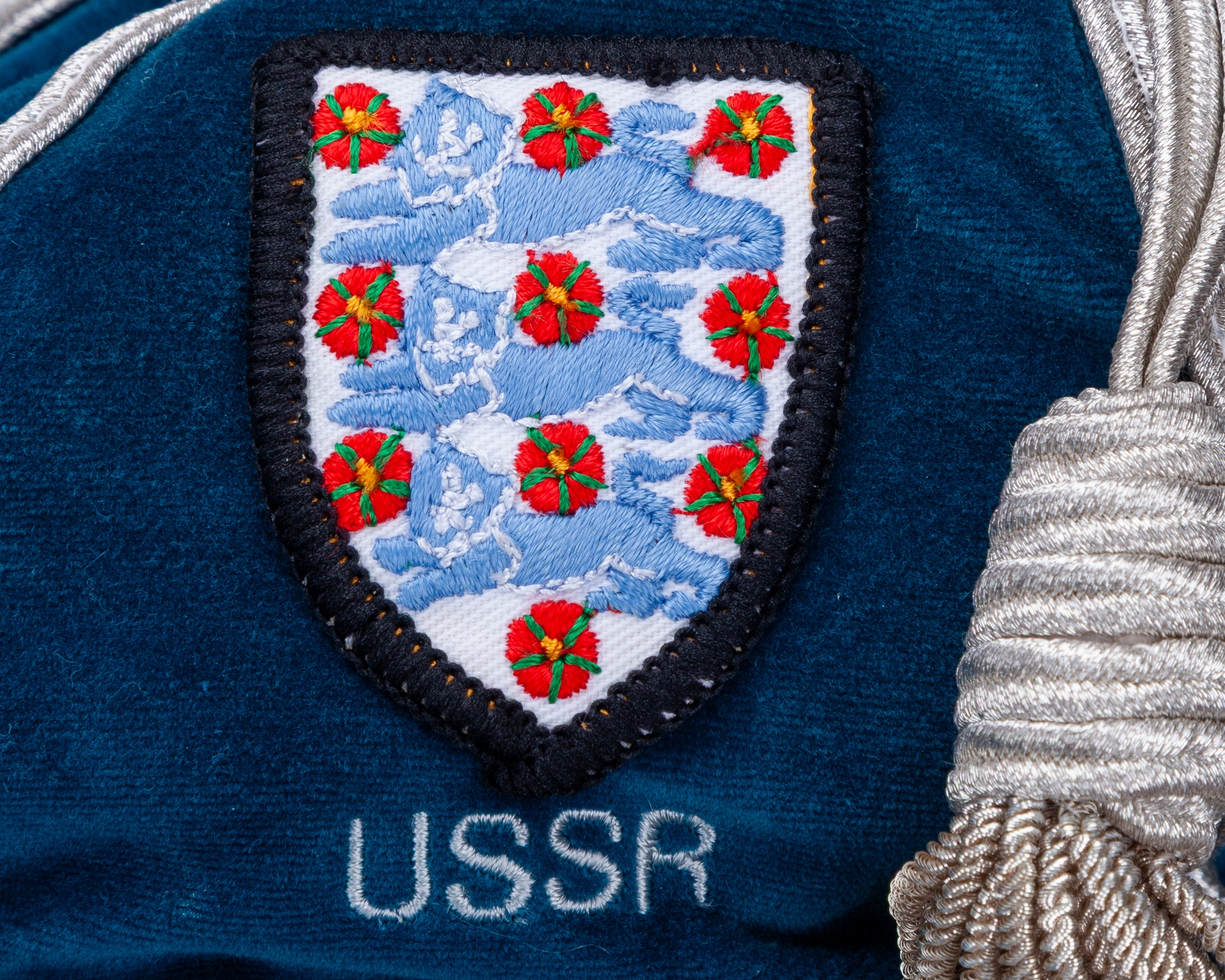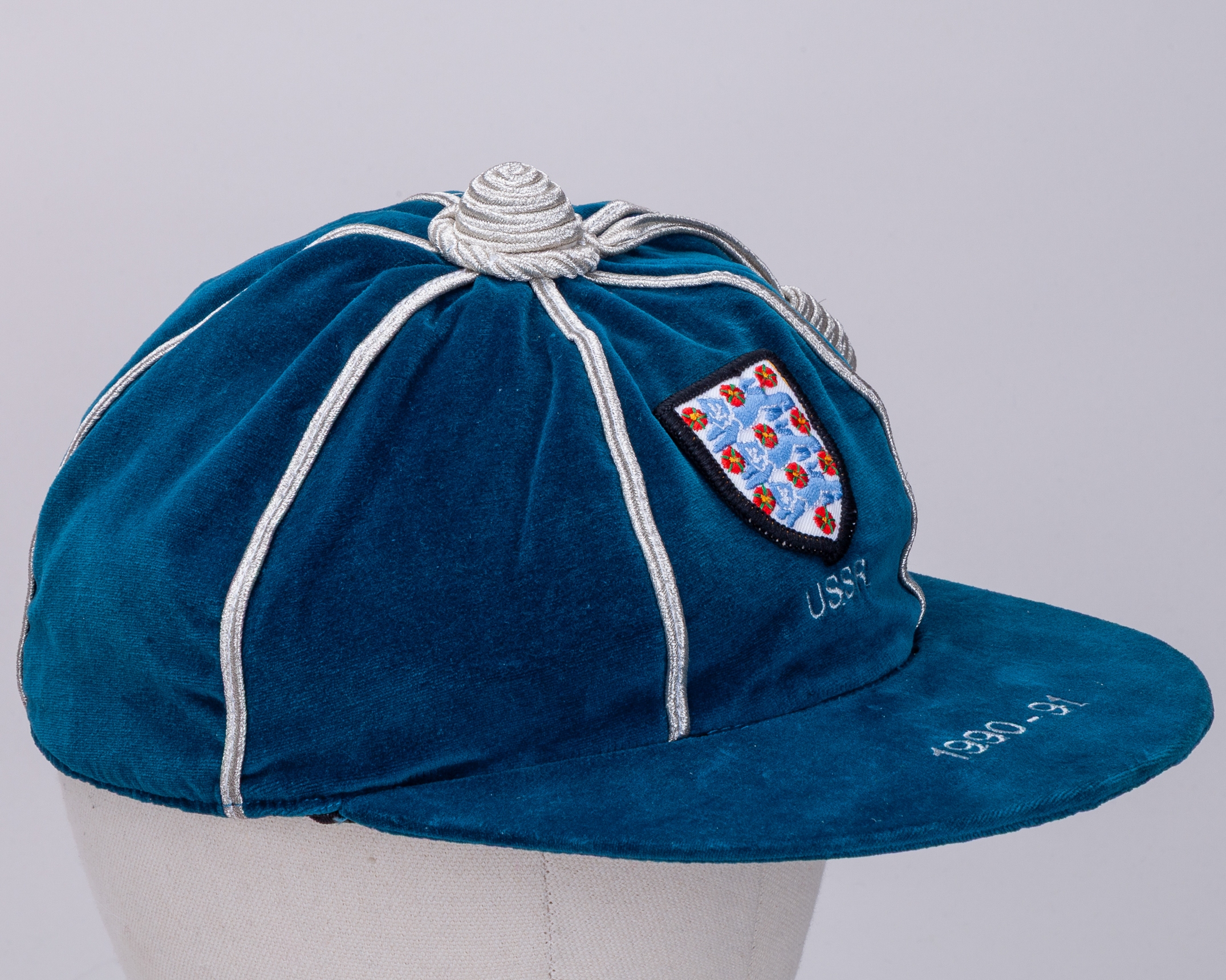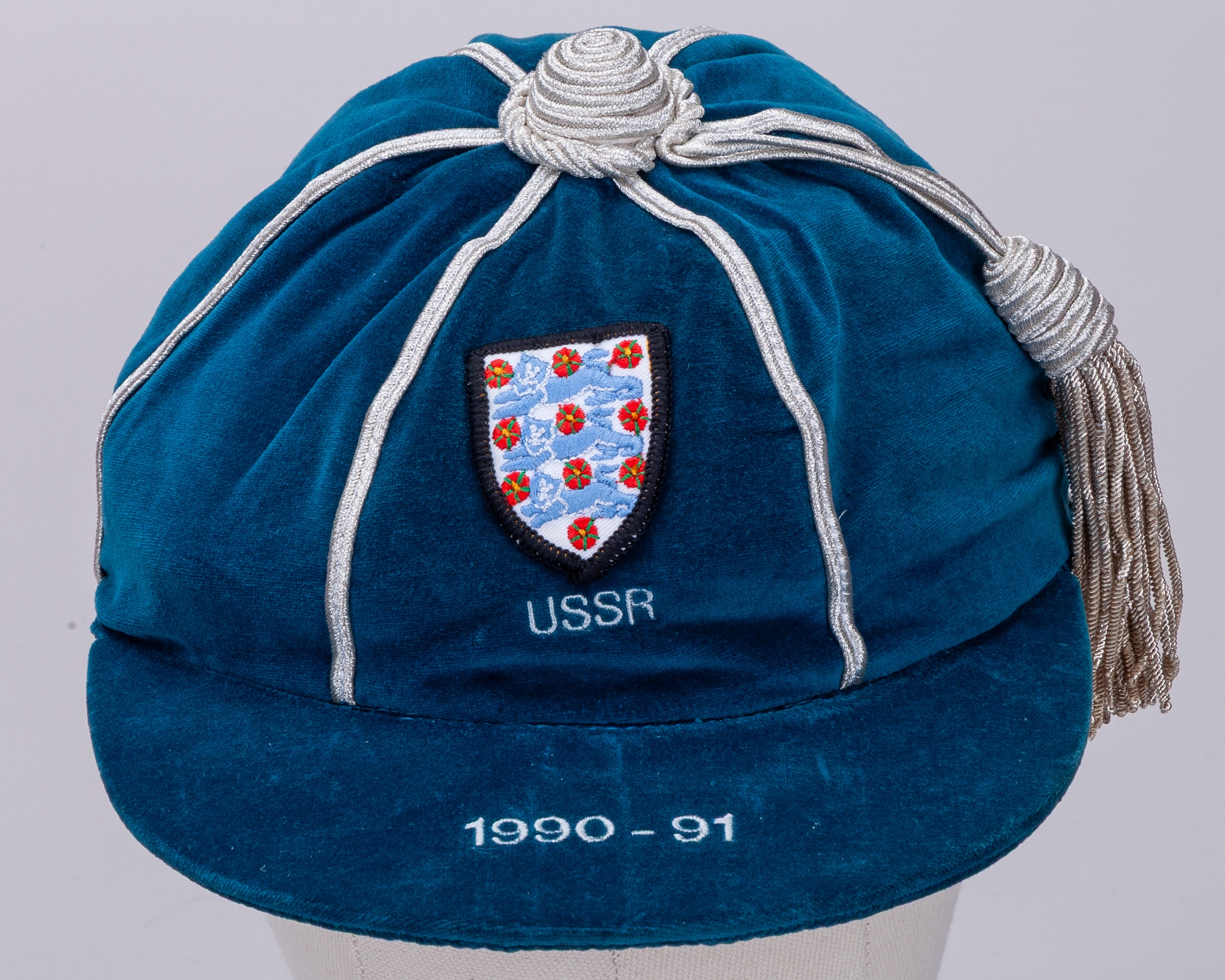 Paul Parker blue England v. USSR International cap, 1990-91, blue velvet cap with silver tassel and braiding inscribed USSR, 1990-91