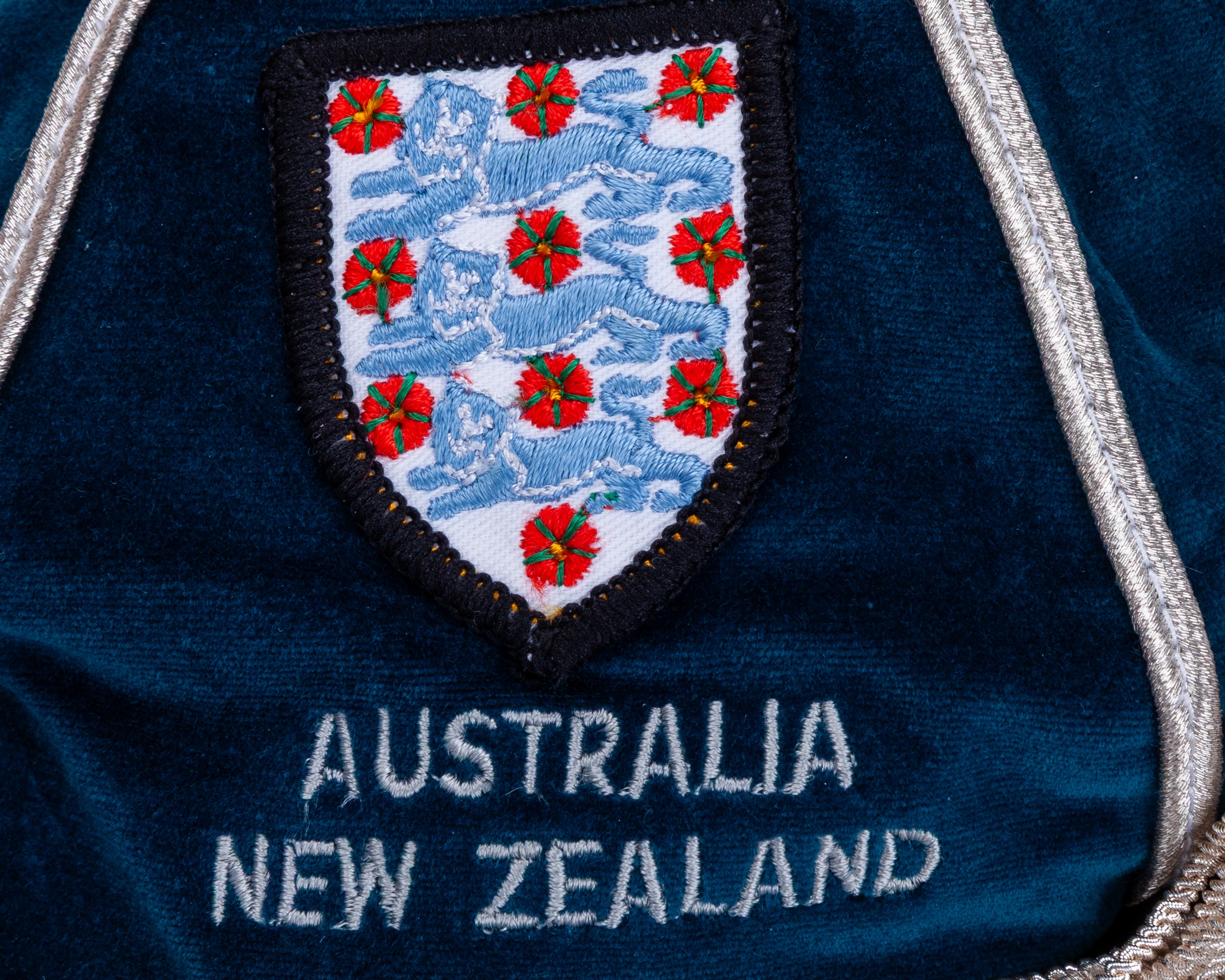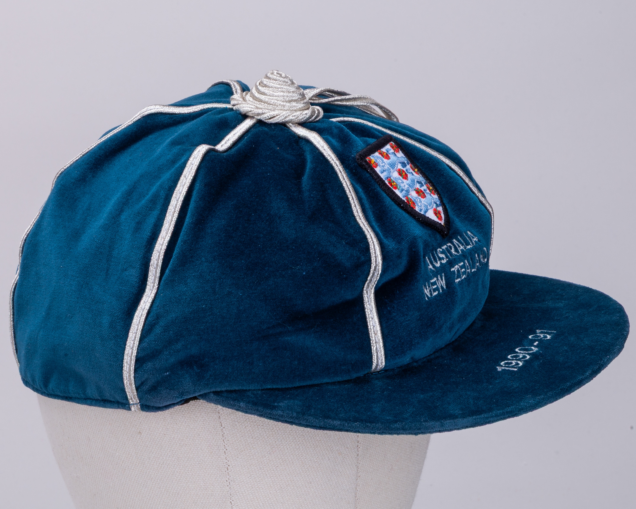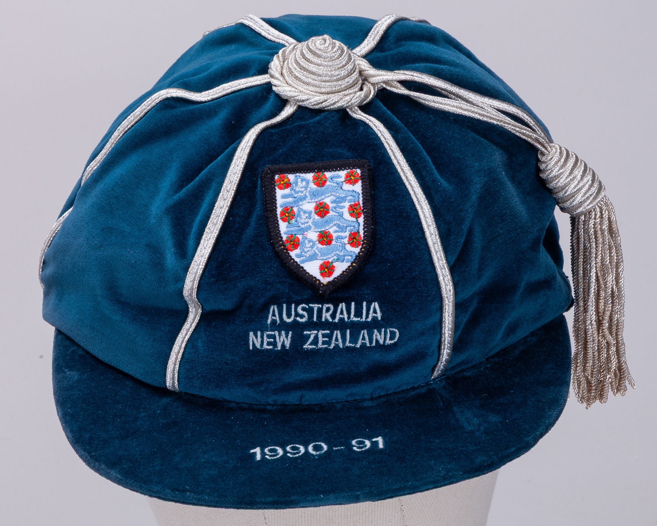 Paul Parker blue England v. New Zealand International cap, 1990-91, blue velvet cap with silver tassel and braiding inscribed AUSTRALIA NEW ZEALAND, 1990-91, the interior inscribed Paul Parker