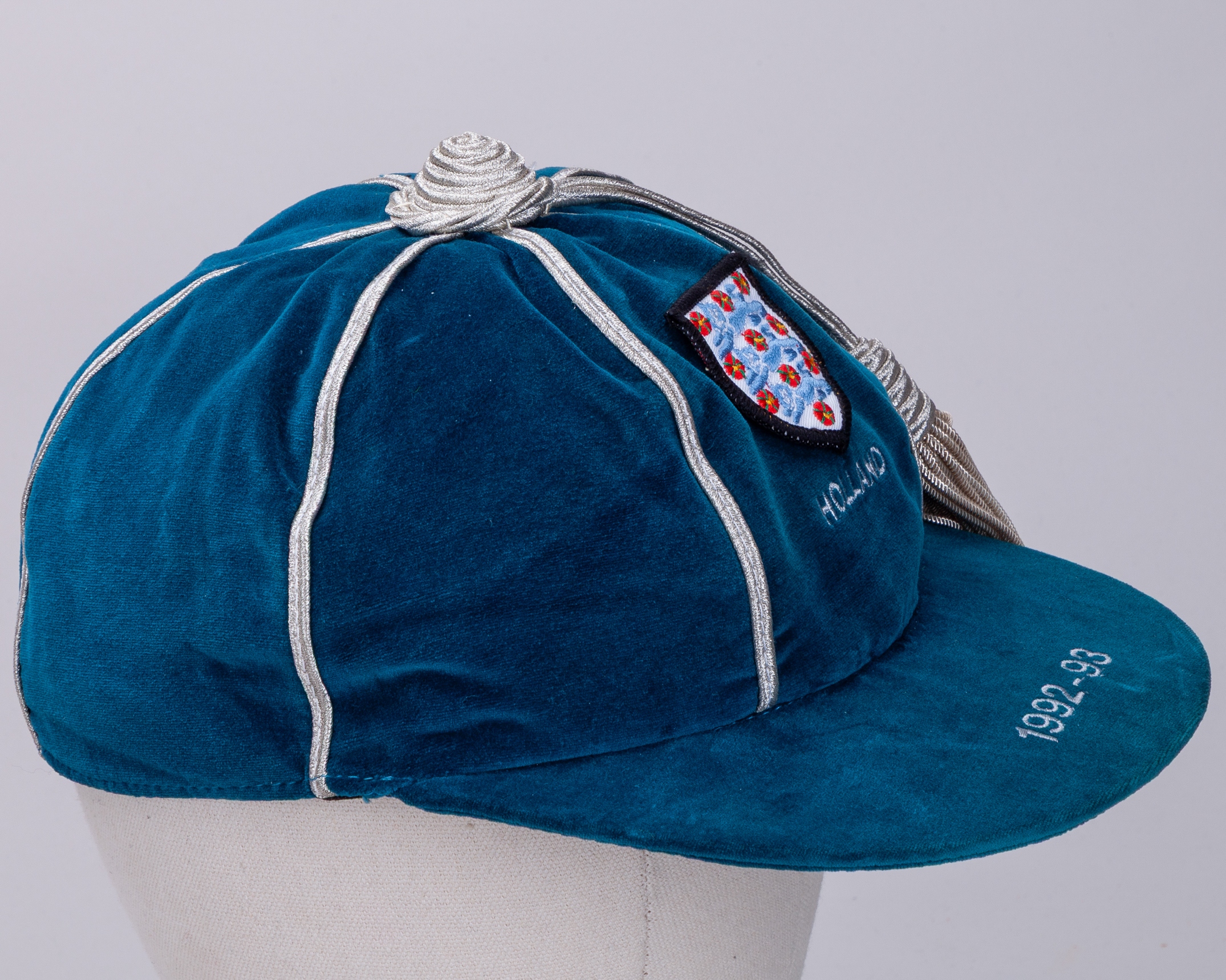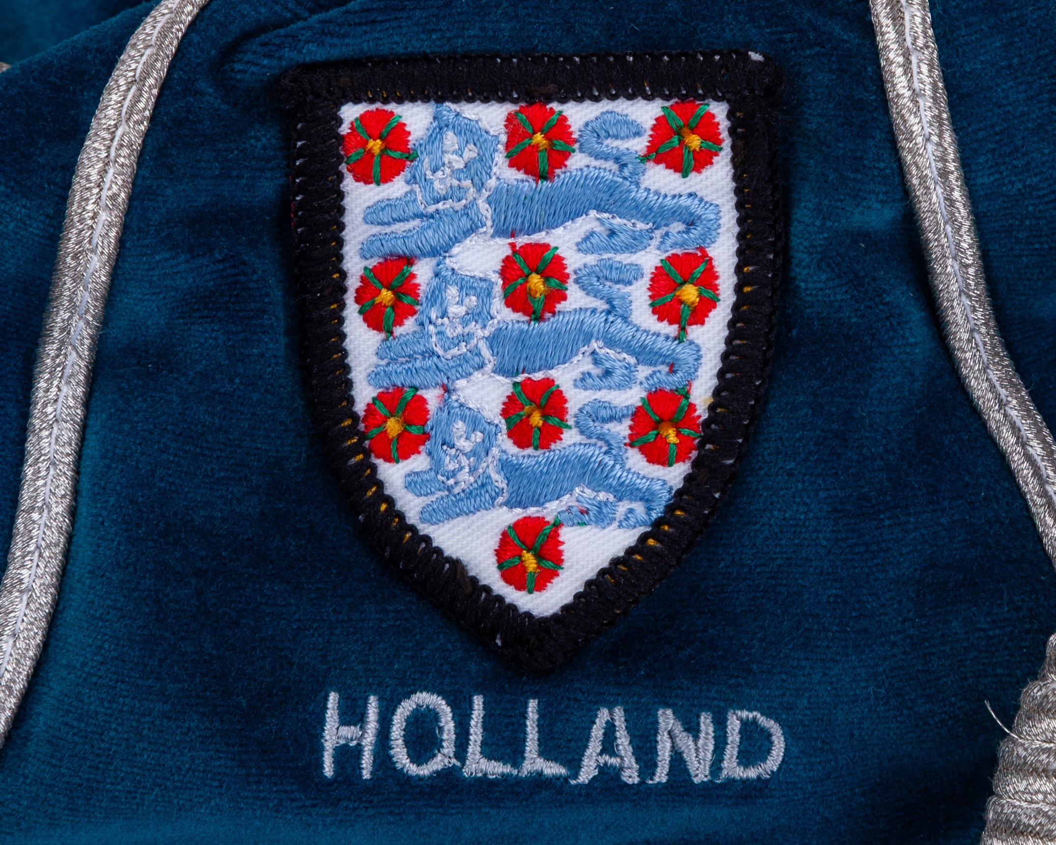 Paul Parker blue England v. Holland International cap, 1992-93, blue velvet cap with silver tassel and braiding inscribed HOLLAND, 1992-93, the interior inscribed Paul Parker