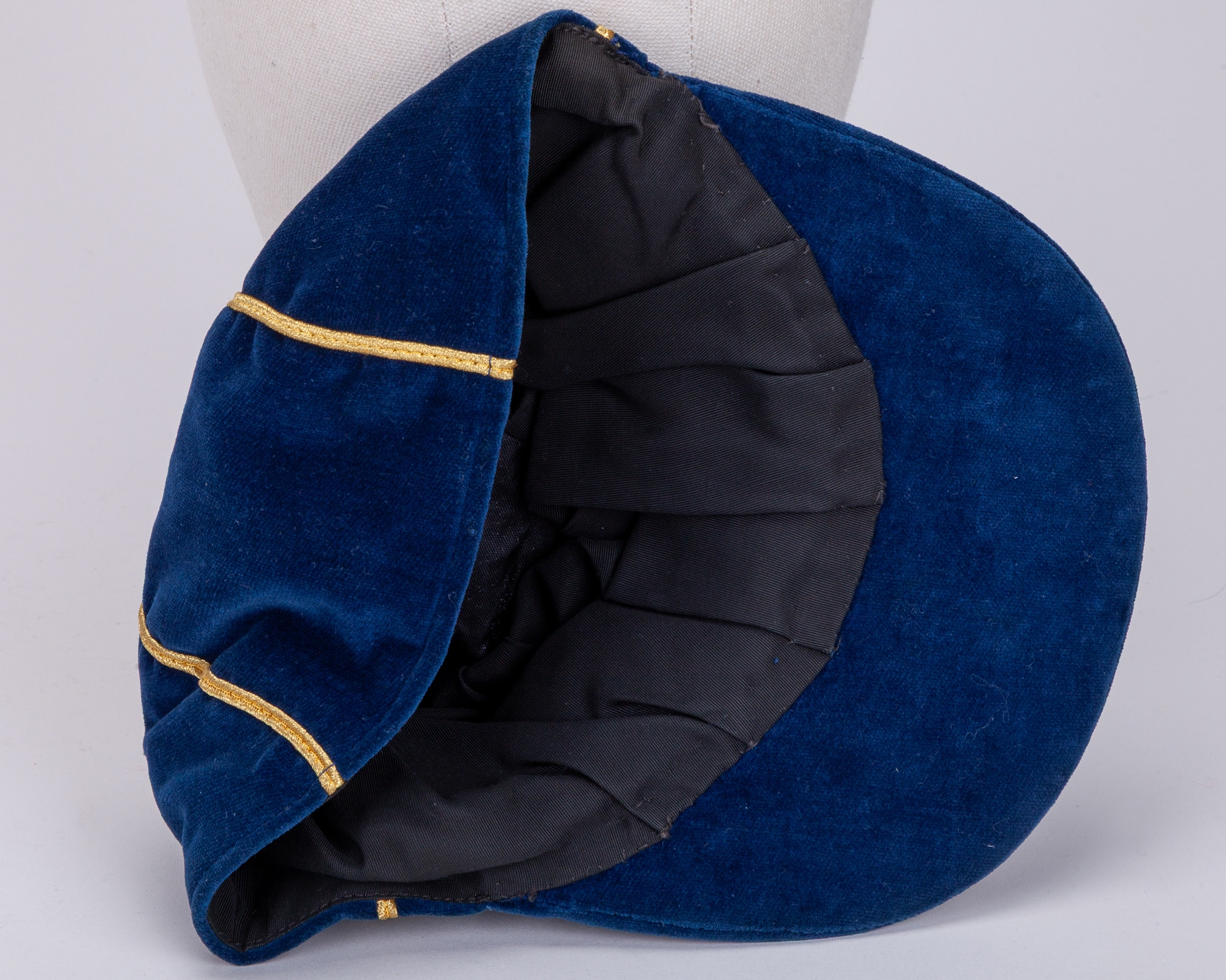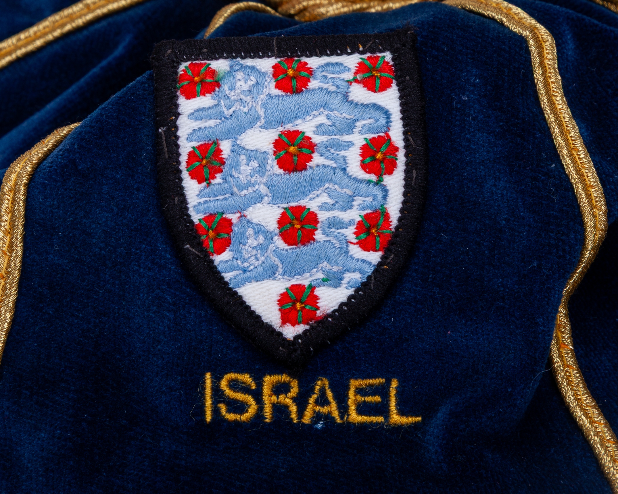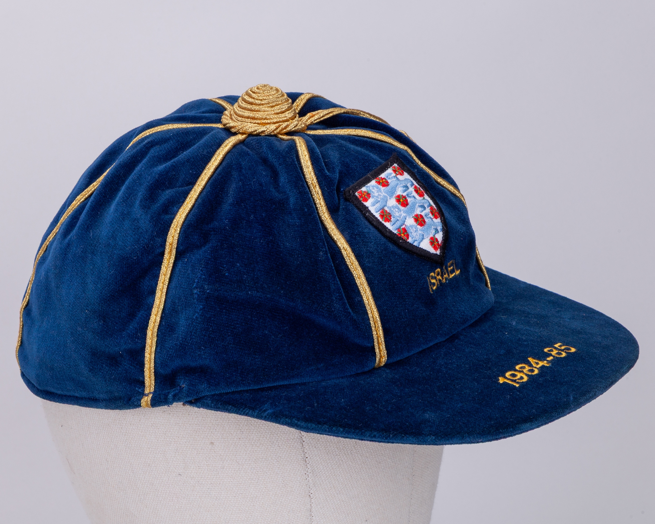 Paul Parker navy blue England v. Israel Under 21 International cap, 1984-85, blue velvet cap with gilt tassel and braiding inscribed ISRAEL 1984-85, the interior inscribed Paul Parker