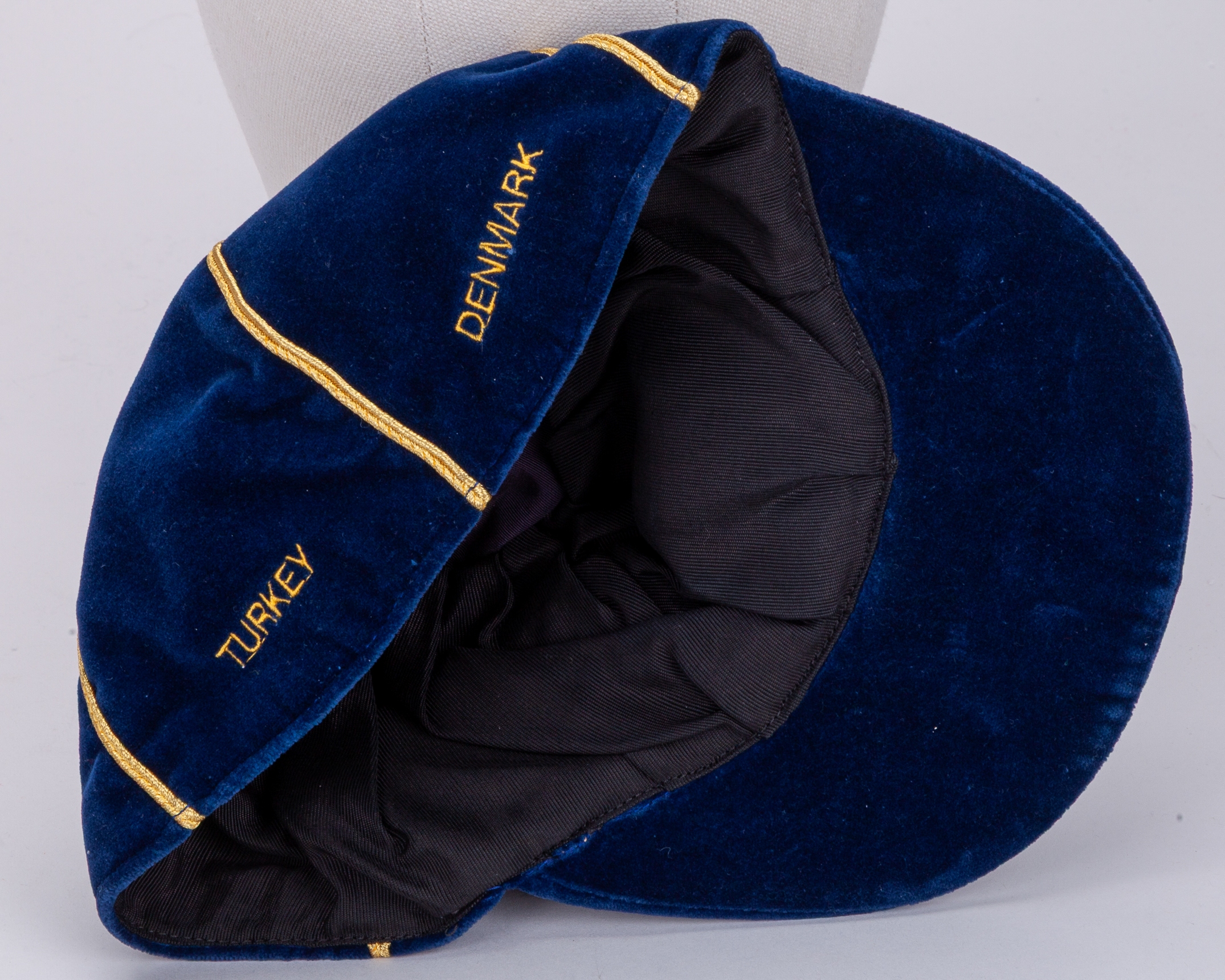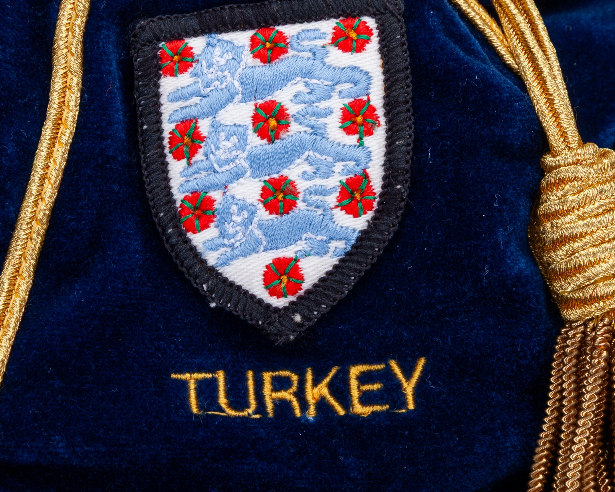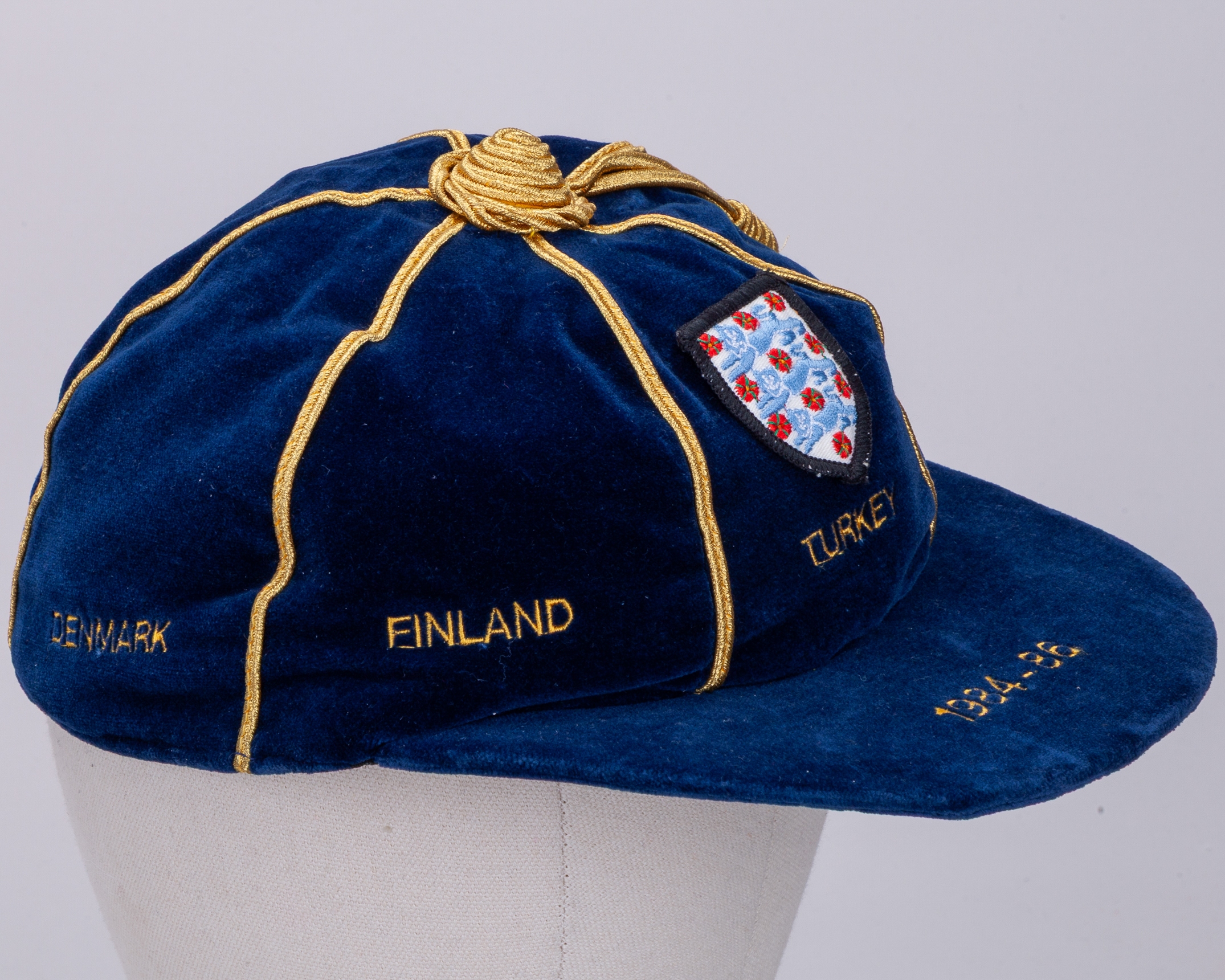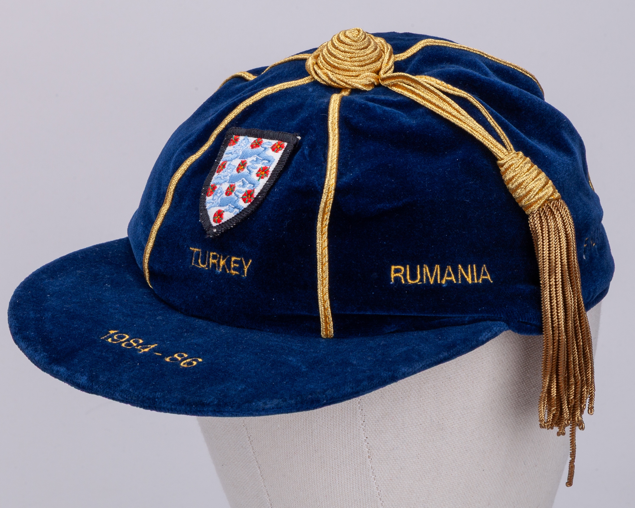 Paul Parker navy blue England v. Finland, Turkey, Romania, Finland, Turkey and Denmark Under 21 International cap, 1984-86, blue velvet cap with gilt tassel and braiding inscribed FINLAND, TURKEY, RUMANIA, FINLAND, TURKEY, DENMARK 1984-86, the interior inscribed in ink parker