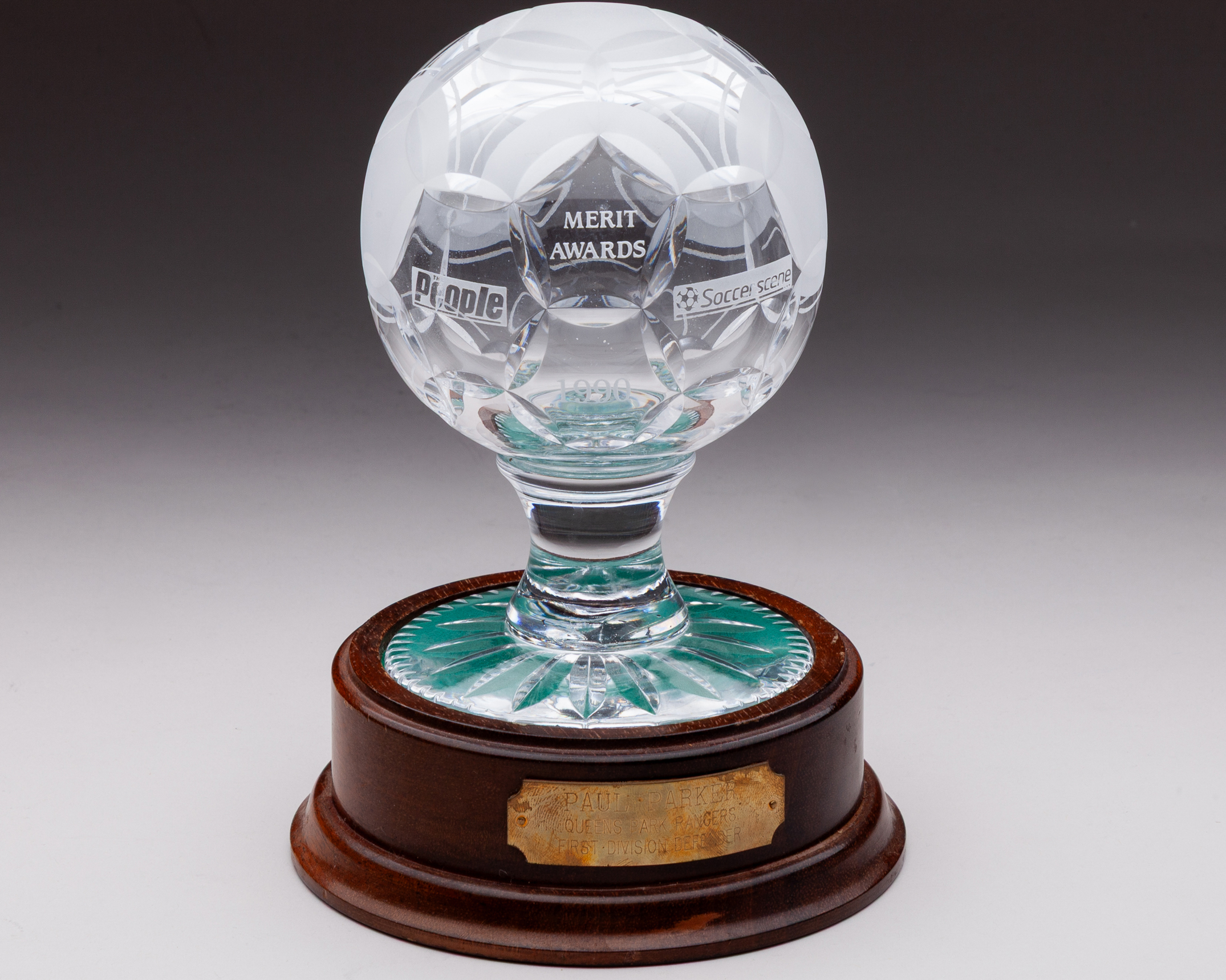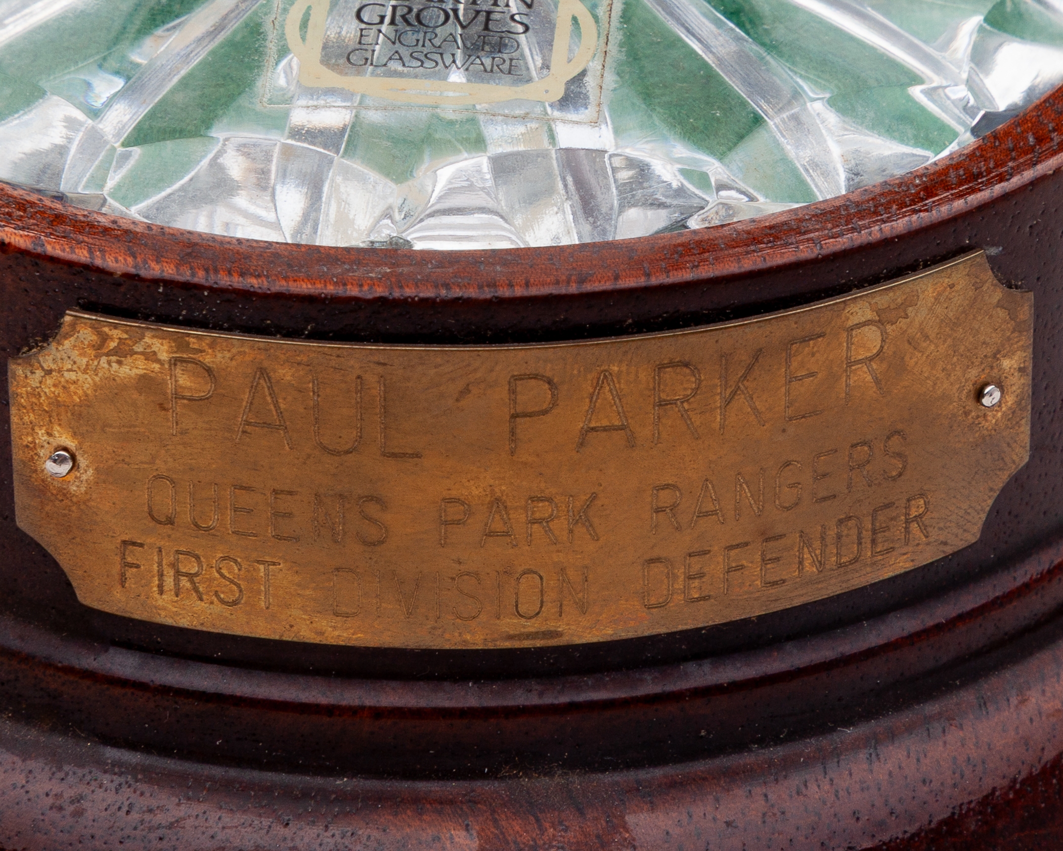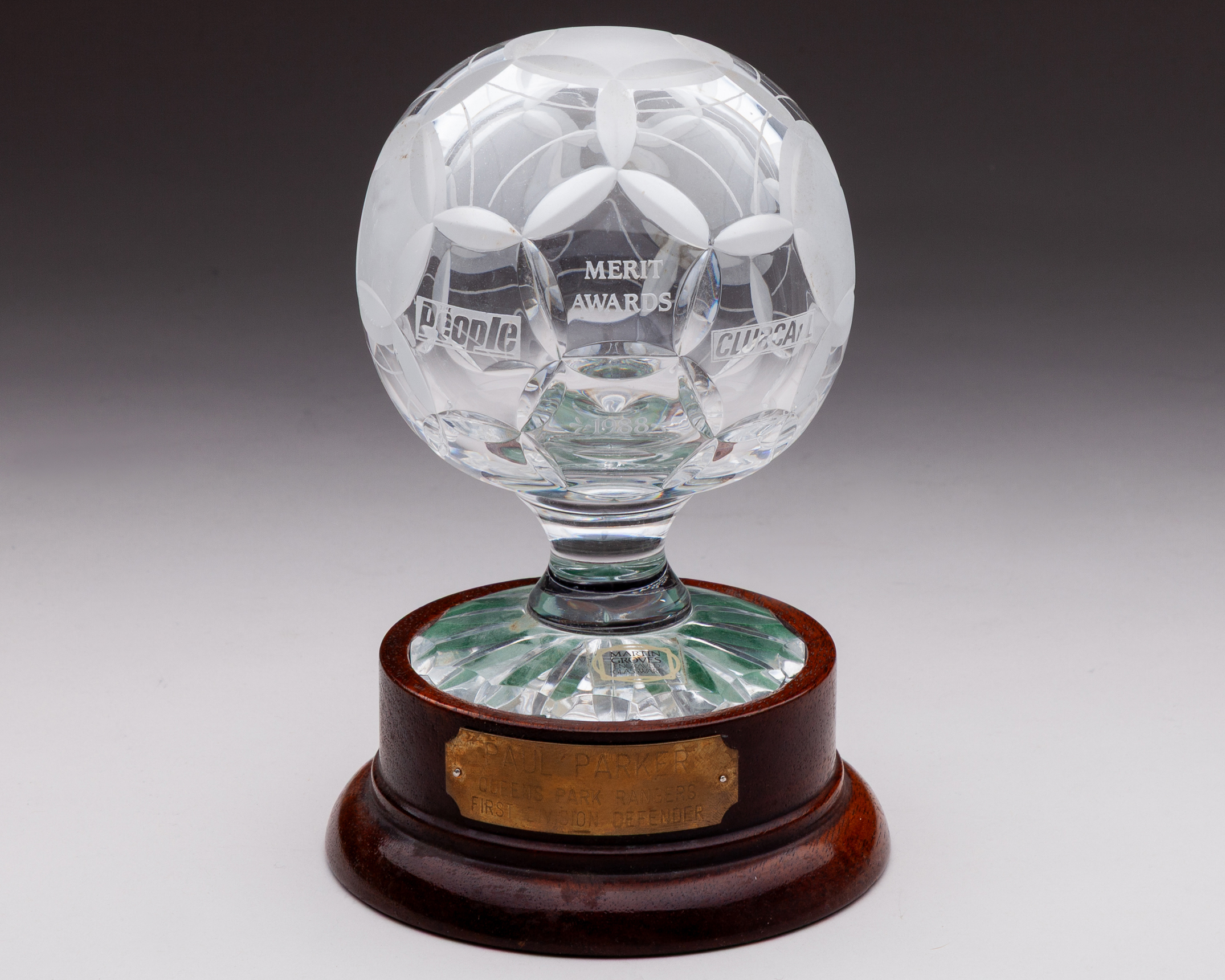 Paul Parker two glass Queen's Park Rangers awards, both modelled as footballs , one etches MERIT AWARDS THE PEOPLE CLUBCALL 1988, on circular wooden based inscribed PAUL PARKER QUEENS PARK RANGERS, FIRST DIVSION DEFENDER, the other similarly etched and inscribed Soccerscene, 1990, 20cm high and smaller (2)