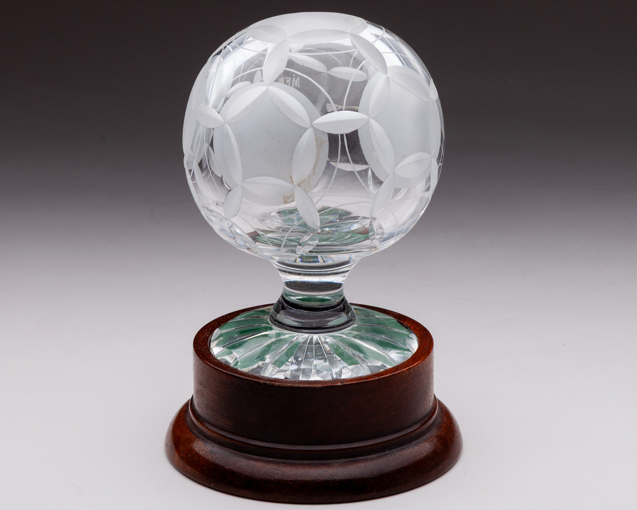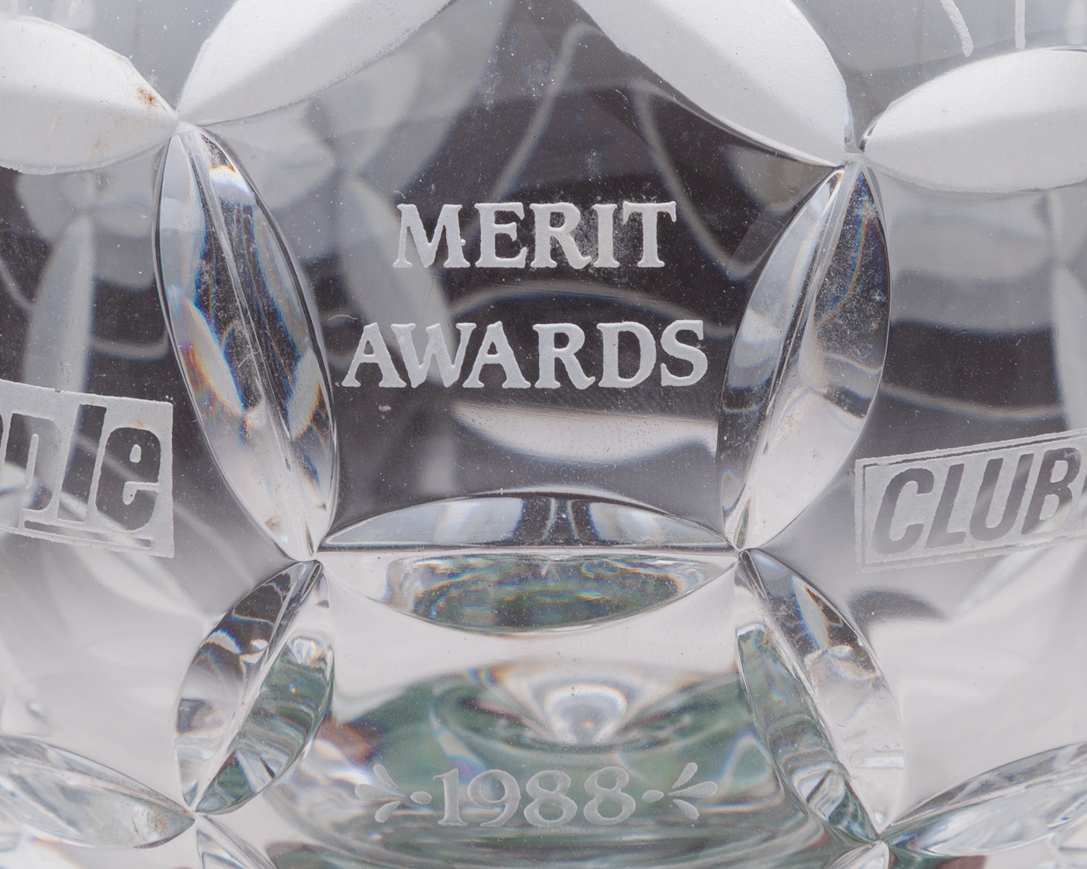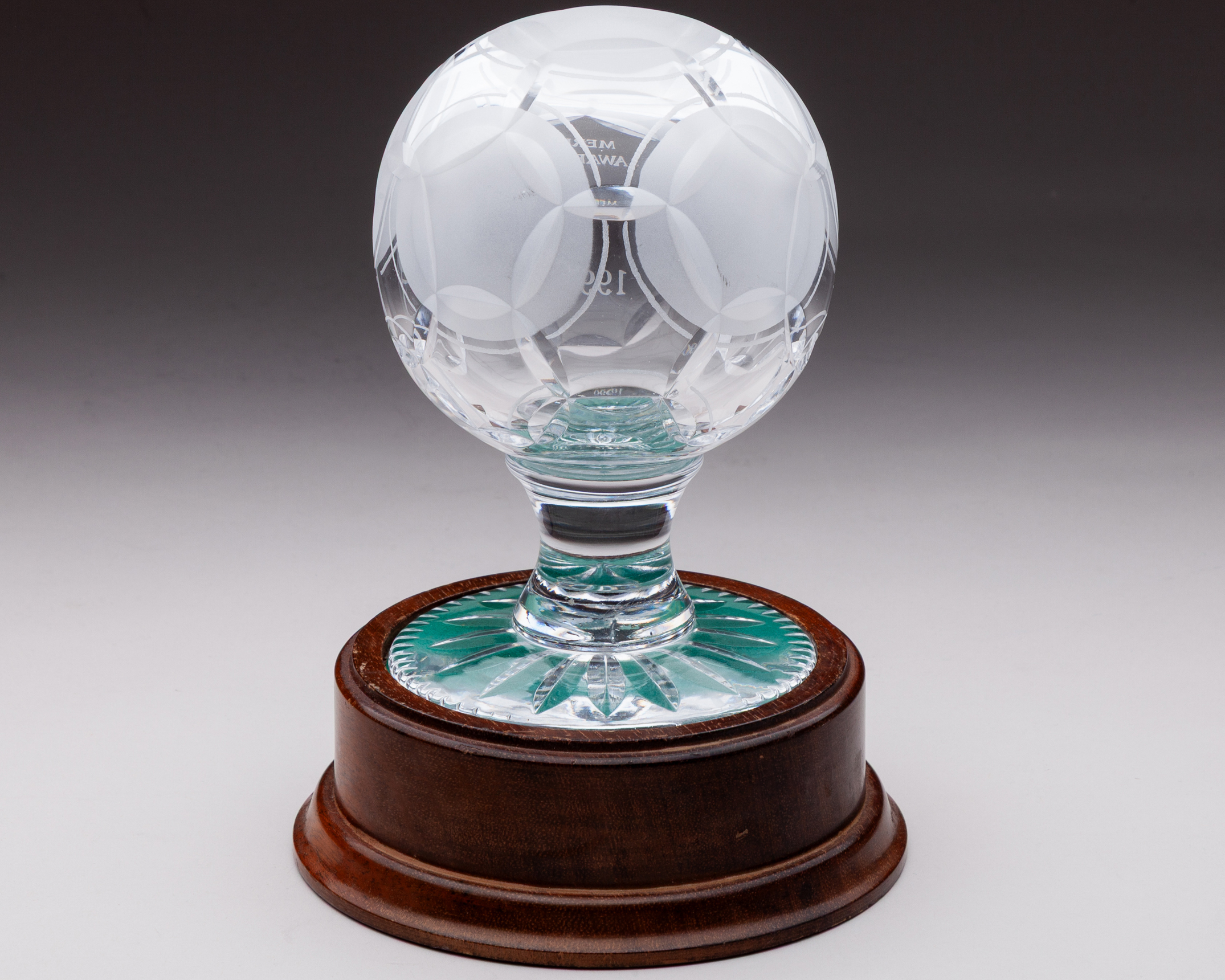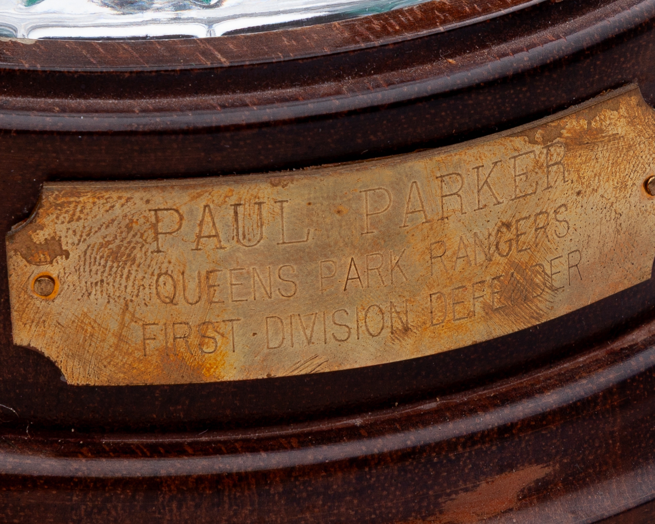 Paul Parker two glass Queen's Park Rangers awards, both modelled as footballs , one etches MERIT AWARDS THE PEOPLE CLUBCALL 1988, on circular wooden based inscribed PAUL PARKER QUEENS PARK RANGERS, FIRST DIVSION DEFENDER, the other similarly etched and inscribed Soccerscene, 1990, 20cm high and smaller (2)