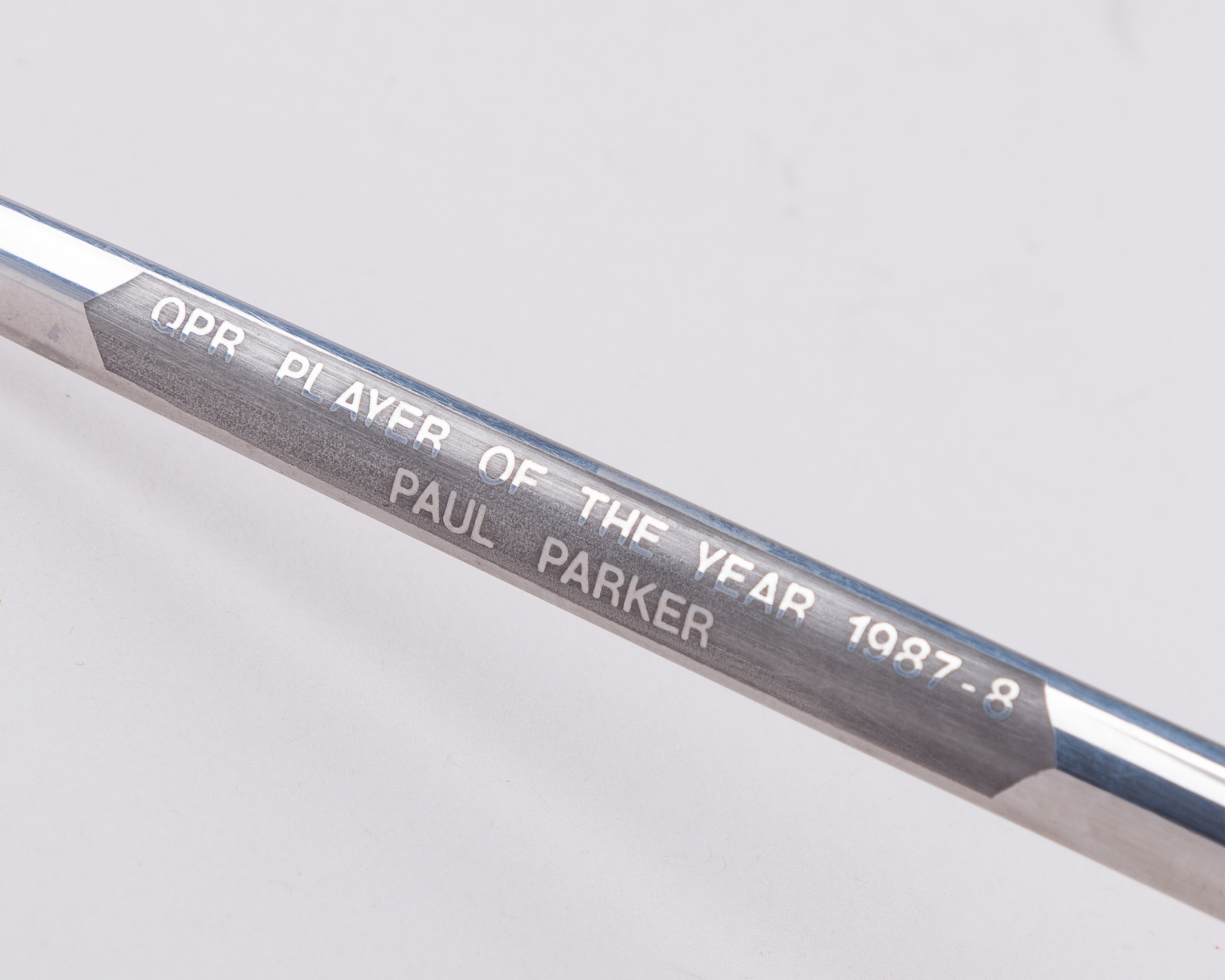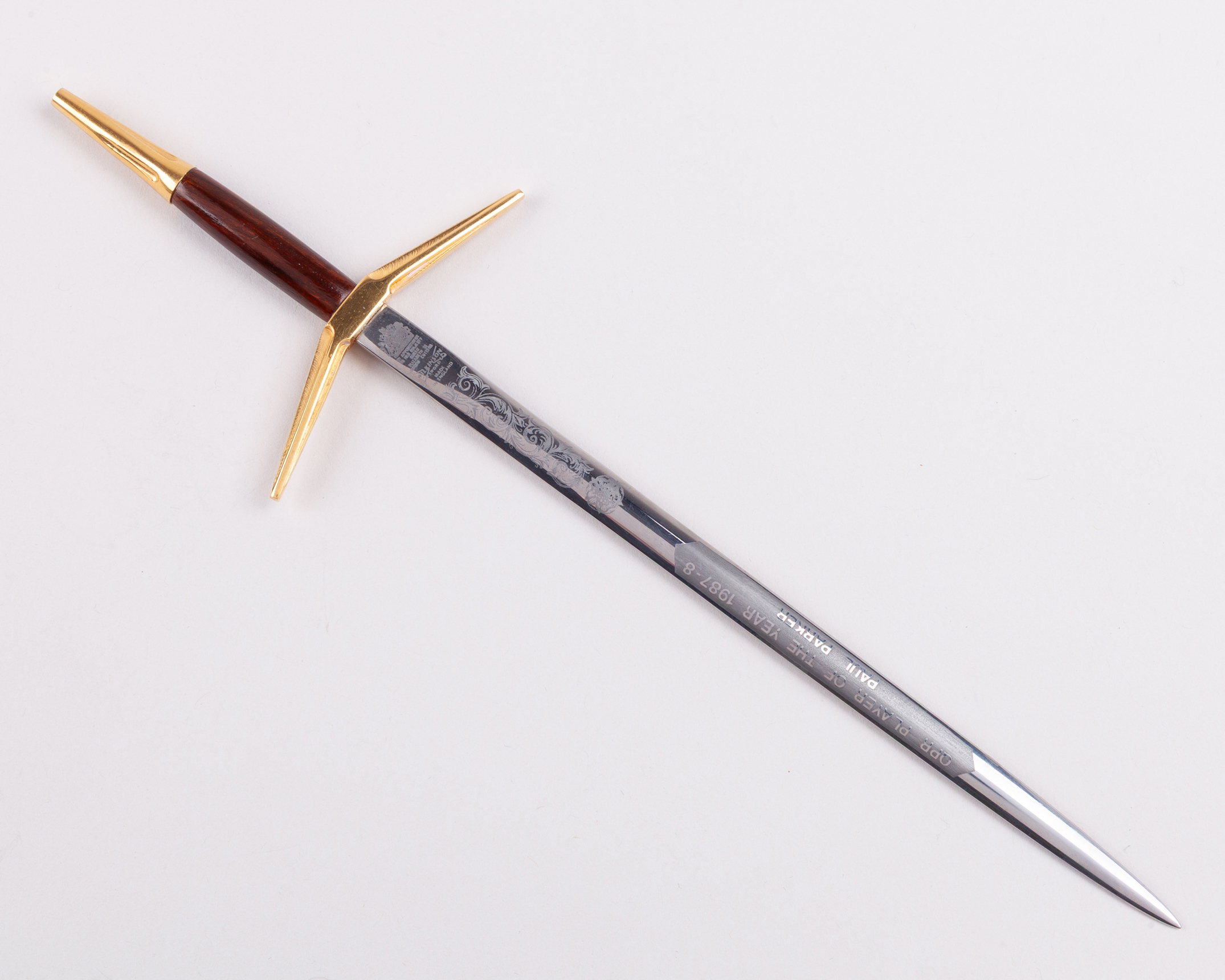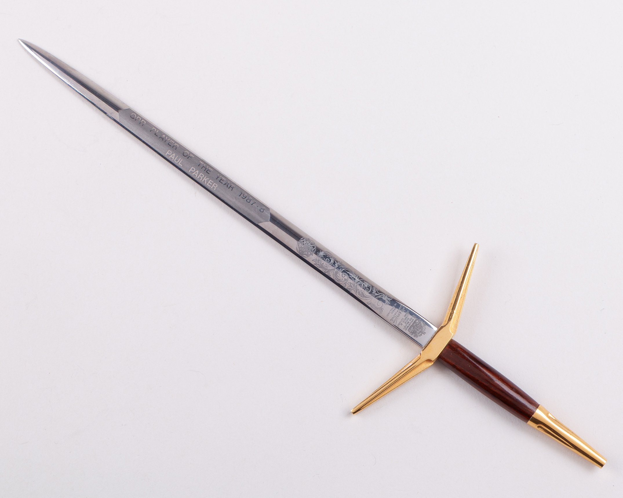 Paul Parker Queen's Park Rangers Player of the year award, 1987-8, formed as a miniature sword by Wilkinson, the blade inscribed QPR PLAYER OF THE YEAR 1987-8, PAUL PARKER, 24cm long