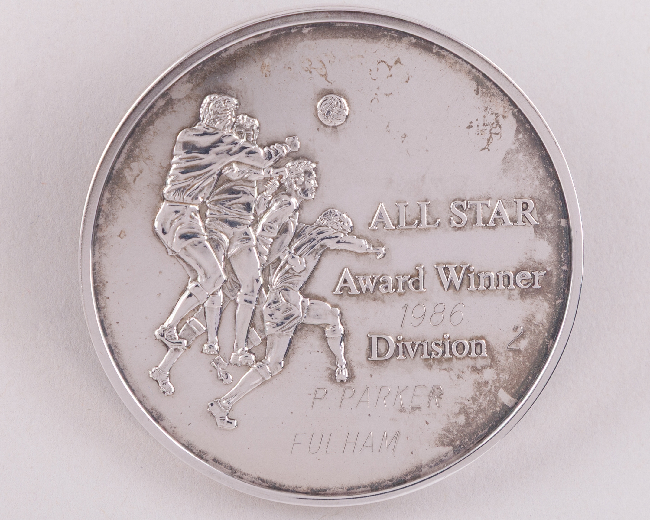 Paul Parker white-metal PFA All Star medal, the obverse inscribed PROFESSIONAL FOOTBALLERS ASSOCIATION, the reverse inscribed ALL STAR Award Winner 1986 Division 2, P. Parker Fulham, in original fitted case
