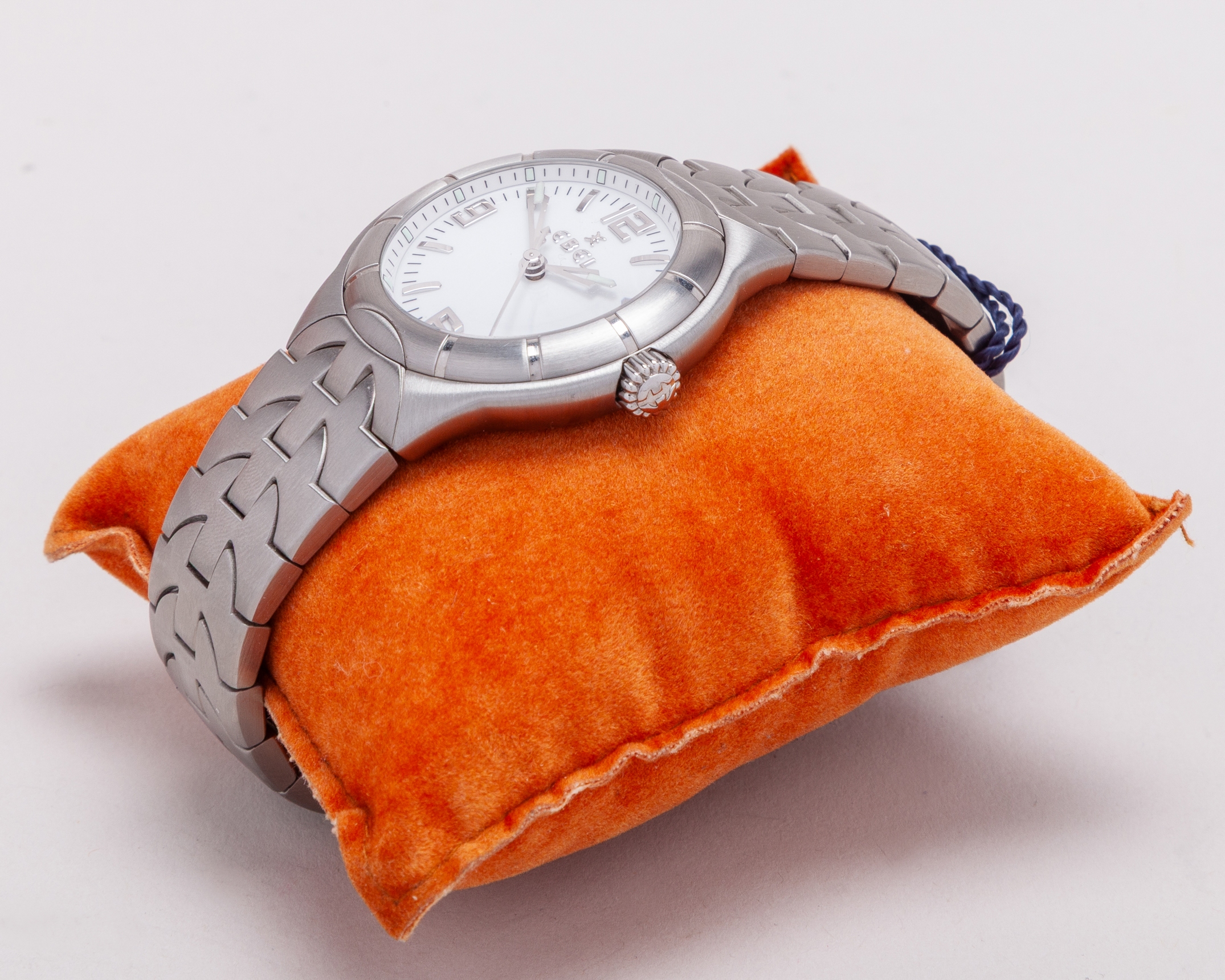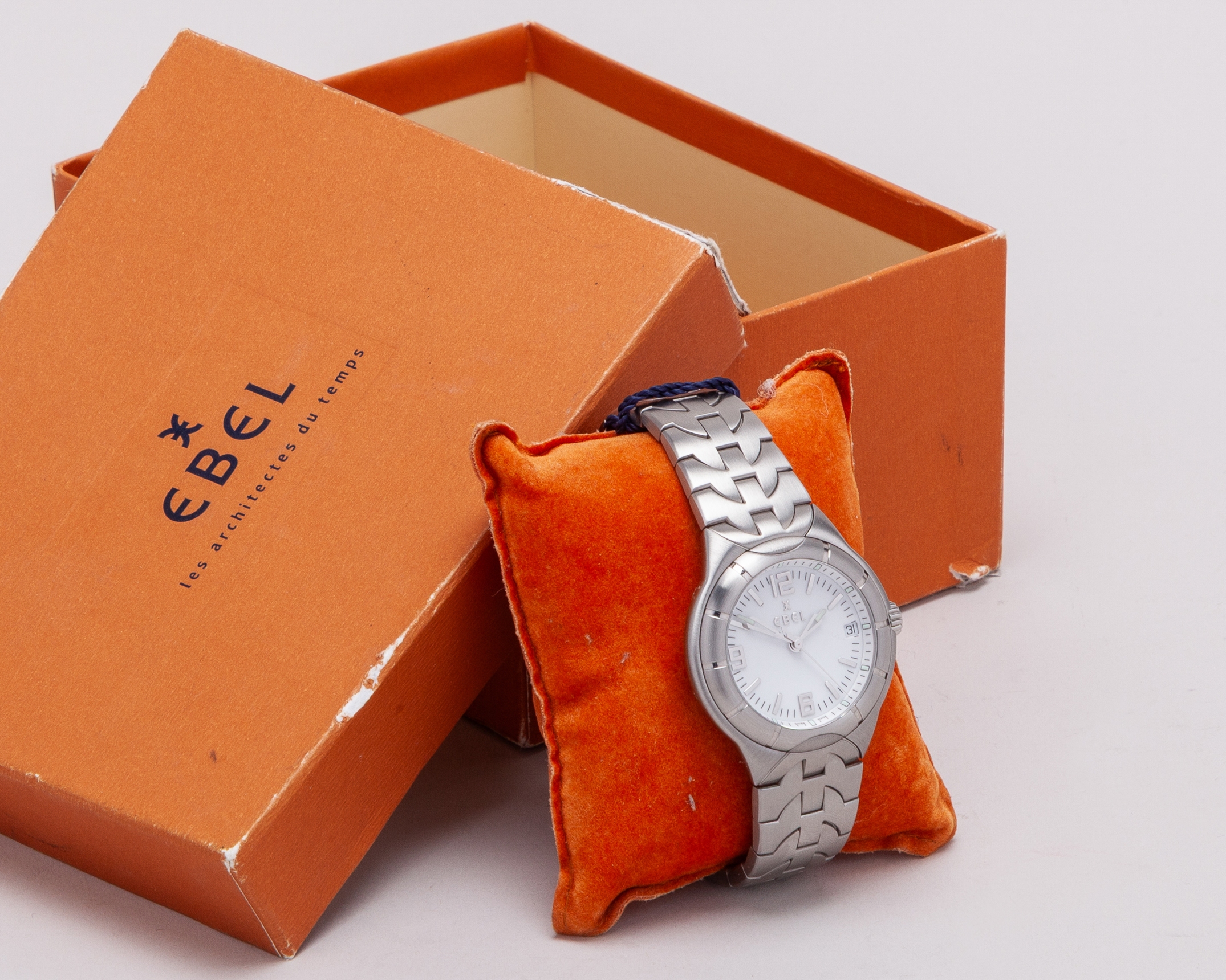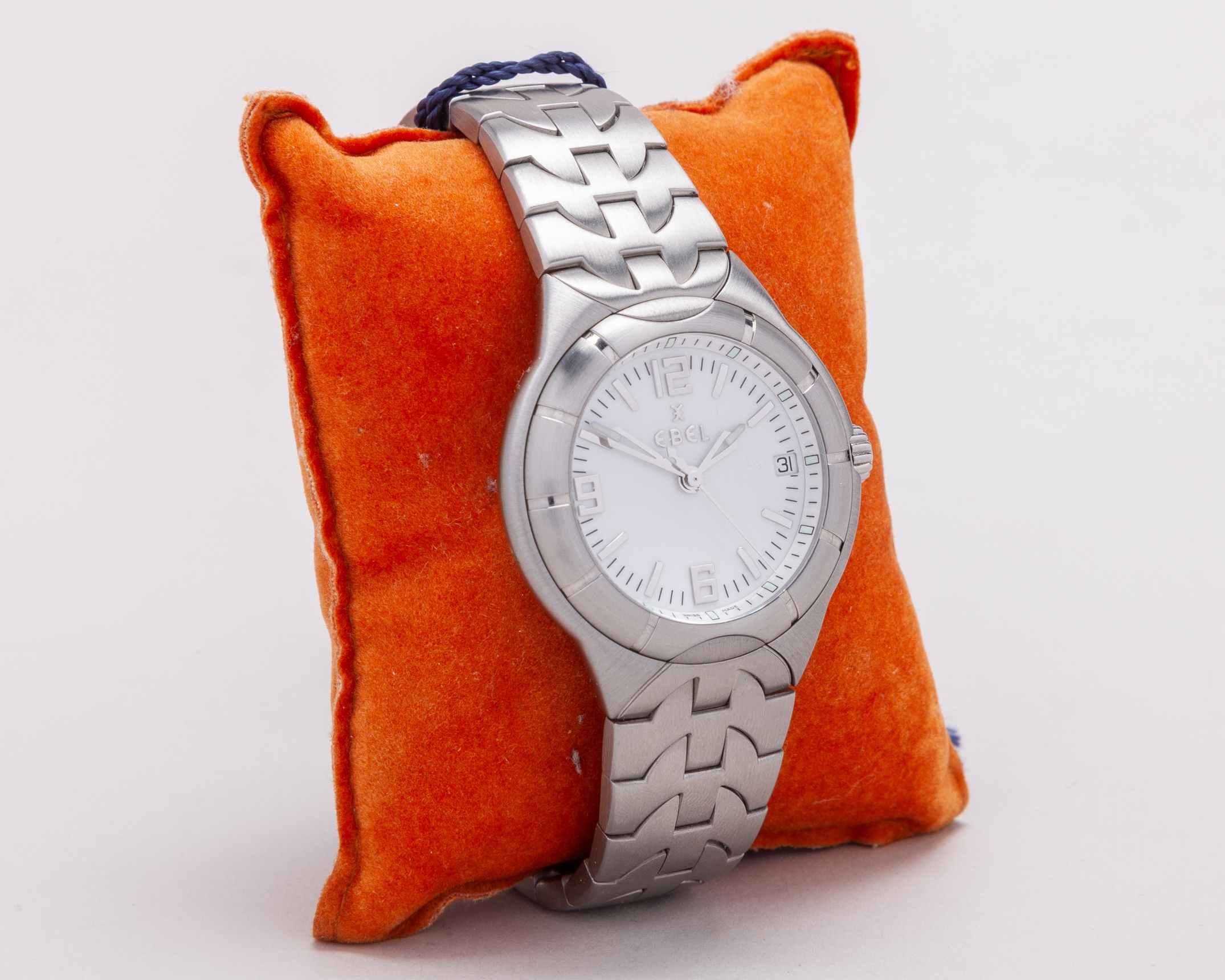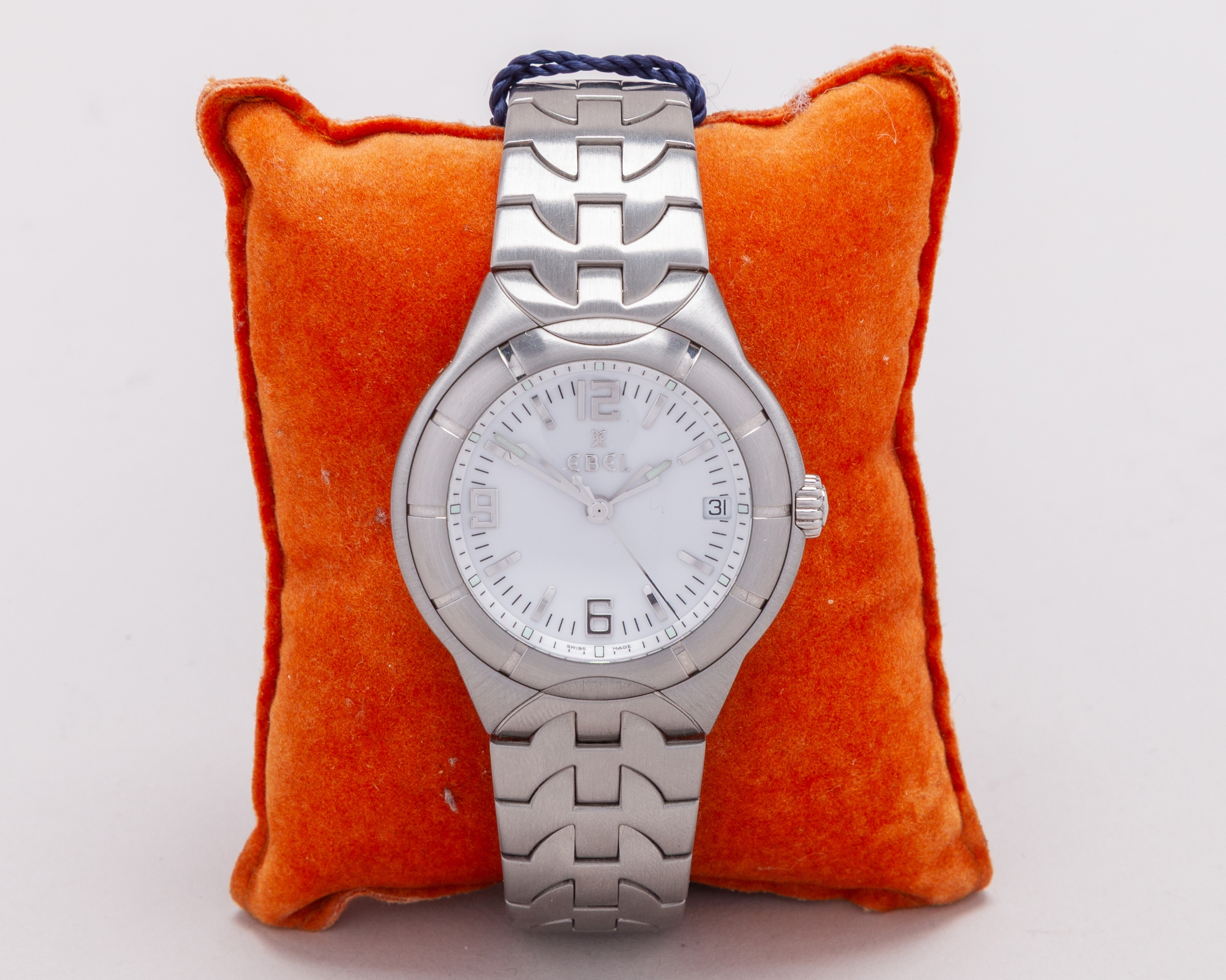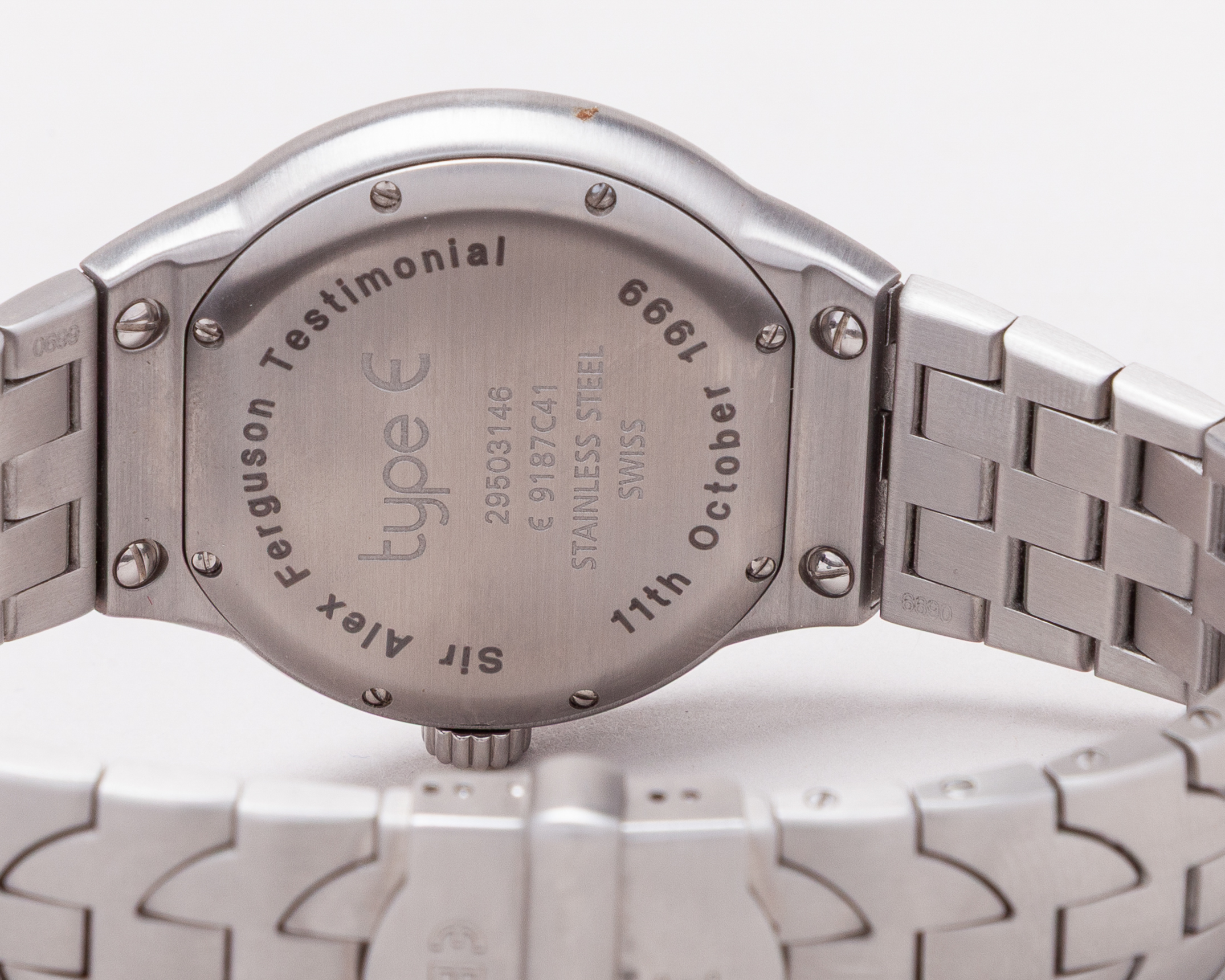 Paul Parker - Sir Alex Ferguson Testimonial Match presentation wristwatch, an Ebel gentleman's stainless steel Type E quartz wristwatch, 38mm. diameter, the circular case inscribed SIR ALEX FERGUSON TESTIMONIAL. 11th OCTOBER 1999, white dial, Arabic and baton numerals, centre seconds and date aperture, quartz movement, Type E bracelet, in original case and paper box, with booklet