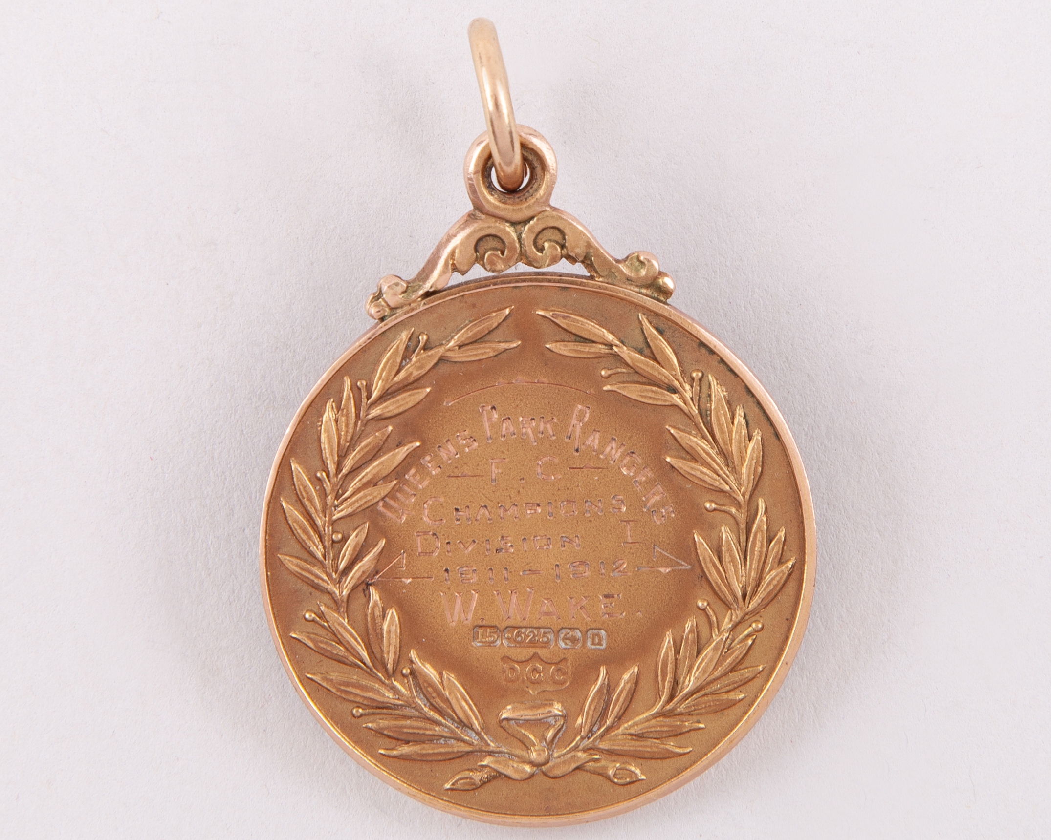 William Wake 15ct gold Southern Football League Winners medal, 1911-12, the obverse inscribed SOUTHERN FOOTBALL LEAGUE, the reverse inscribed Queen's Park Rangers F.C., Champions, Division 1 1911-12, W. WAKE, with case, 19grms