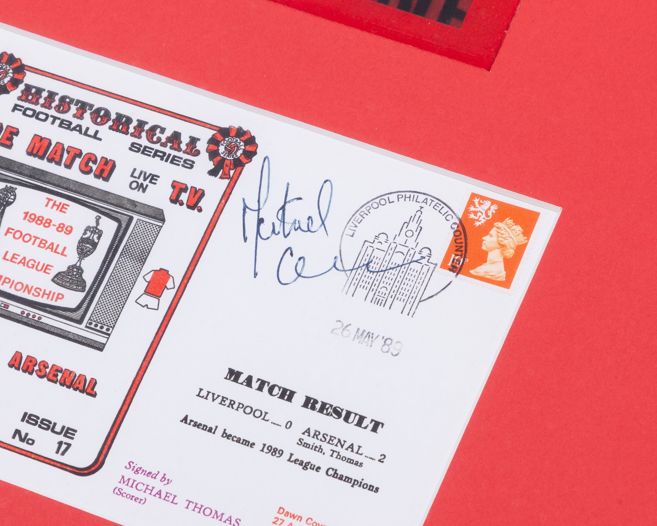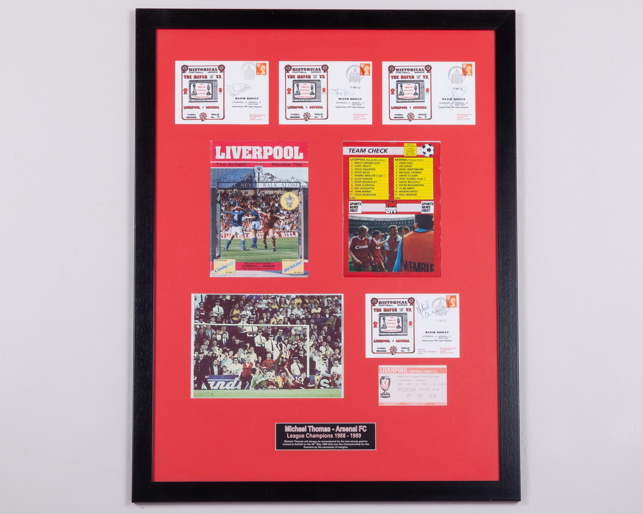 Michael Thomas League Champions display, comprising colour photograph, ticket, four first day autographed covers, including Michael Thomas, in common-mount, framed and glazed, 86 x 66cm