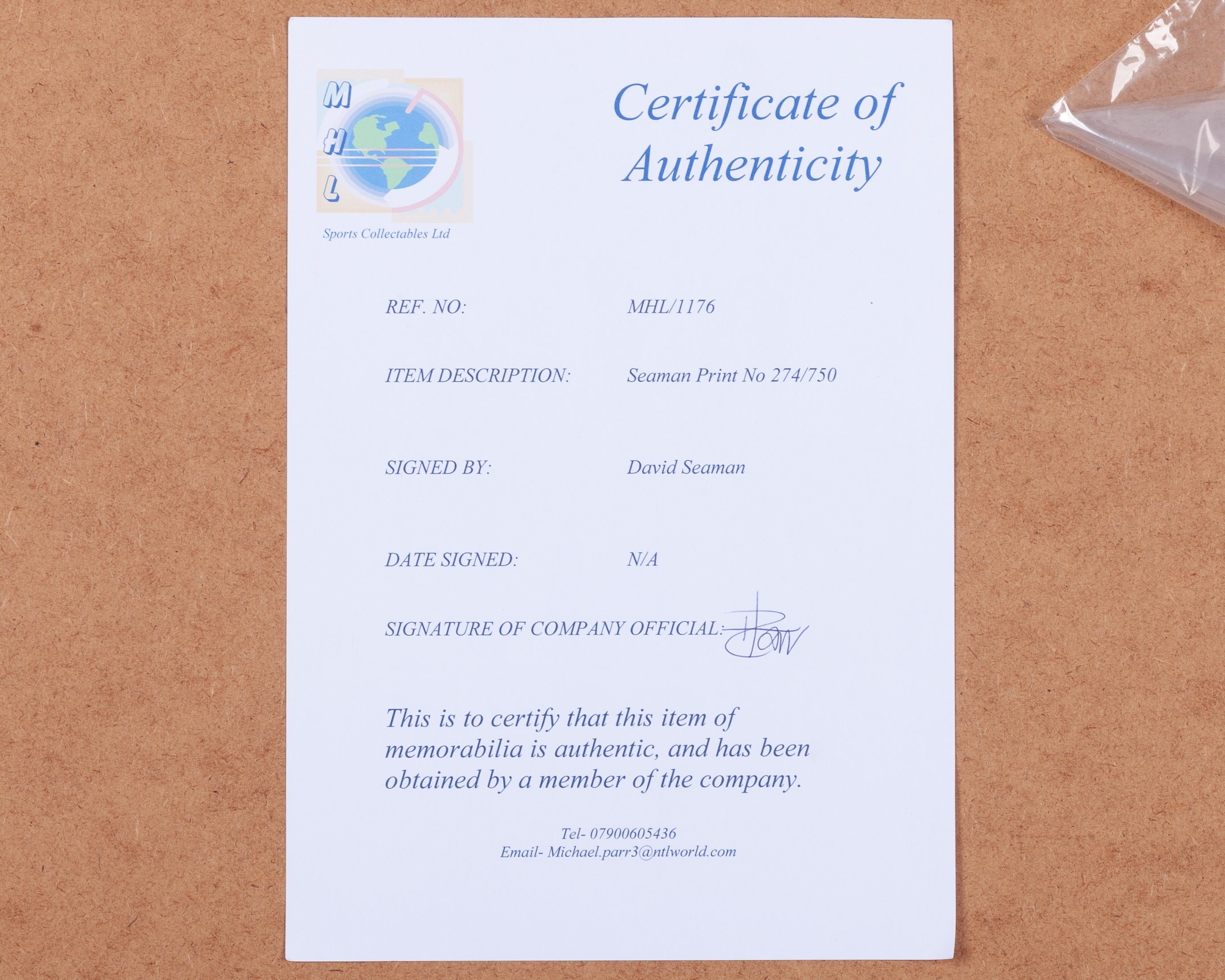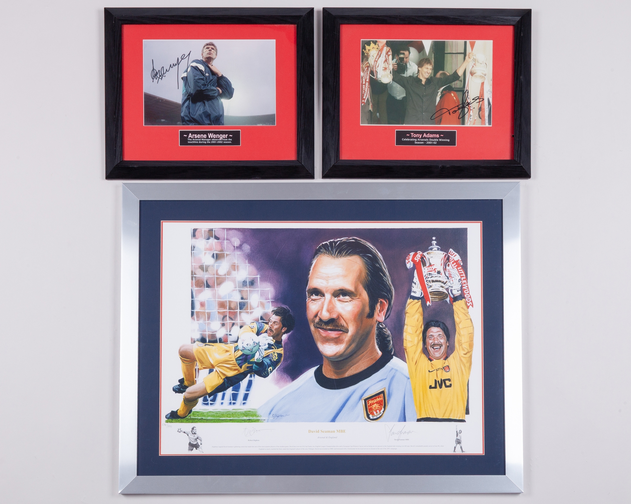 An autographed David Seaman print by Robert Highton, the margin signed be David Seaman and the artist, No.274 of 750, with COA, framed, 60 x 79cm, autographed Arsene Wenger photograph and autographed Tony Adams photograph, 34 x 40cm (3)