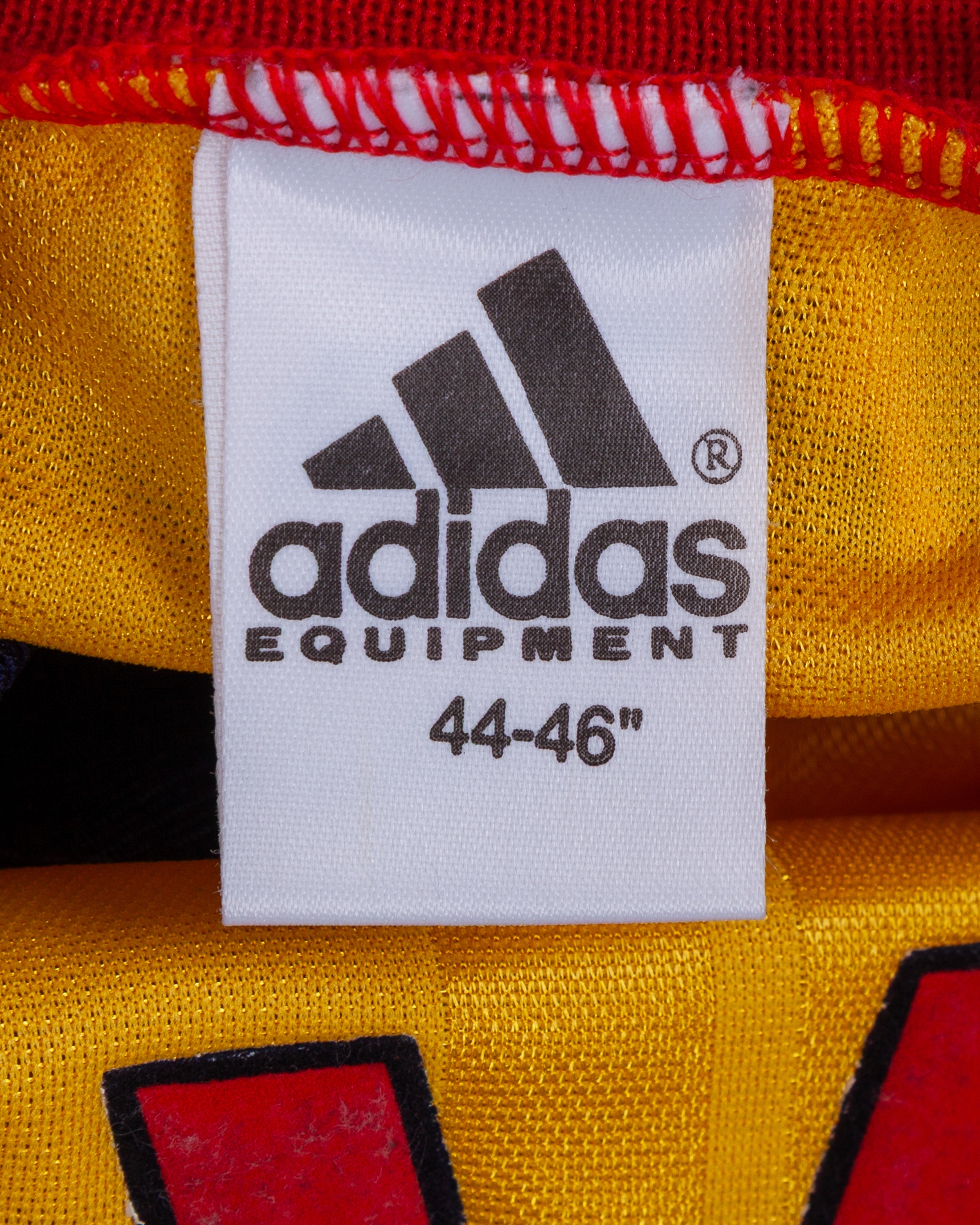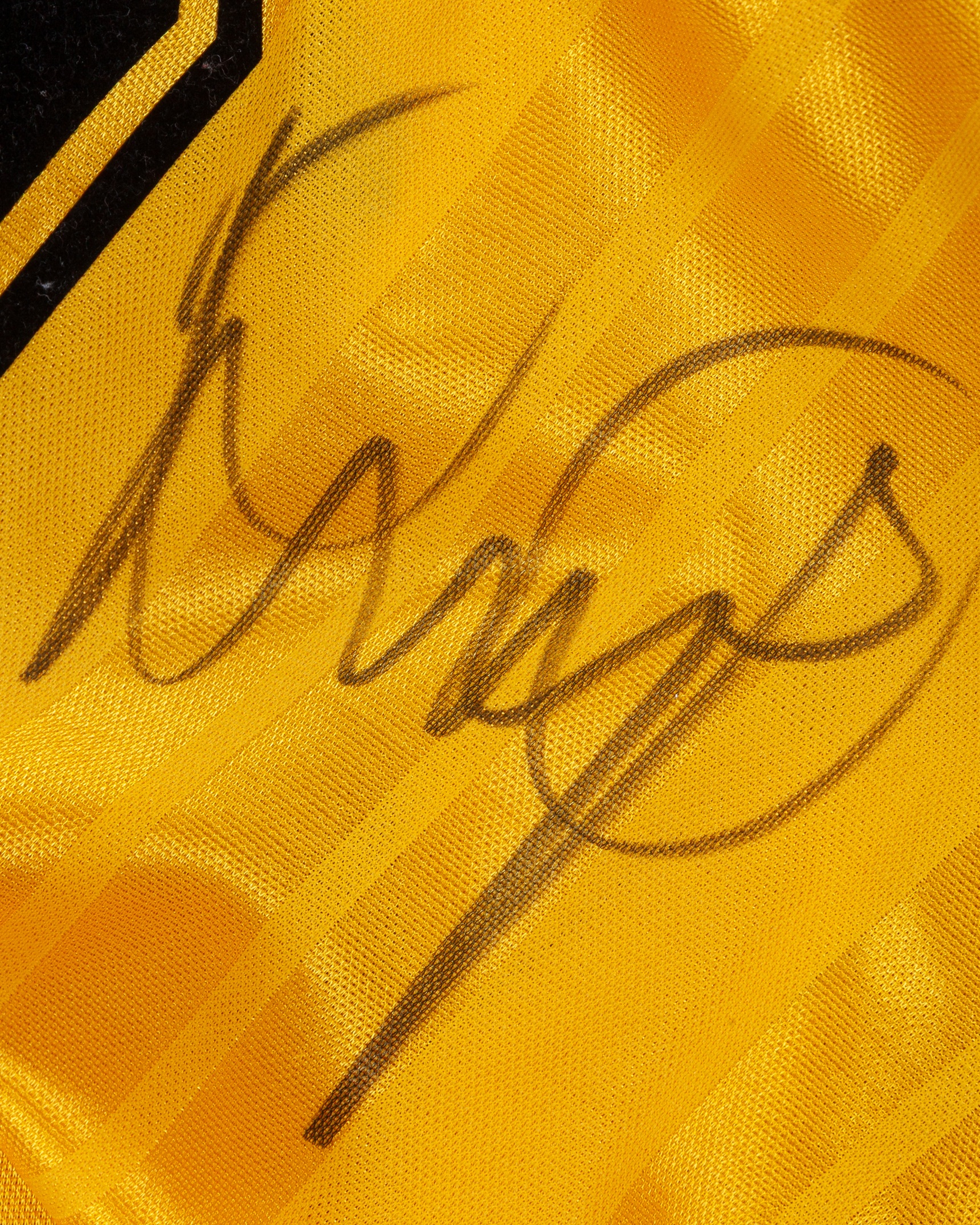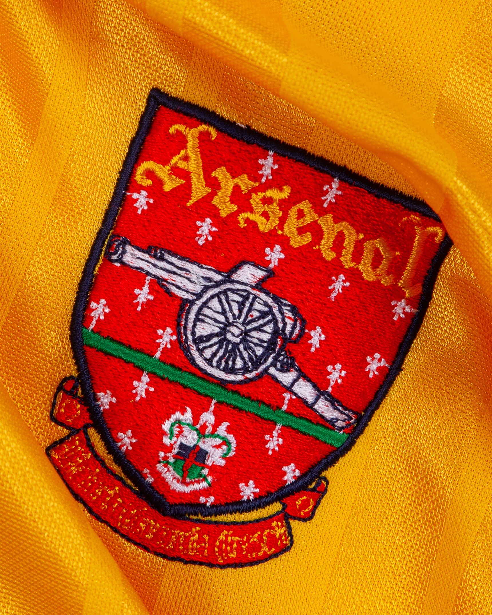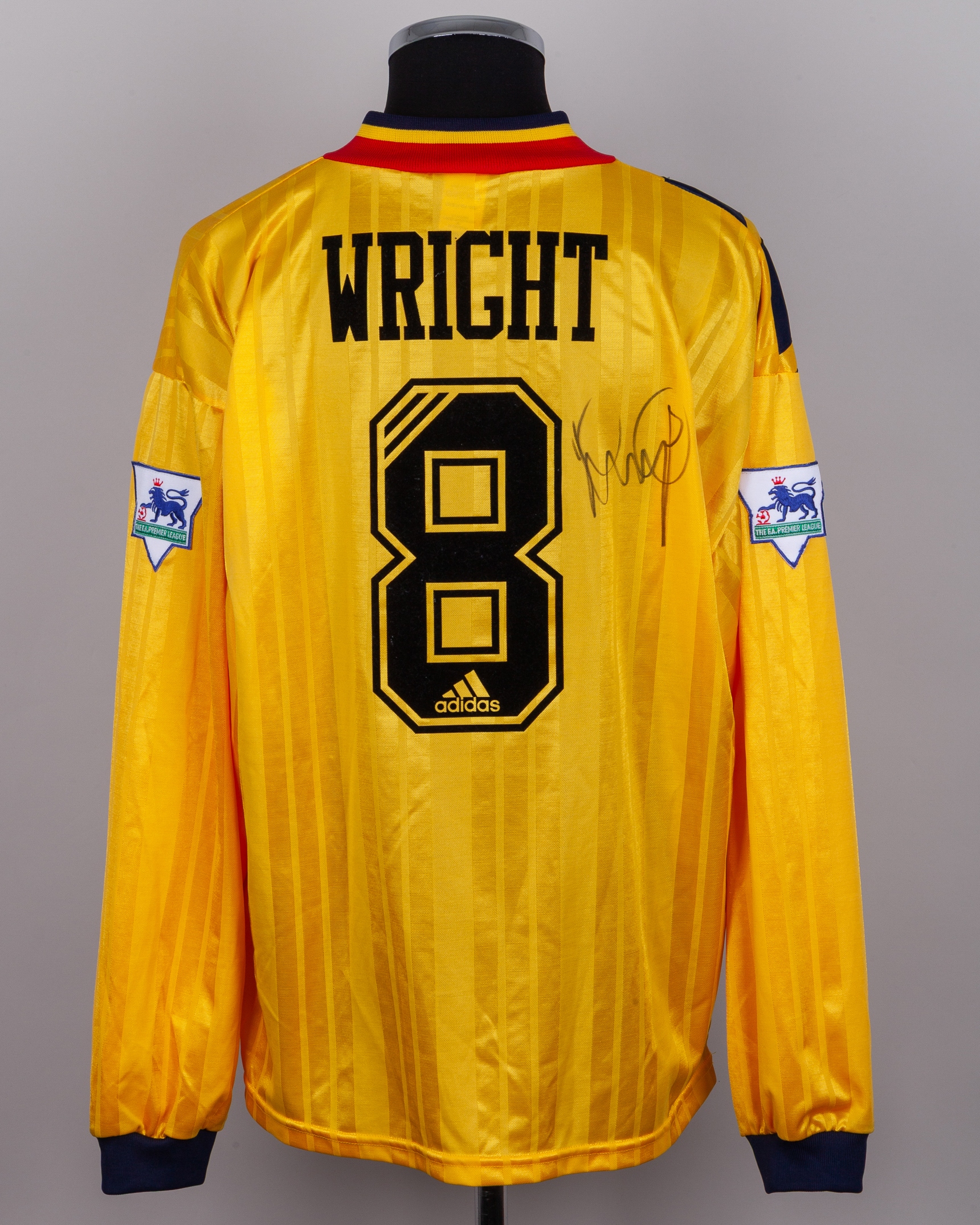 Ian Wright yellow, blue and red No.8 Arsenal autographed shirt, 1993-94, Adidas, 44-46, with v-neck collar and embroidered badge inscribed Arsenal, the reverse lettered WRIGHT, the reverse autographed, the sleeves with The F.A.Premier league flashes, with COA