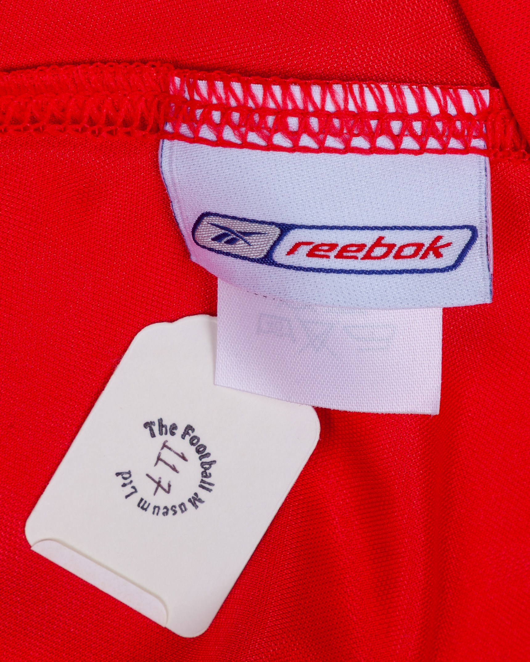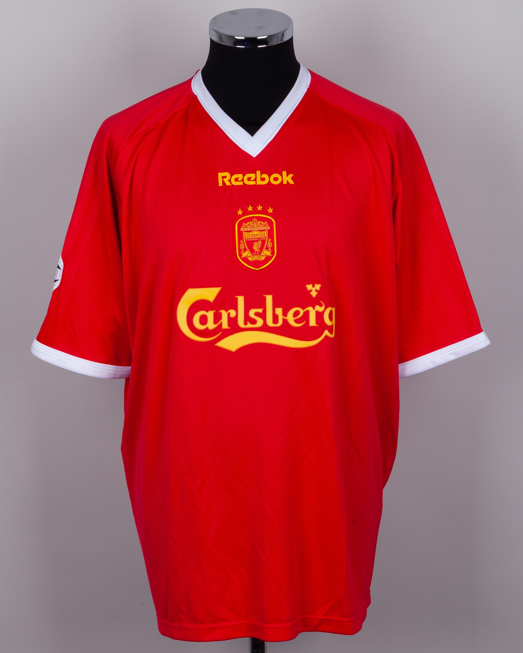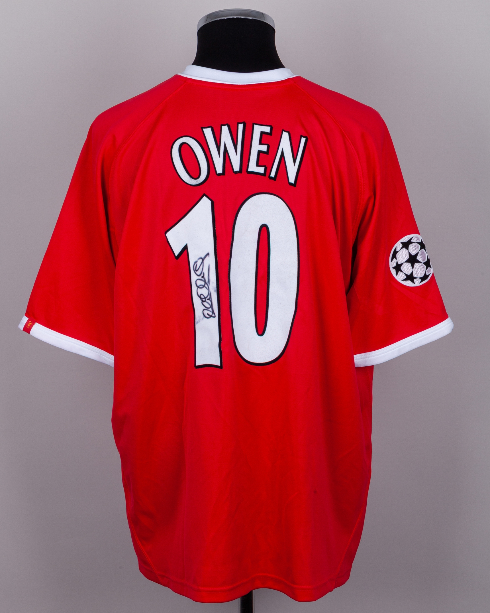 Michael Owen red and white No.10 Liverpool autographed short-sleeved shirt, 2001-03, Reebok, with v-neck collar and embroidered badge inscribed LIVERPOOL FOOTBALL CLUB EST.1892, the reverse lettered OWEN, the number autographed, the right sleeve with Champions League flash