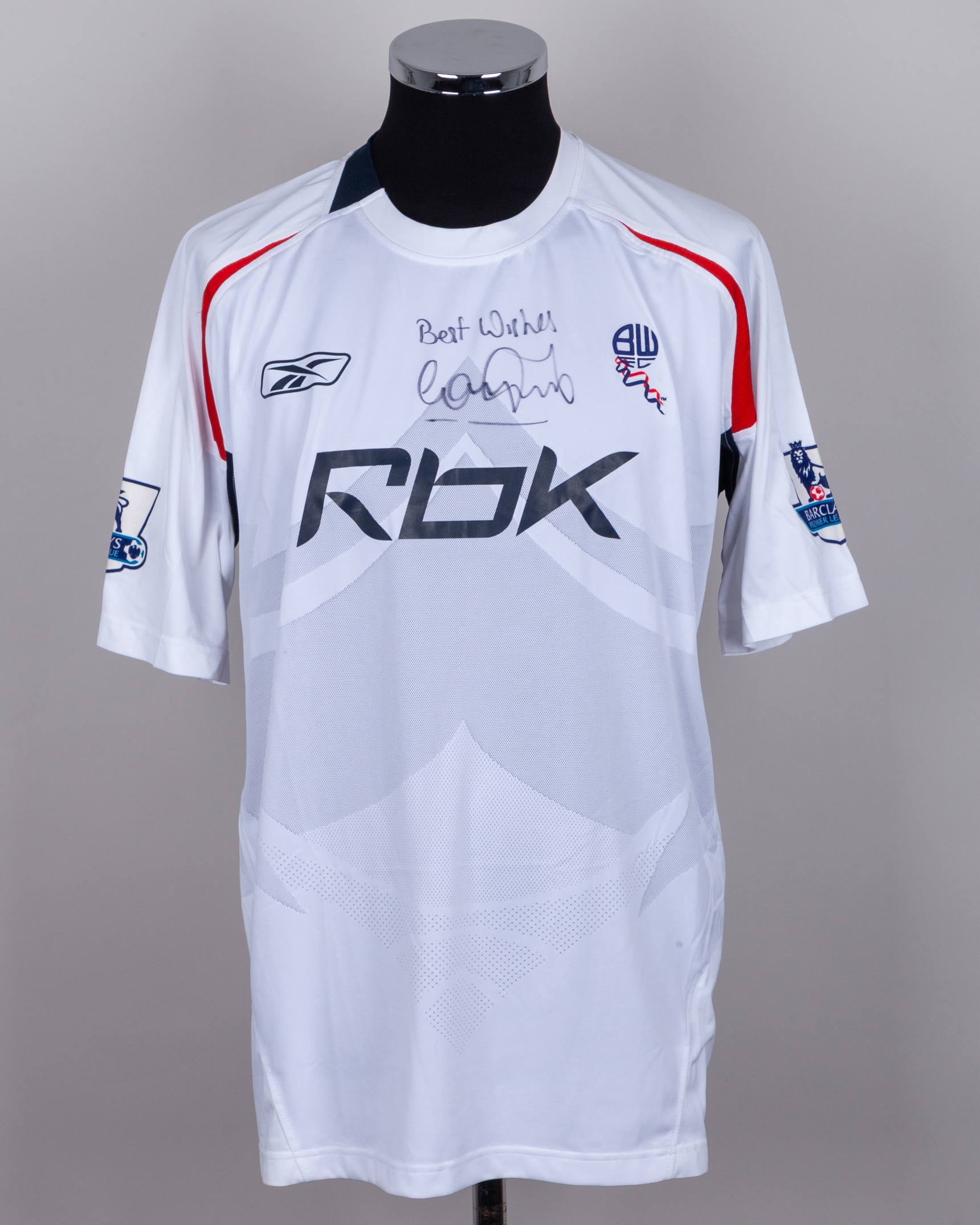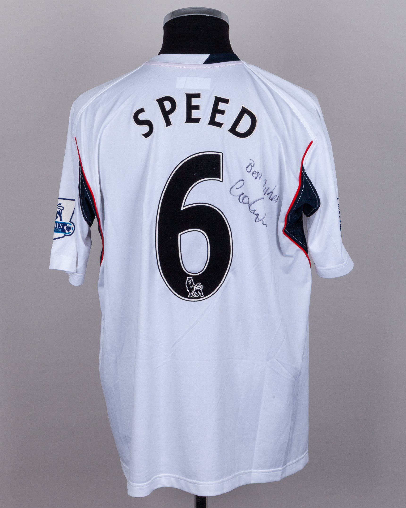 Gary Speed white, red and blue No.6 Bolton Wanderers autographed short-sleeved shirt, 2007-08, Reebok, XL, with v-neck collar and sponge badge, the reverse lettered SPEED, the front and back autographed, the sleeves with Barclays Premier league flashes, with COA