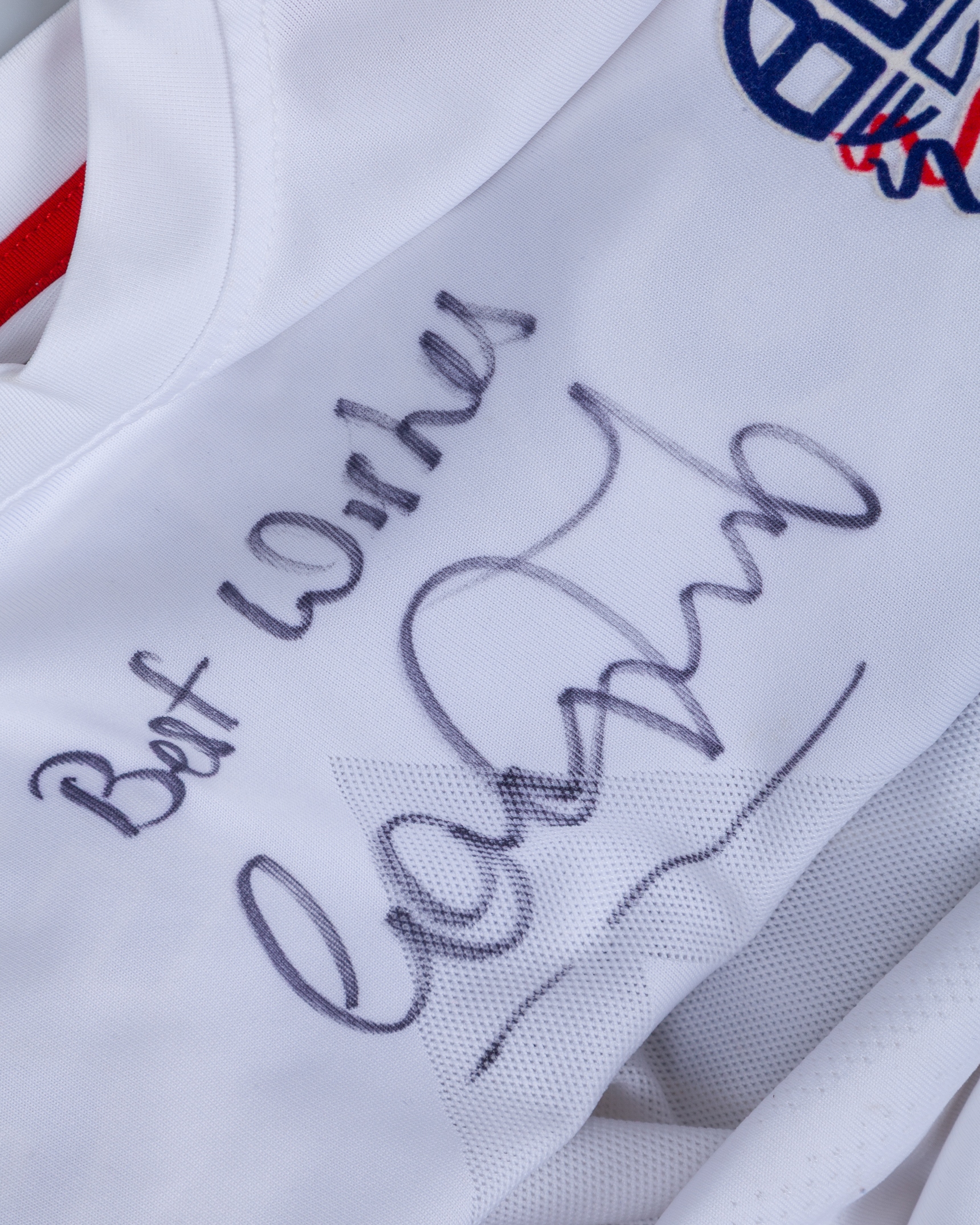 Gary Speed white, red and blue No.6 Bolton Wanderers autographed short-sleeved shirt