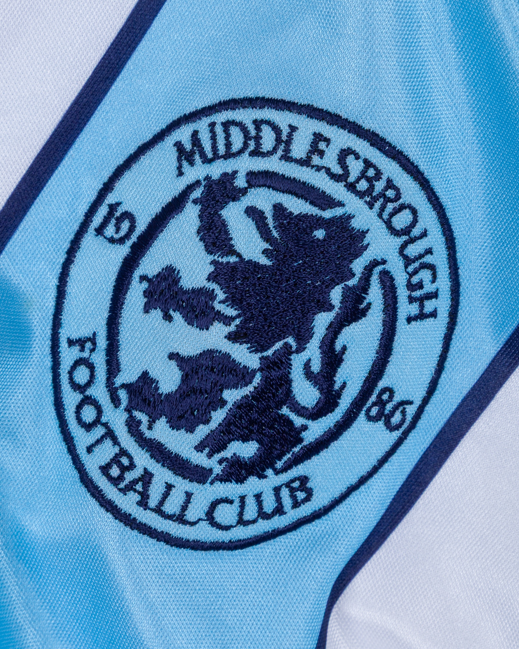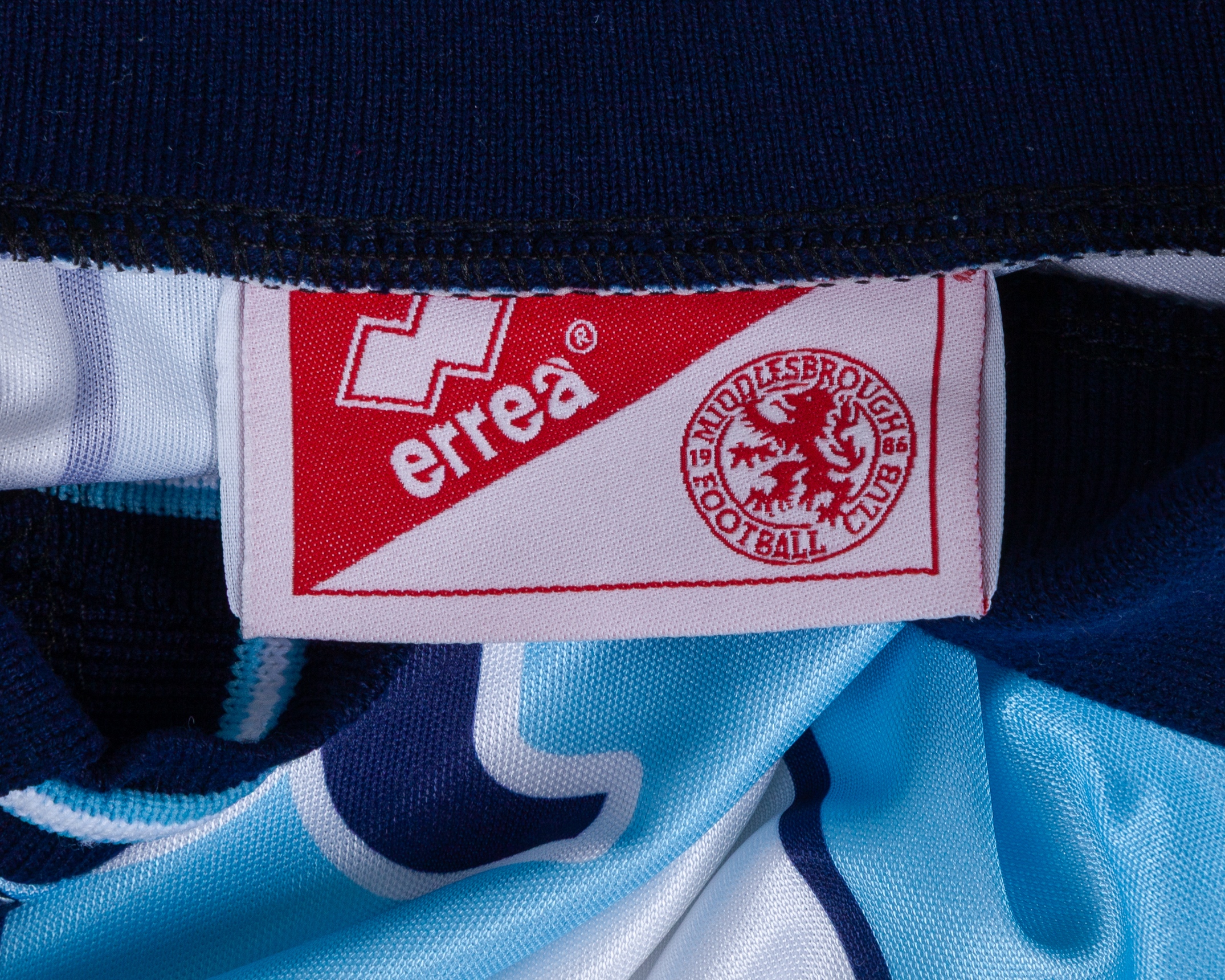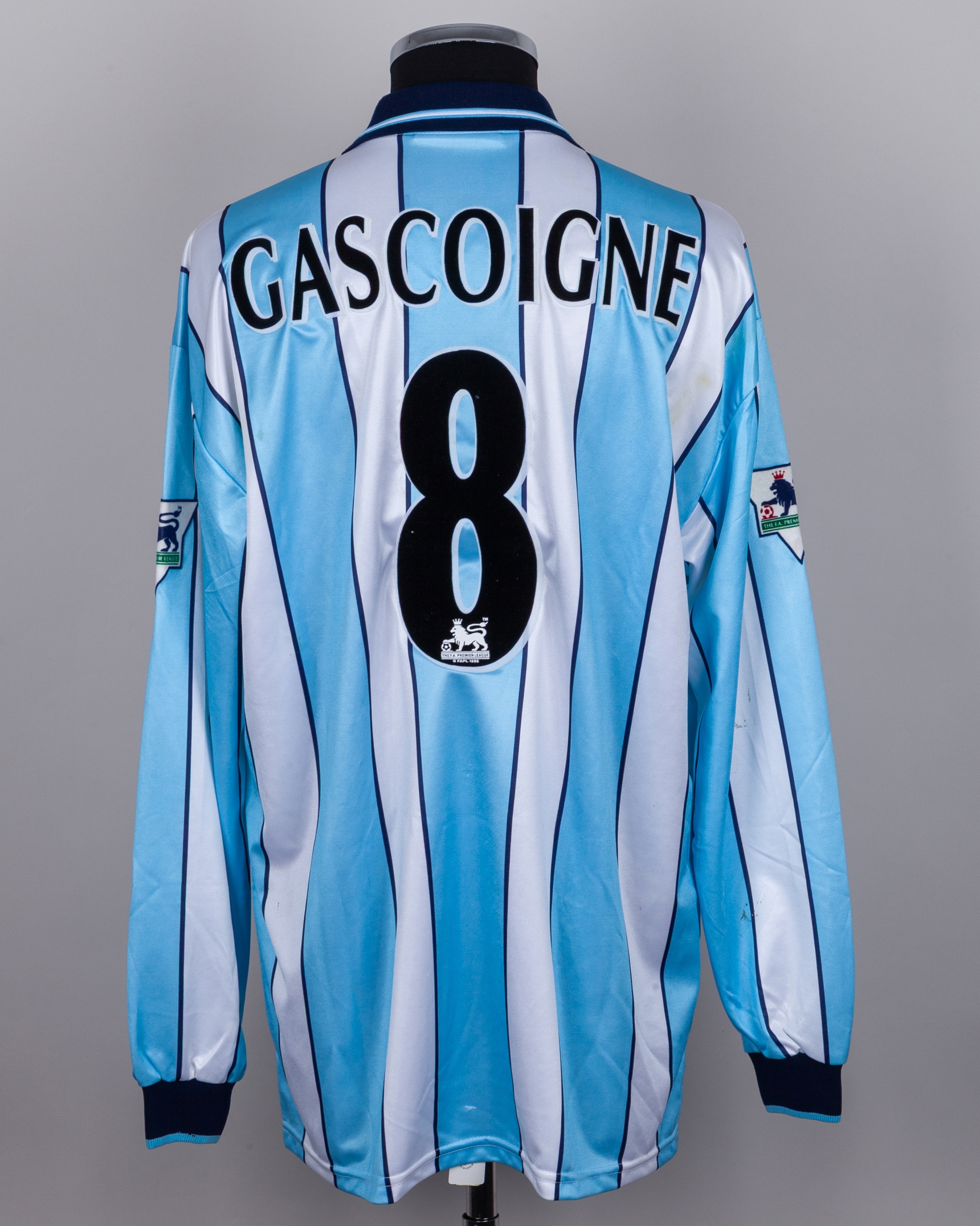Paul Gascoigne sky blue and white No.8 Middlesbrough autographed long-sleeved shirt, Errea, XXL, with v-neck collar and embroidered badge inscribed MIDDLESBROUGH FOOTBALL CLUB 1986, the reverse lettered GASCOIGNE, the front of the shirt autographed, the sleeves with The F.A.Premier league flashes