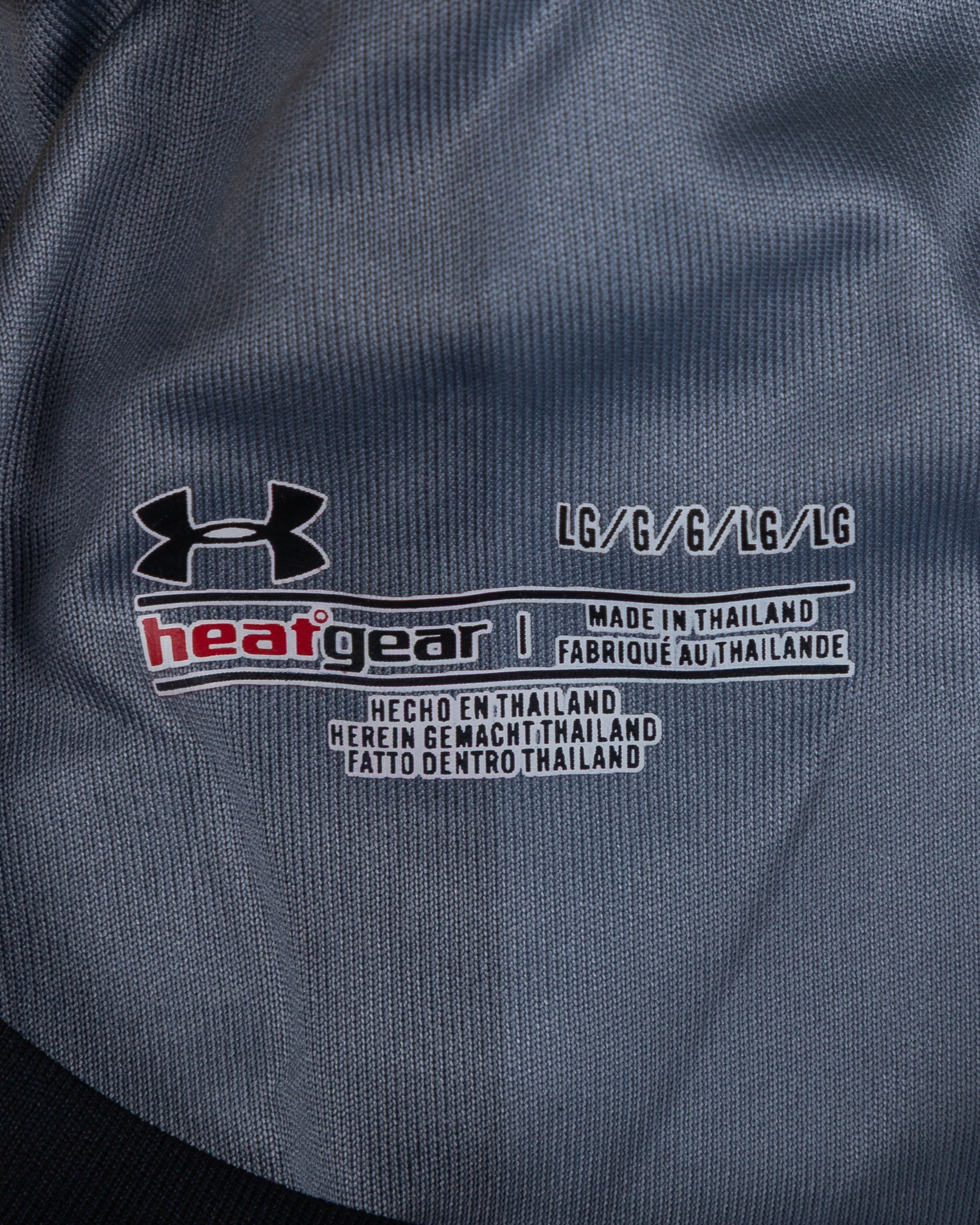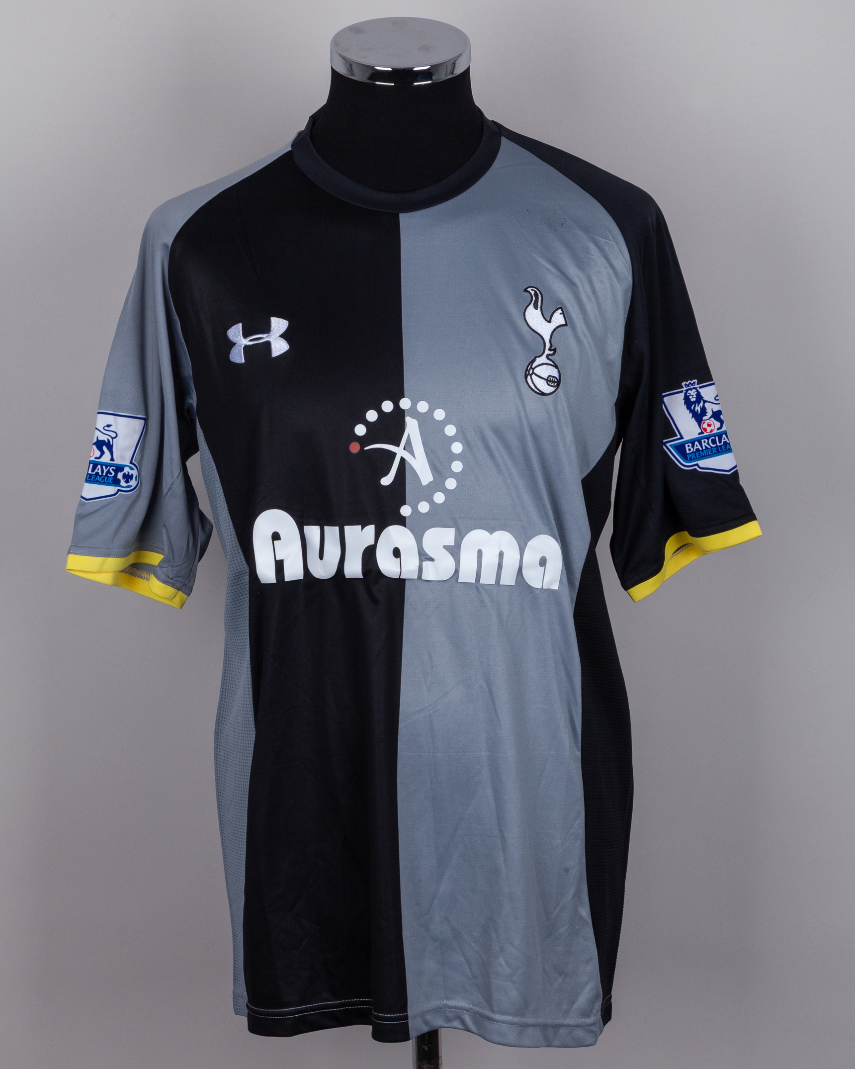Gareth Bale black and grey No.11 Tottenham Hotspur short-sleeved shirt, 2012-13, Under Armour, L, with crew-neck collar and embroidered badge, the reverse lettered BALE, the sleeves with Barclays Premier League flashes, staining, colour run to number, with COA