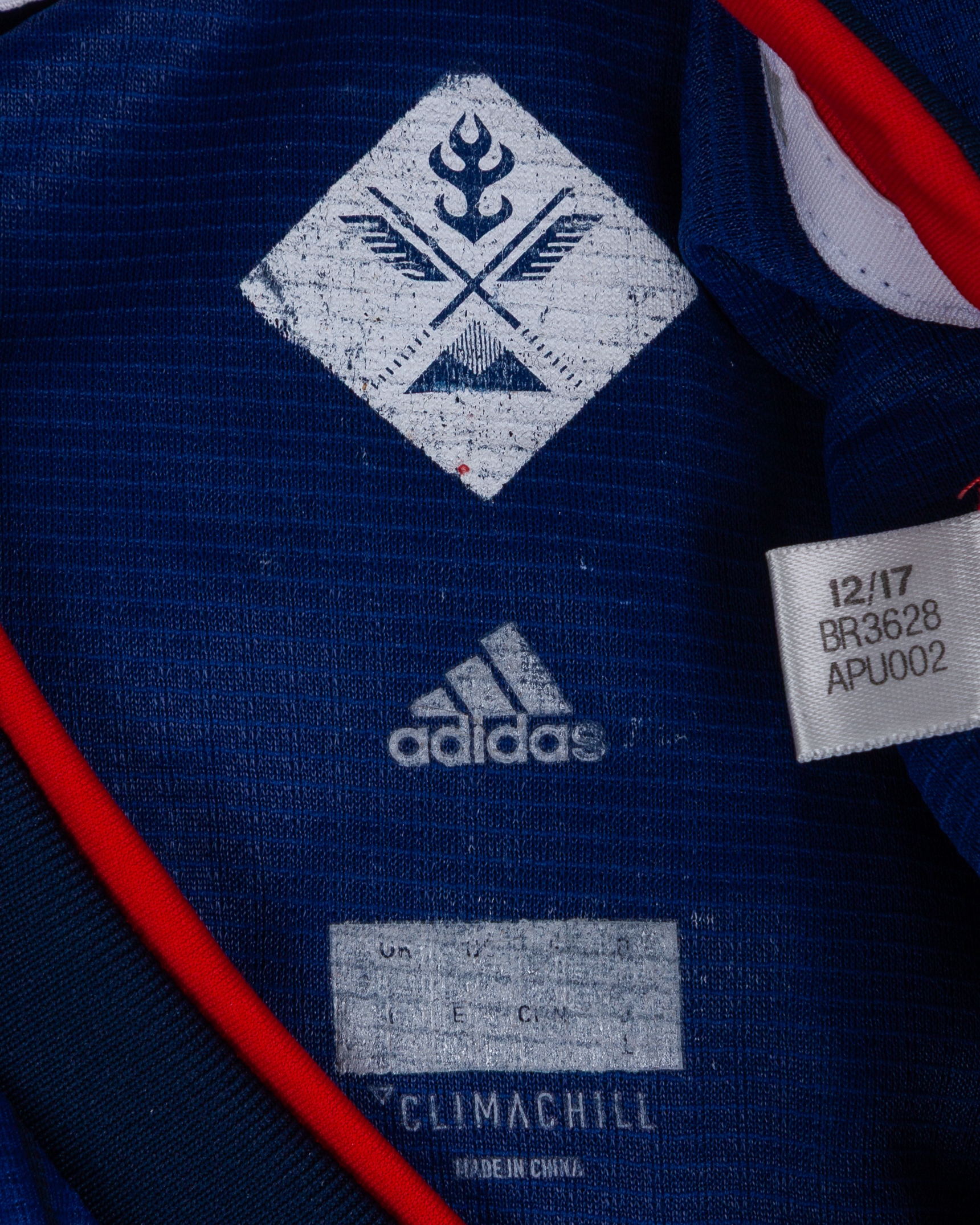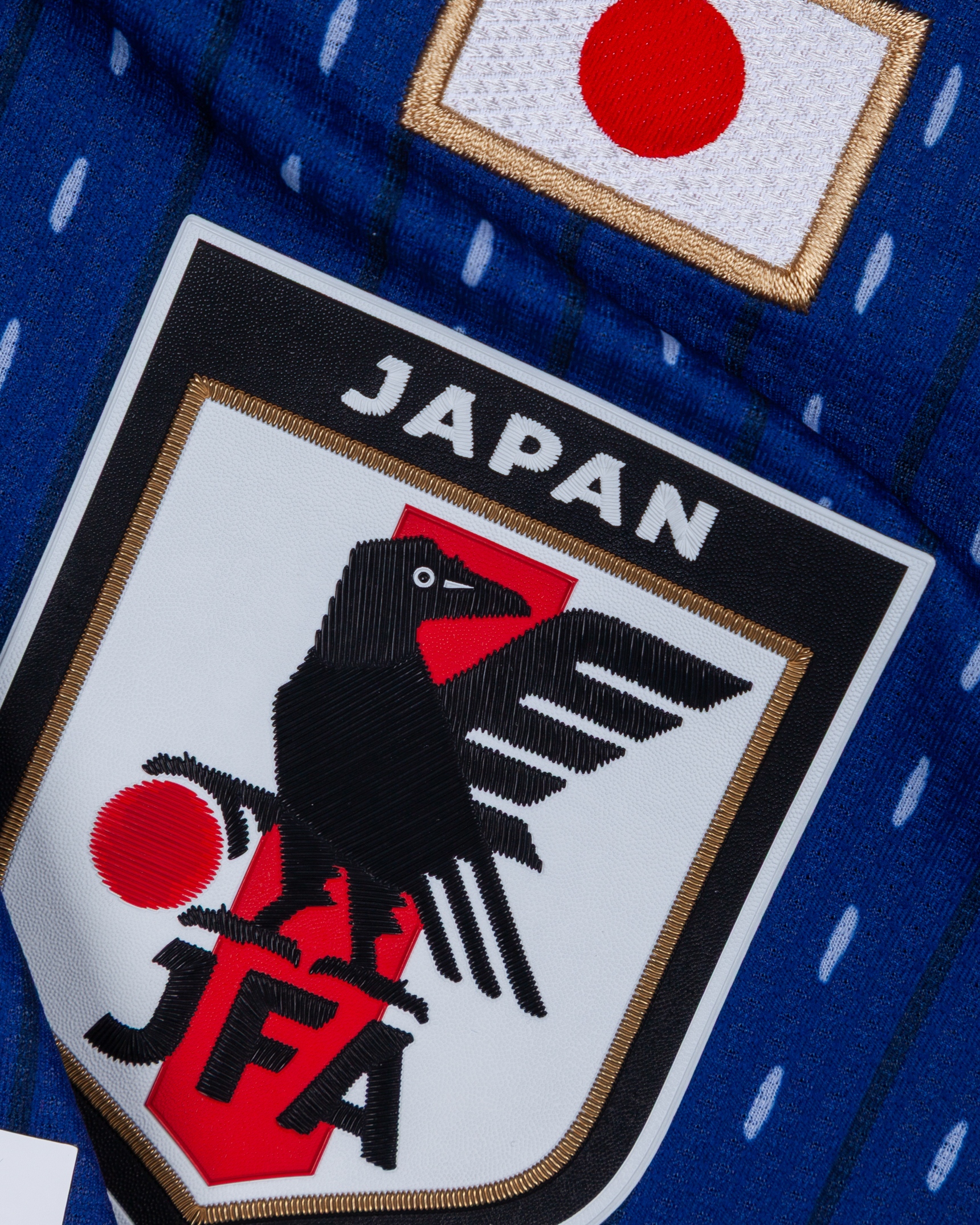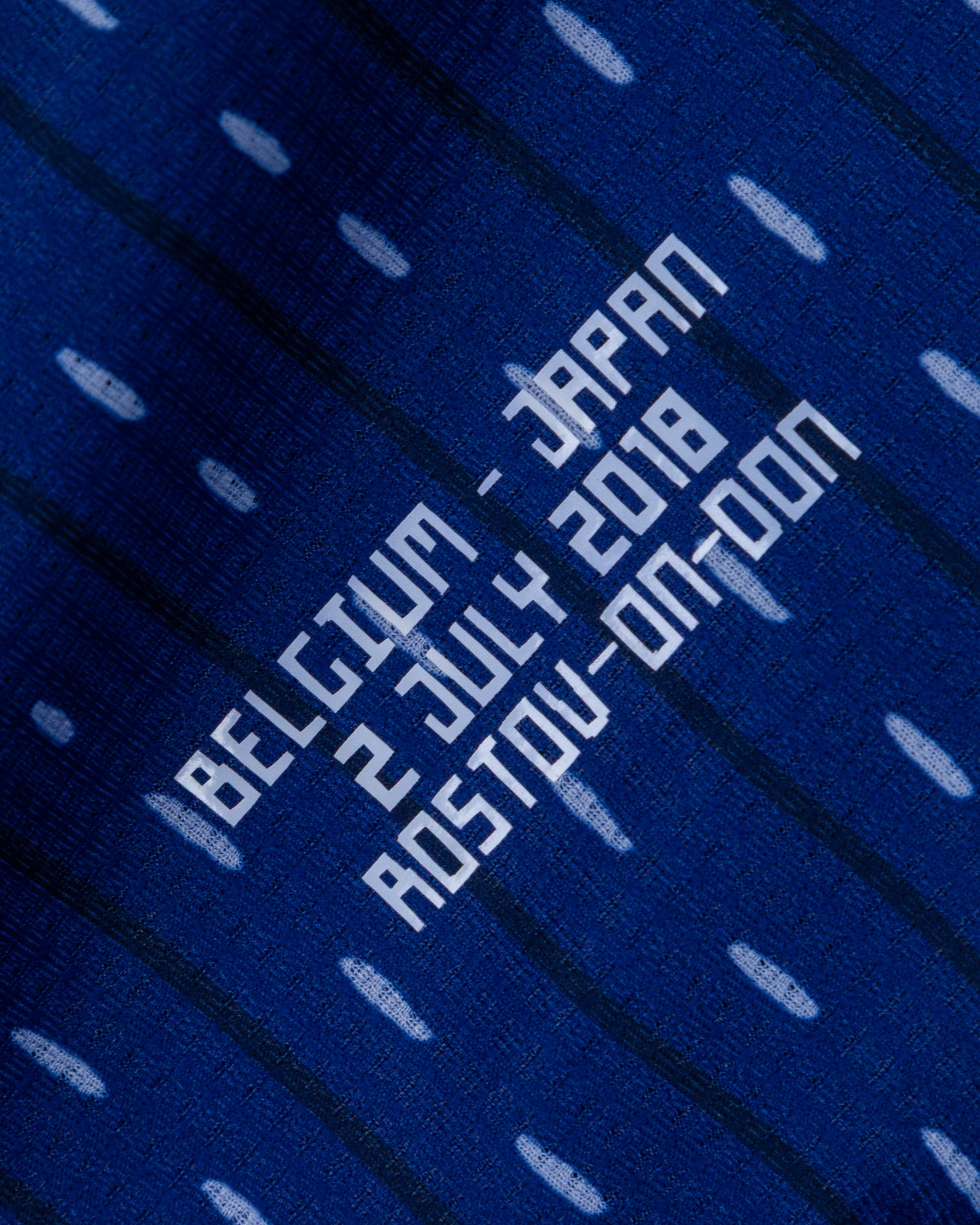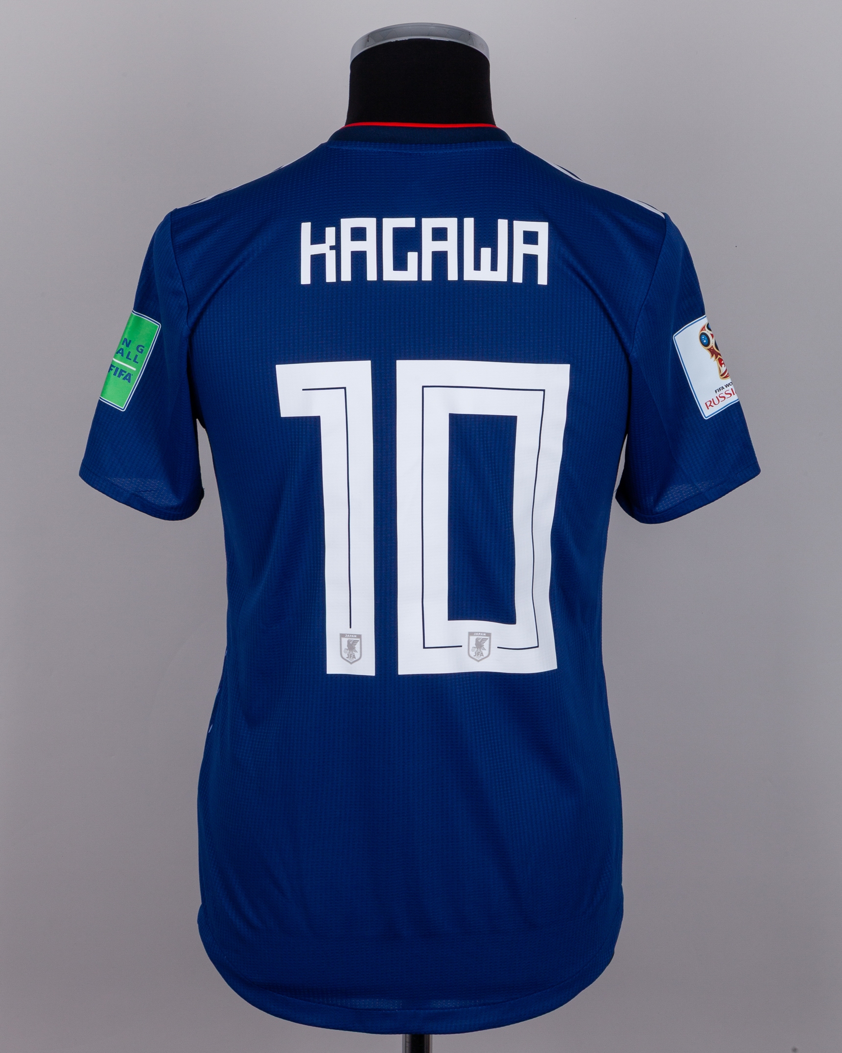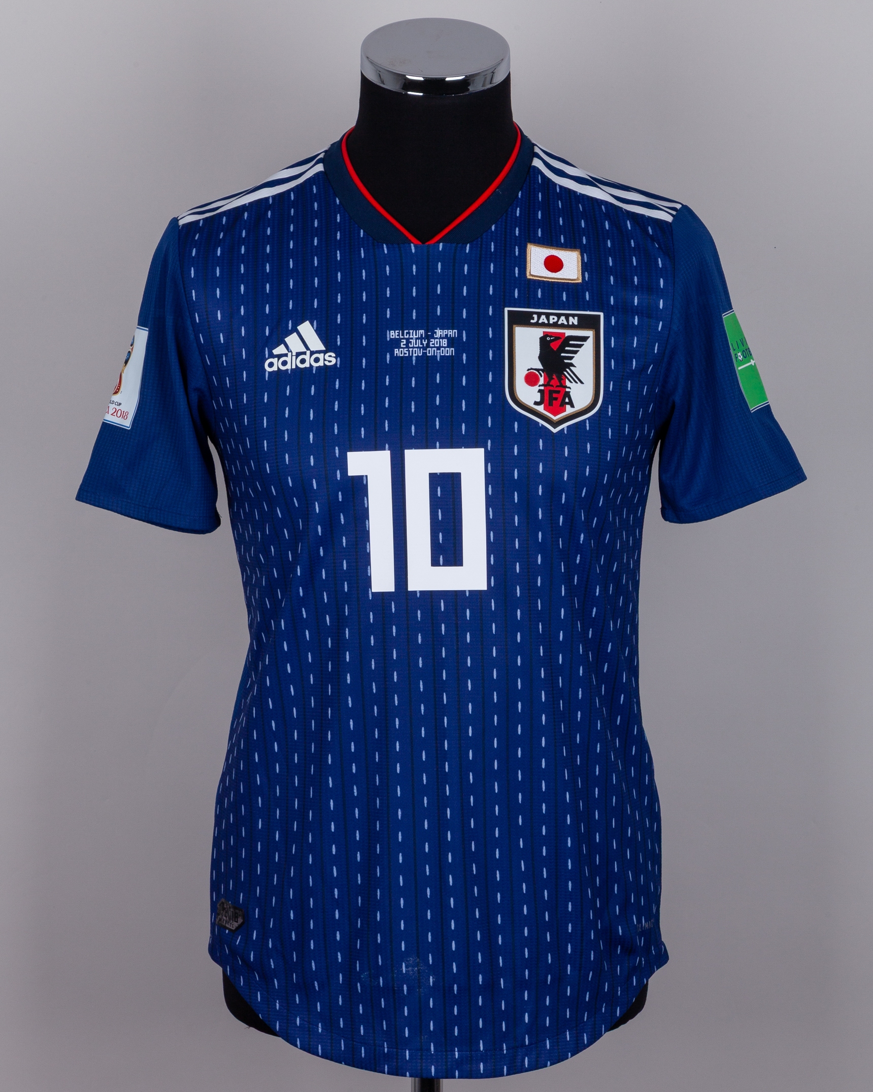 Shinji Kagawa blue No.10 Japan v. Belgium short-sleeved shirt, 2018, Adidas, with v-neck collar and printed badge, with BELGIUM - JAPAN 2 JULY 2018 ROSTOV-ON-DON decal, with embroidered Japan flag, the reverse lettered KAGAWA, the right sleeve with FIFA World Cup Russia 2018 flash and the left sleeve with living football flash, with a white stain on the lower front