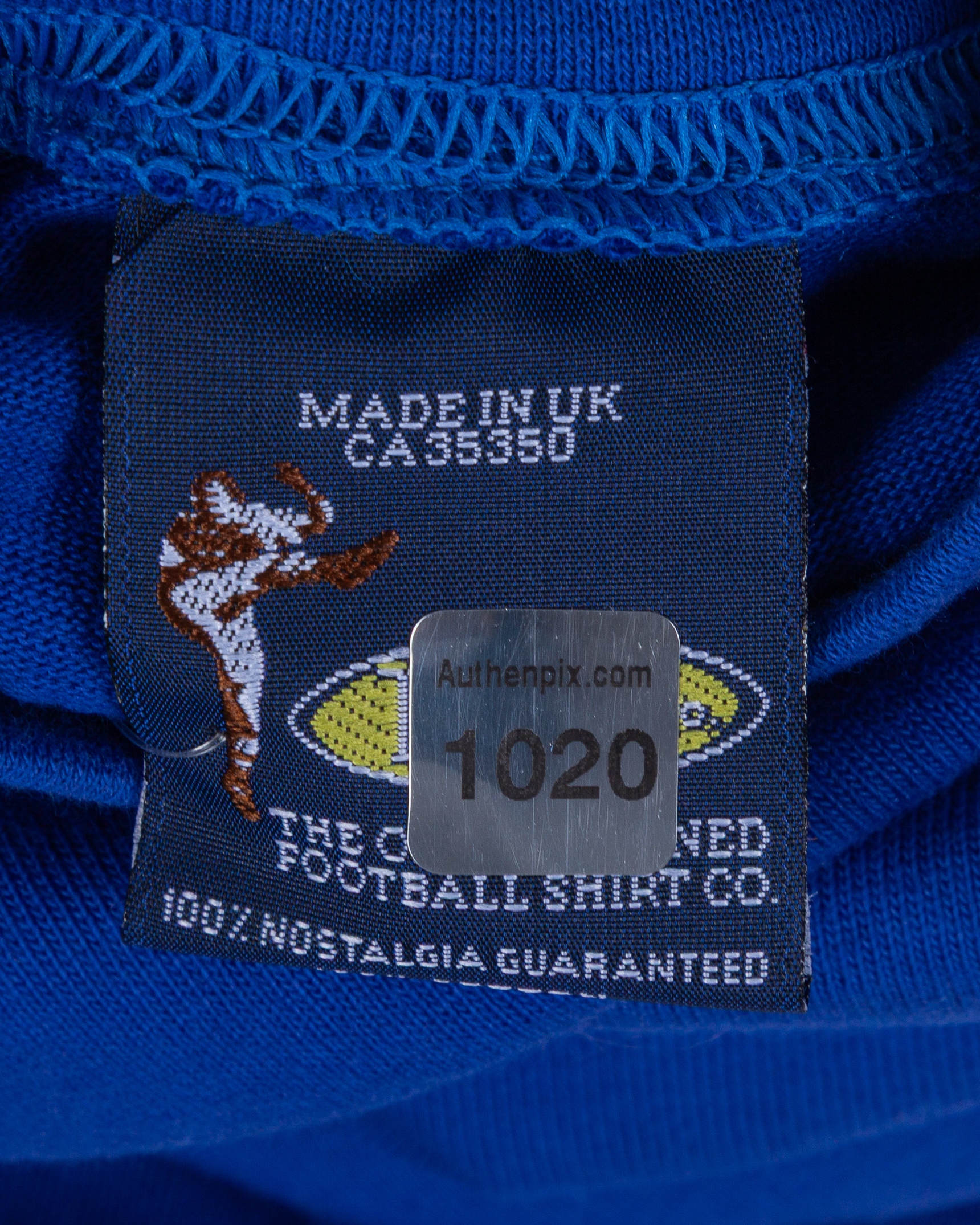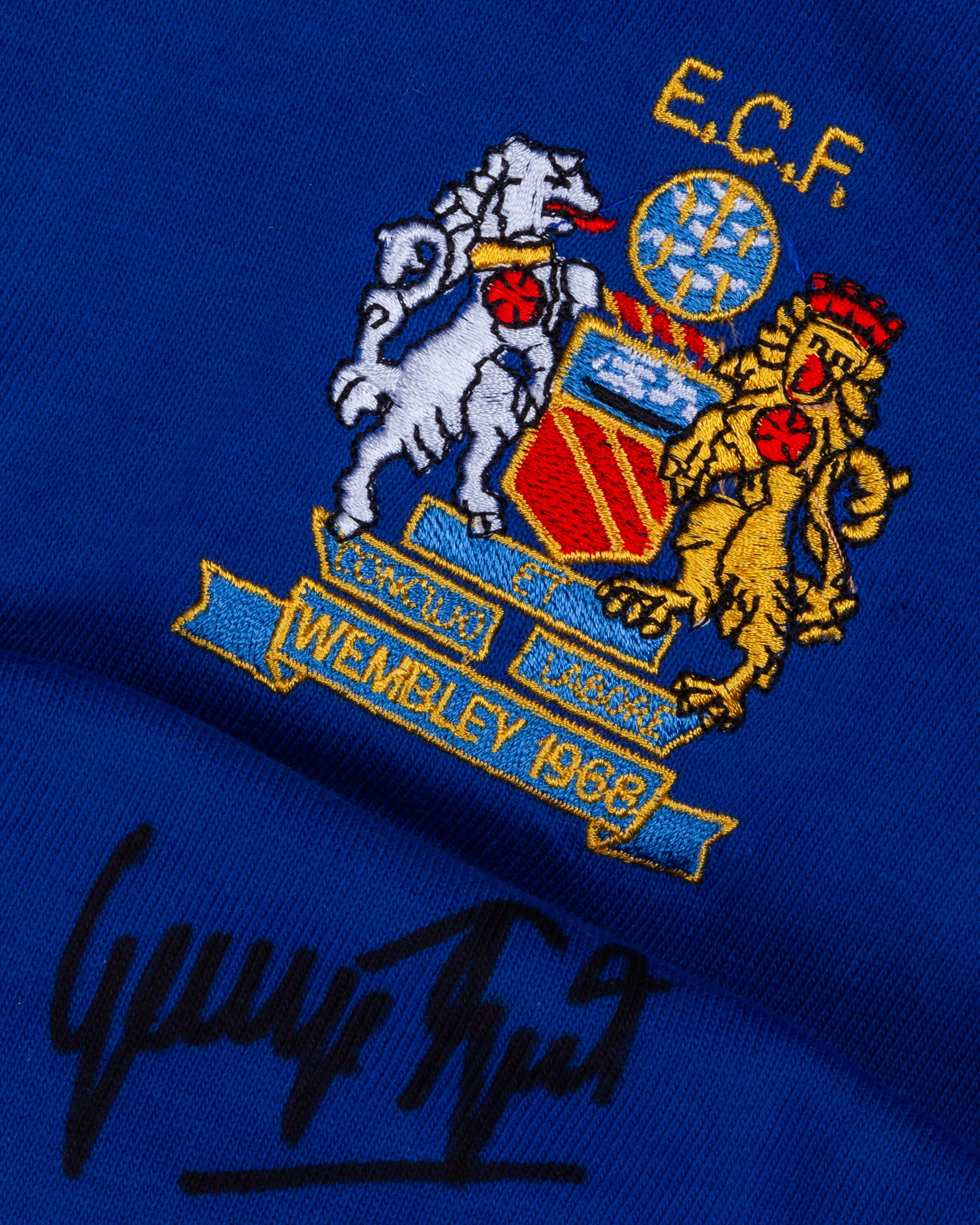 George Best autographed blue Manchester United replica long-sleeved shirt, Toffs, M, with crew-neck collar and embroidered badge inscribed E.C.F. ET CONCILIO LABORE WEMBLEY 1968, with COA
