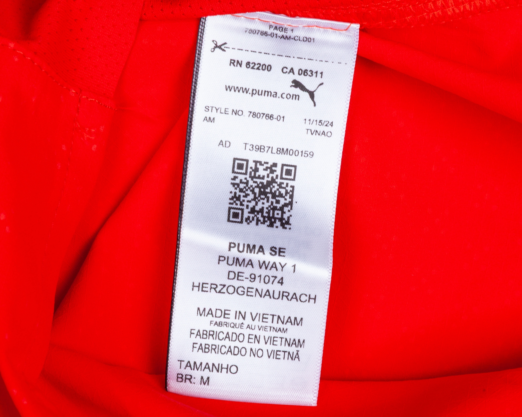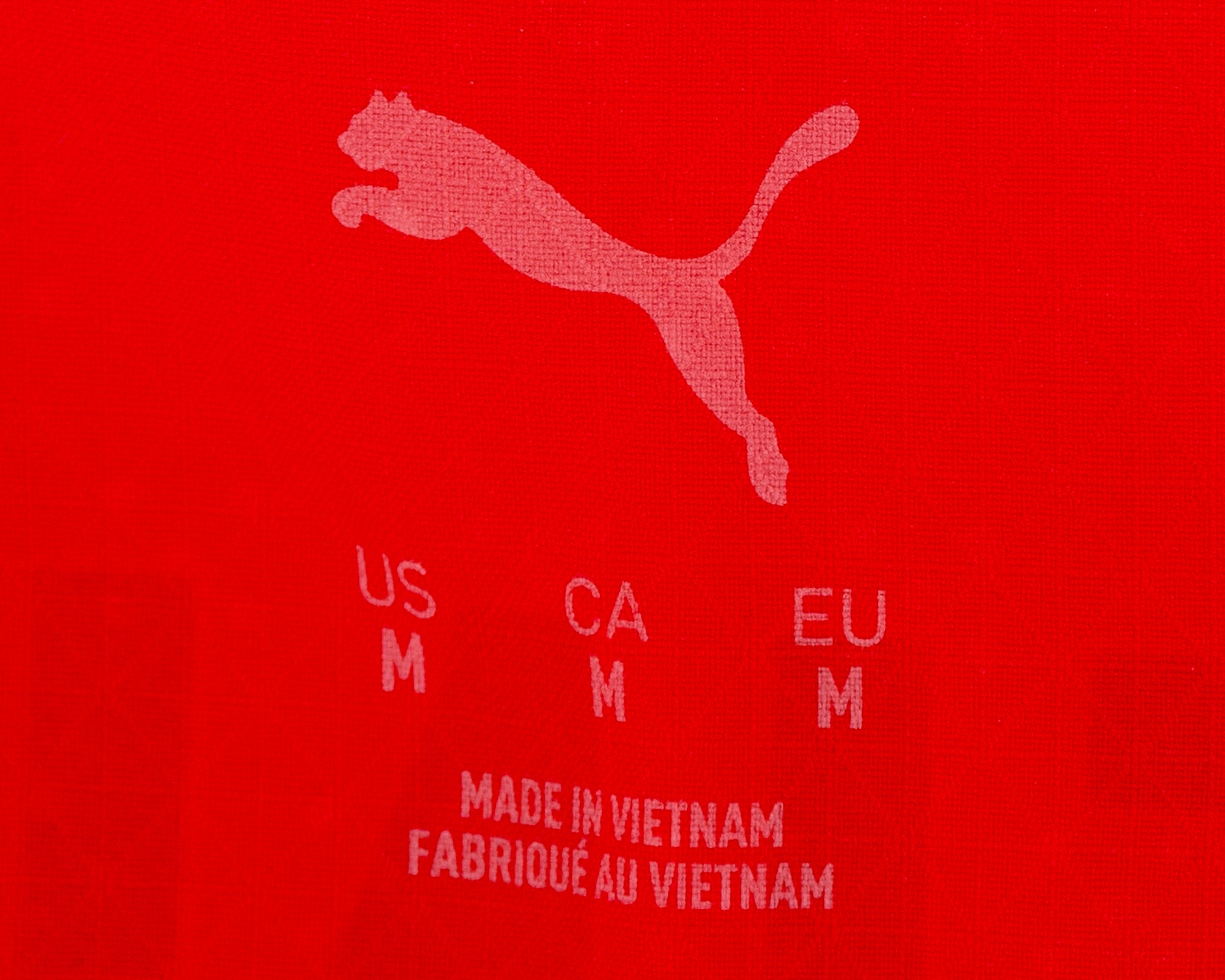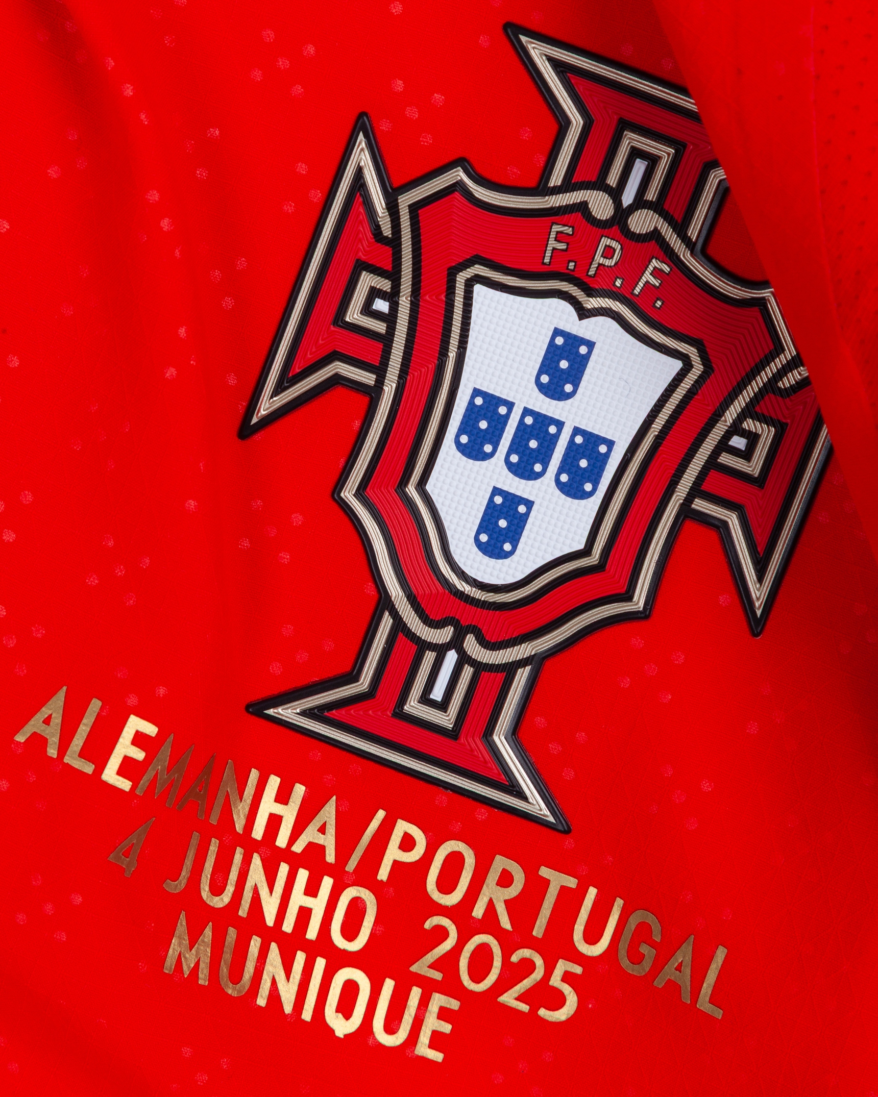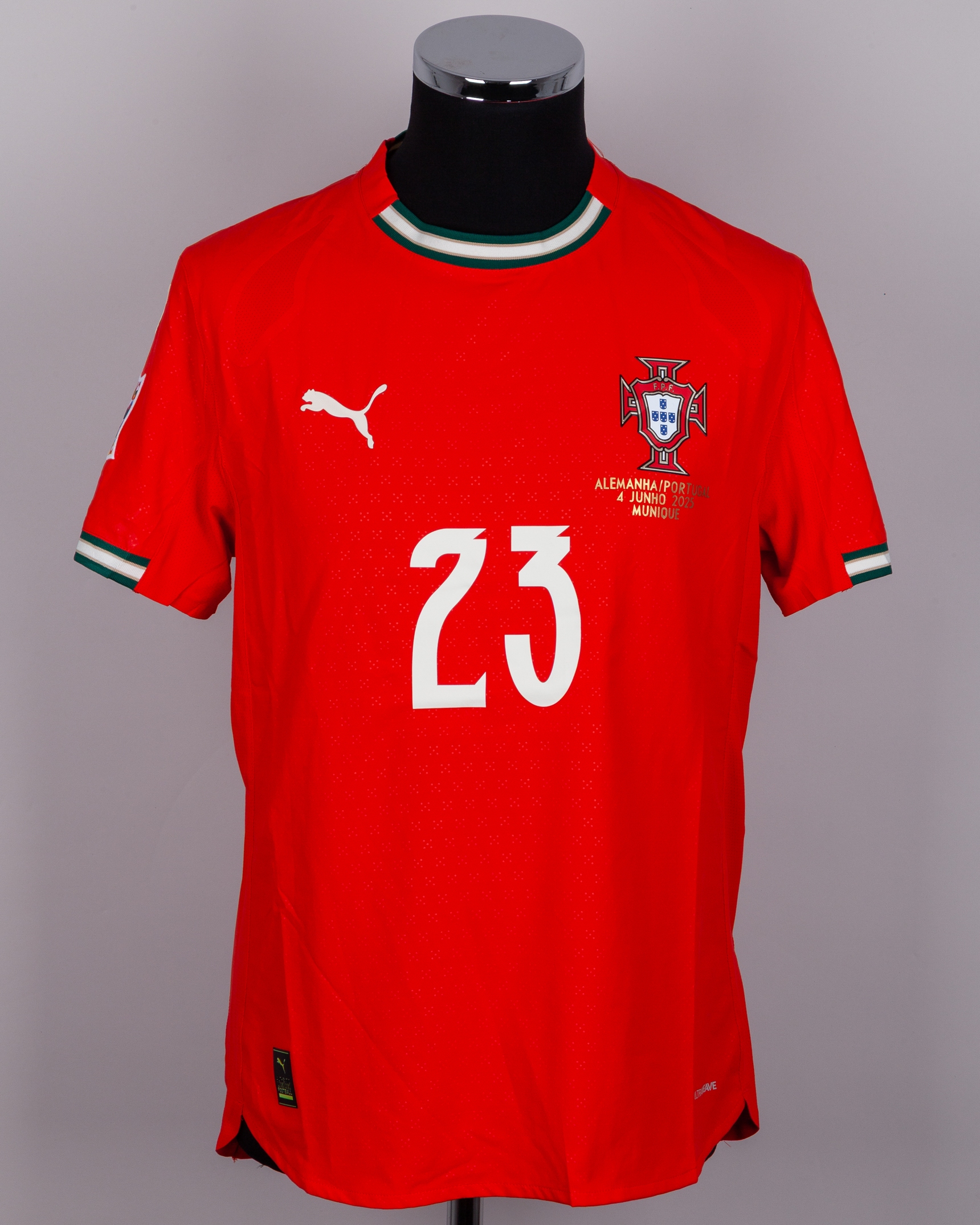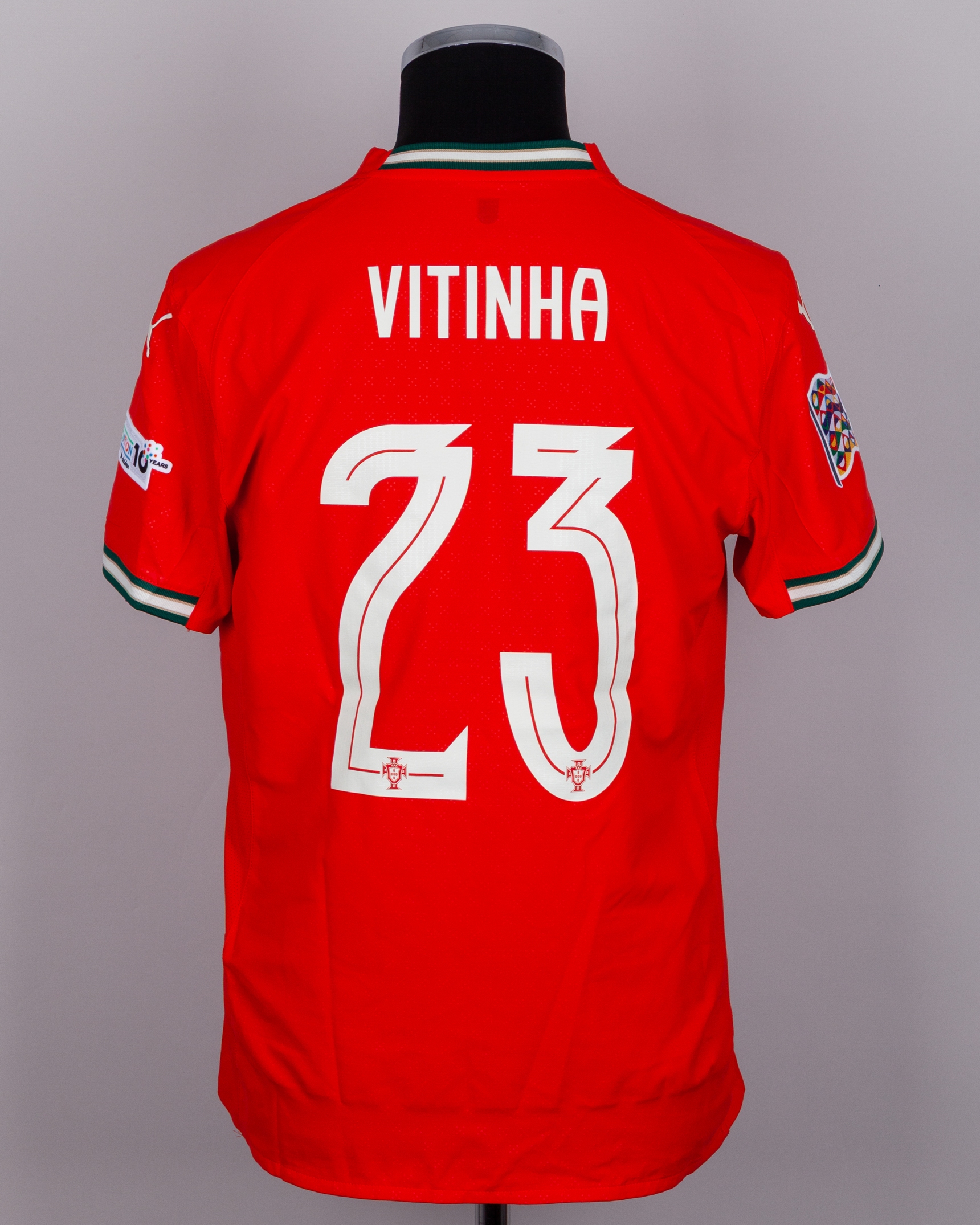 Vitinha red No.23 Portugal v. Germany short-sleeved shirt, 2025, Puma, M, with crew-neck collar and printed badge, with ALEMANHA/PORTUGAL 4 JUNHO 2025 MUNIQUE decal, the reverse lettered VITINHA, the right sleeve with Nations League flash and the left sleeve with UEFA foundation flash