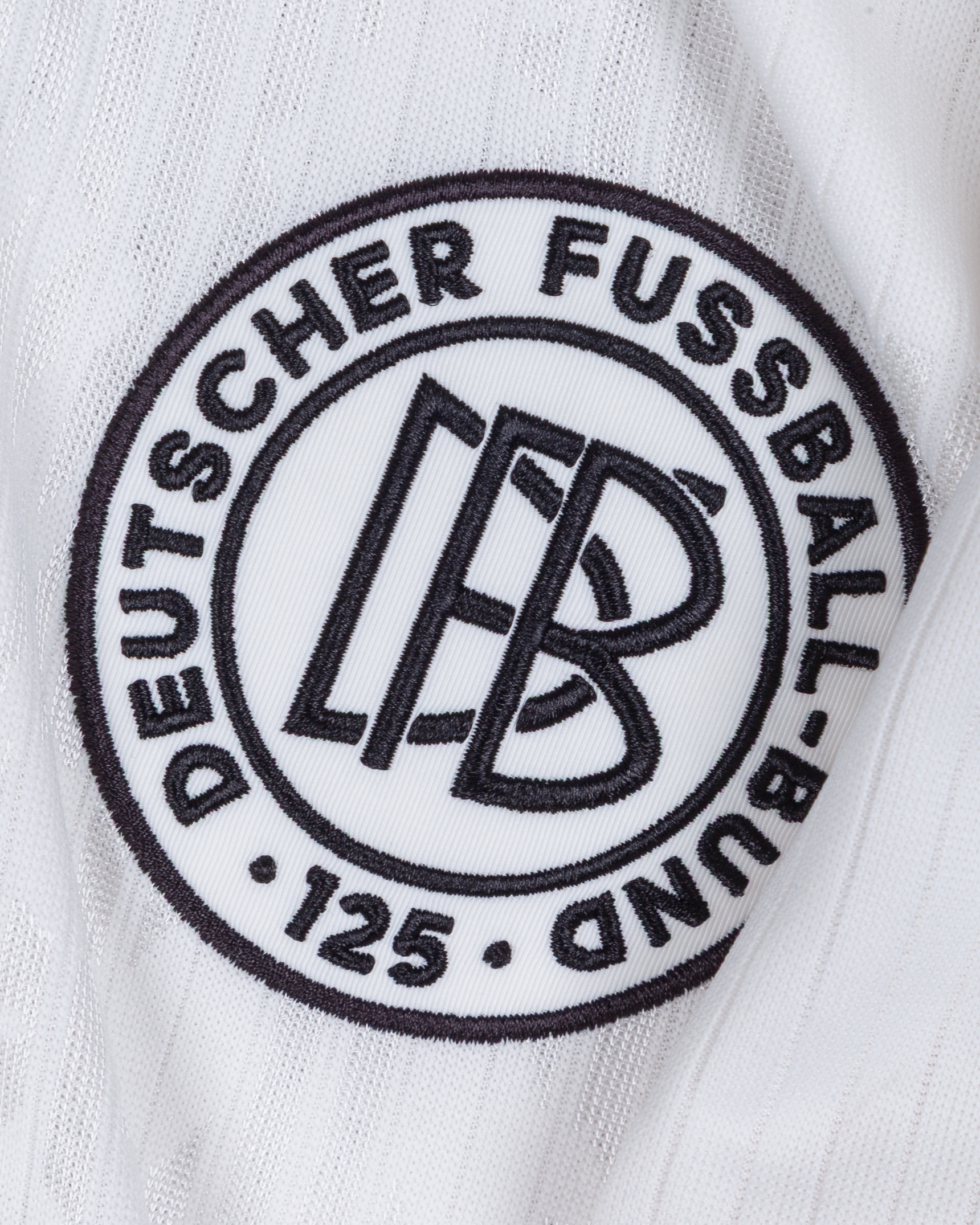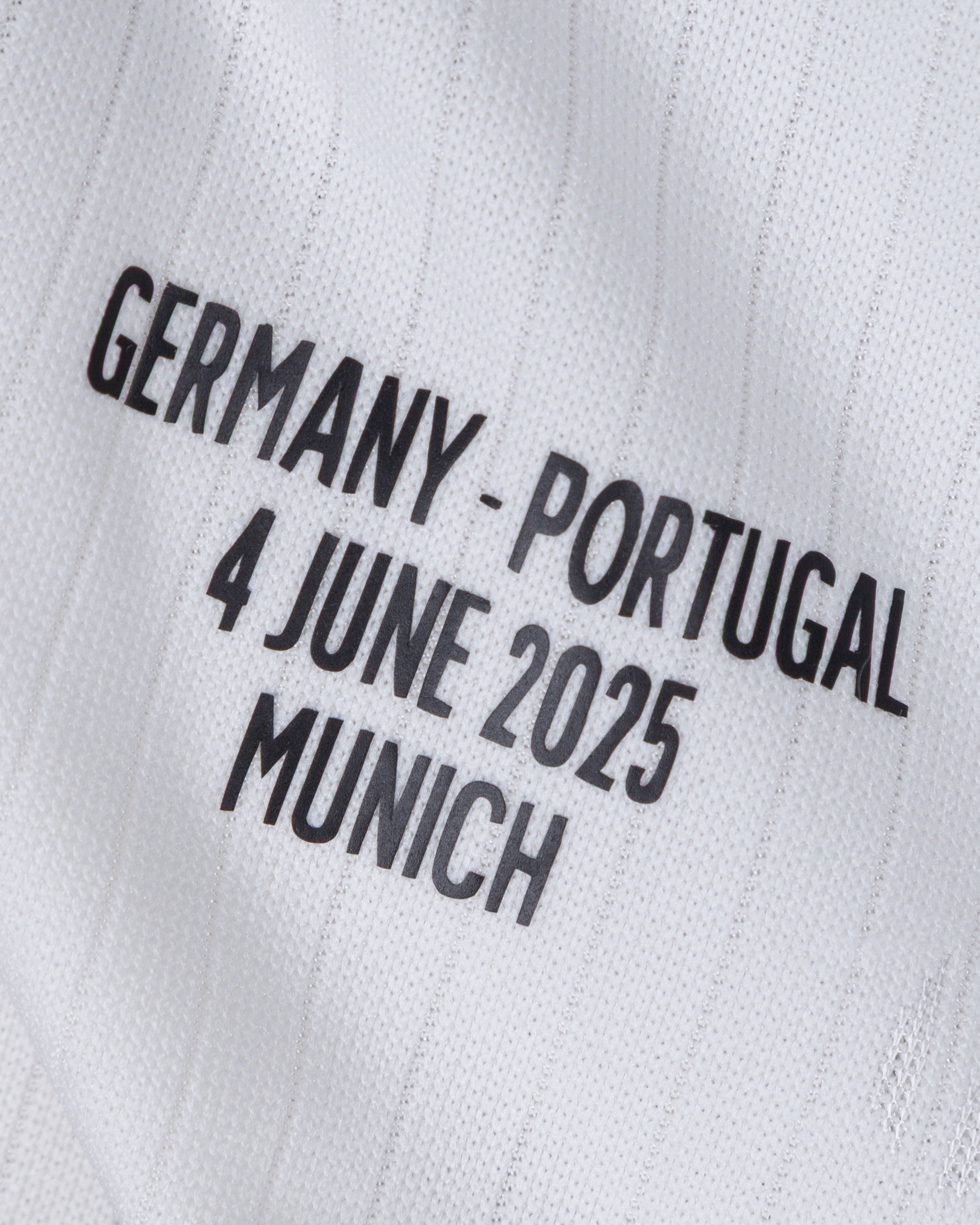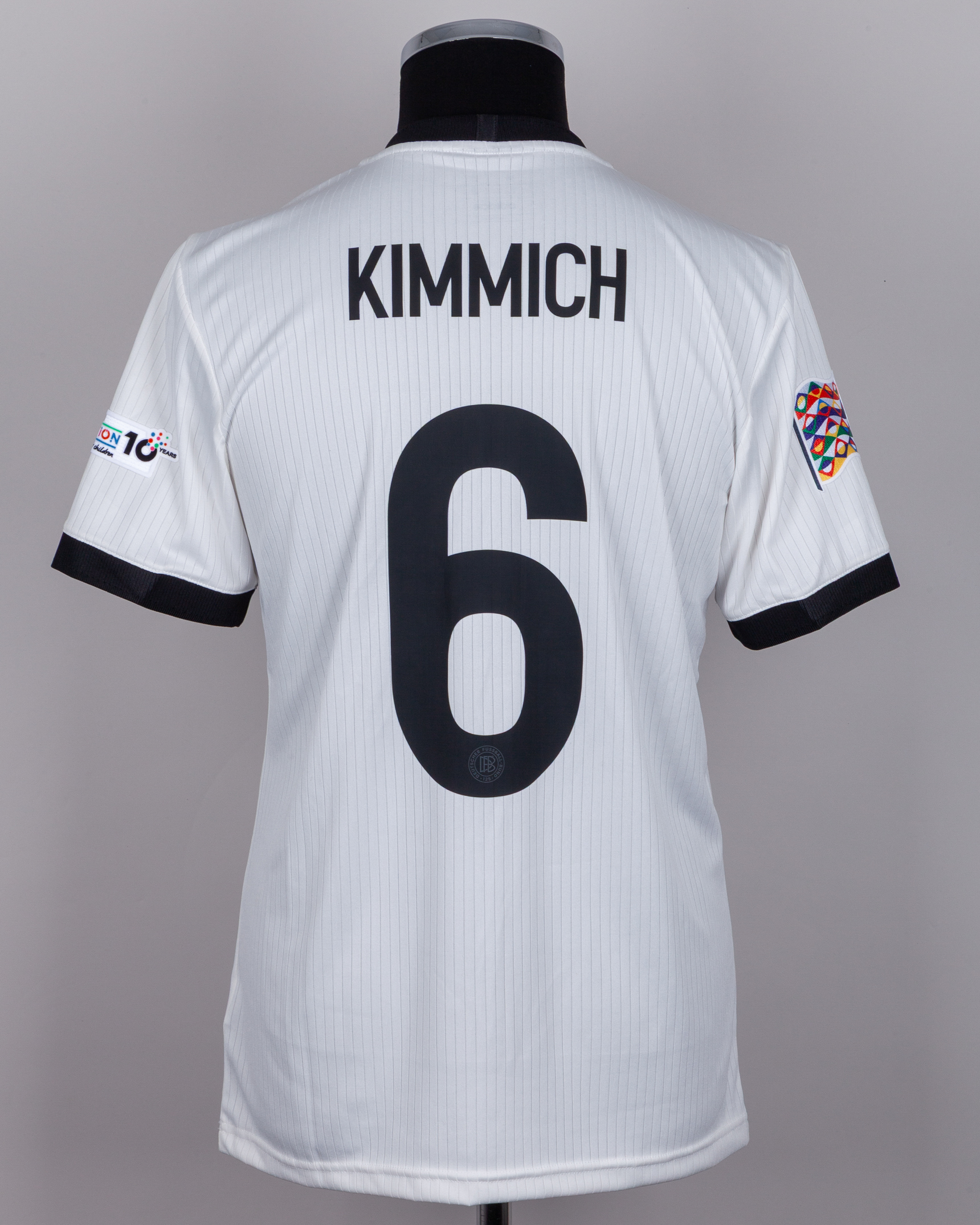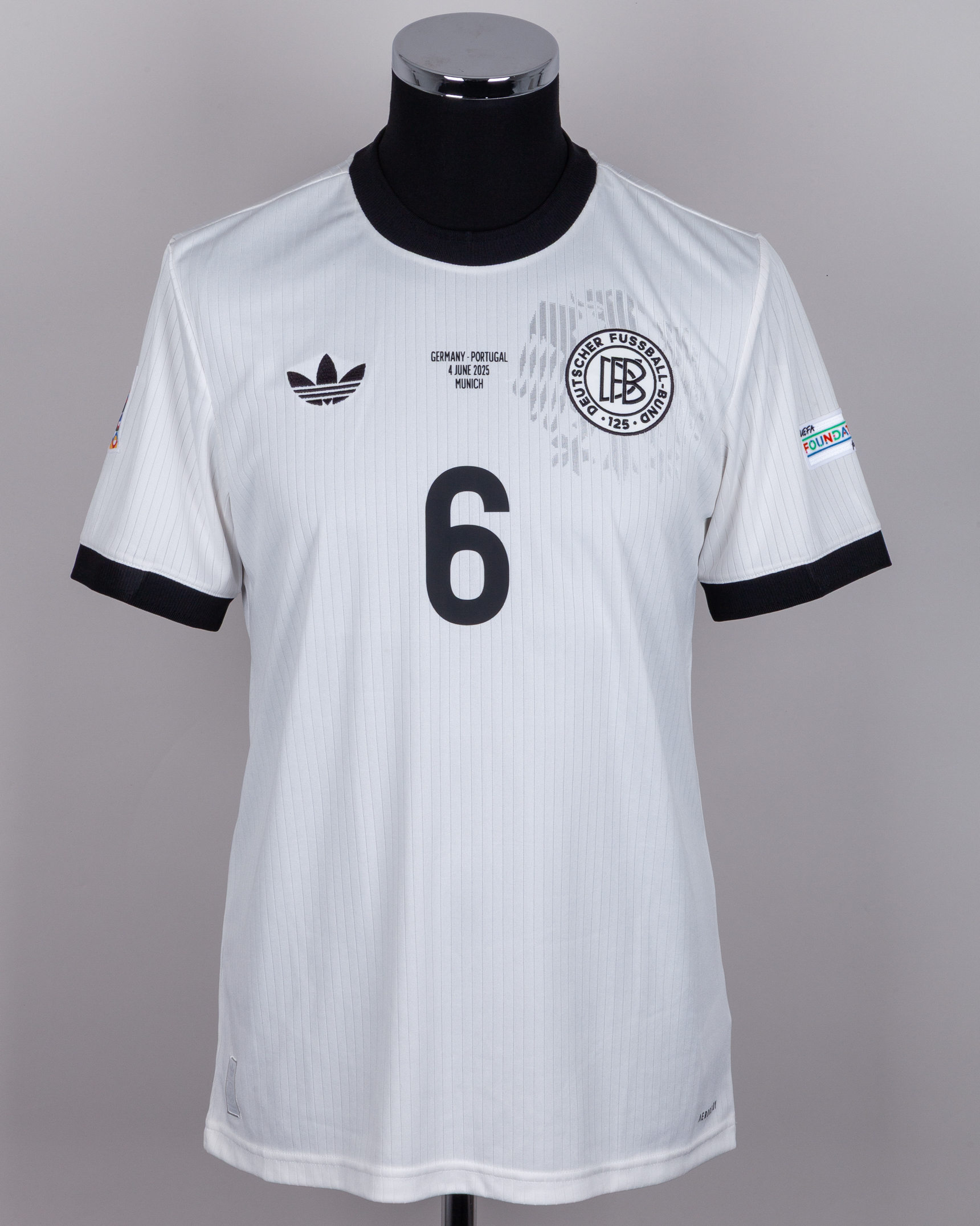 Joshua Kimmich white No.6 Germany v. Portugal short-sleeved shirt, 2025, Adidas, M, with crew-neck collar and embroidered cloth badge inscribed DFB DEUTSCHER FUSSBALL - BUND 125, with GERMANY - PORTUGAL 4 JUNE 2025 MUNICH decal, the reverse lettered KIMMICH, the right sleeve with Nations League flash and the left sleeve with UEFA foundation flash