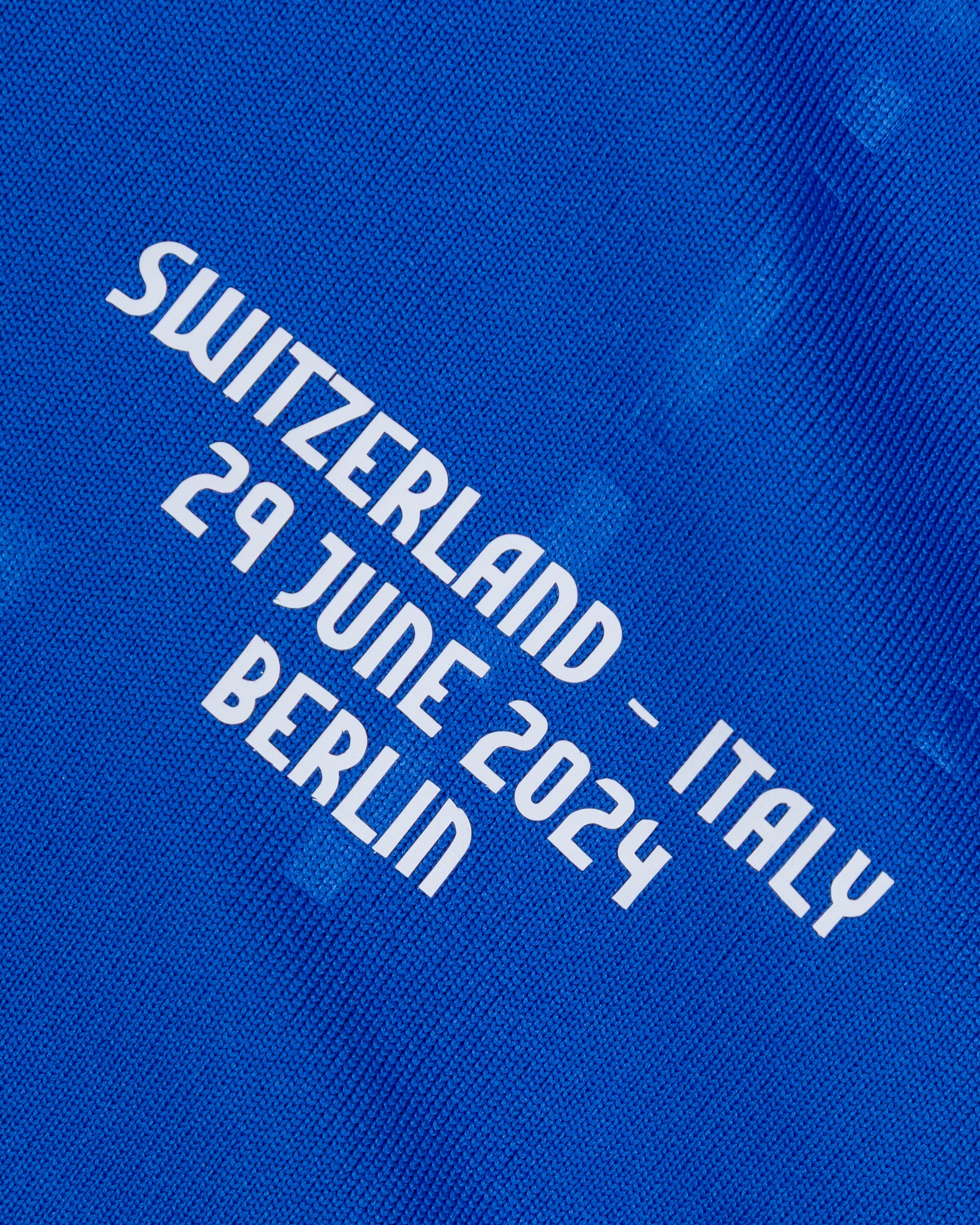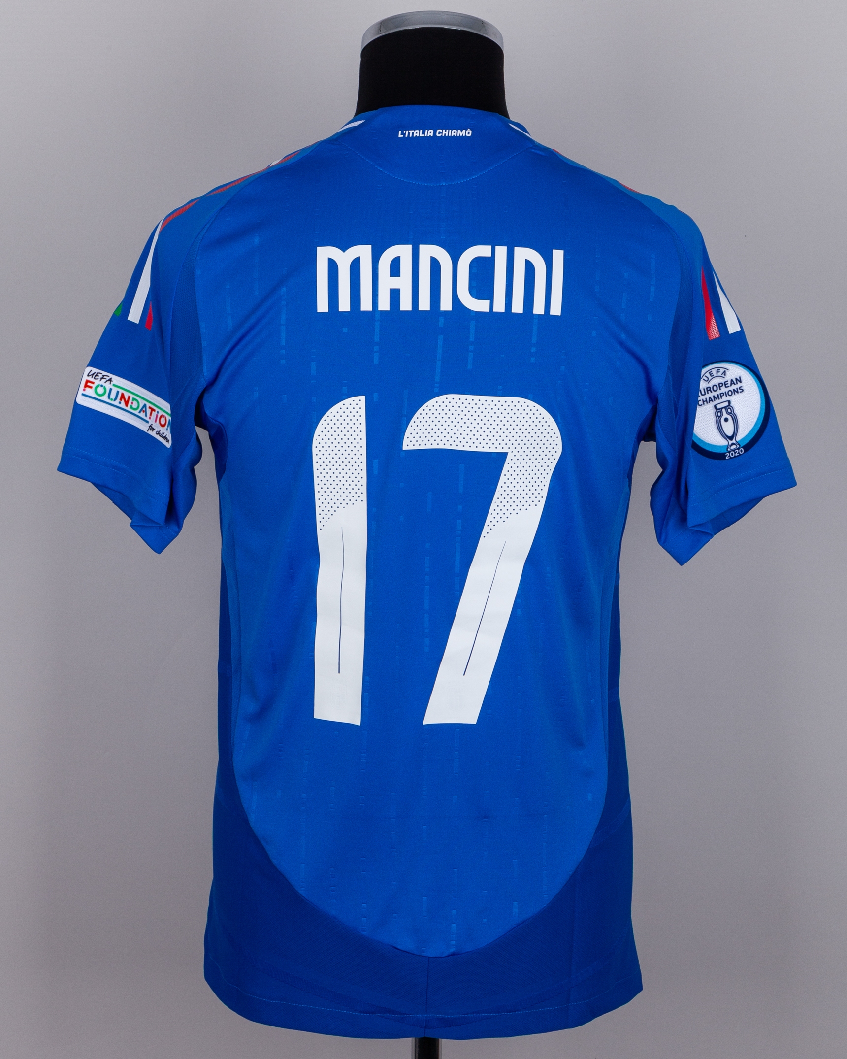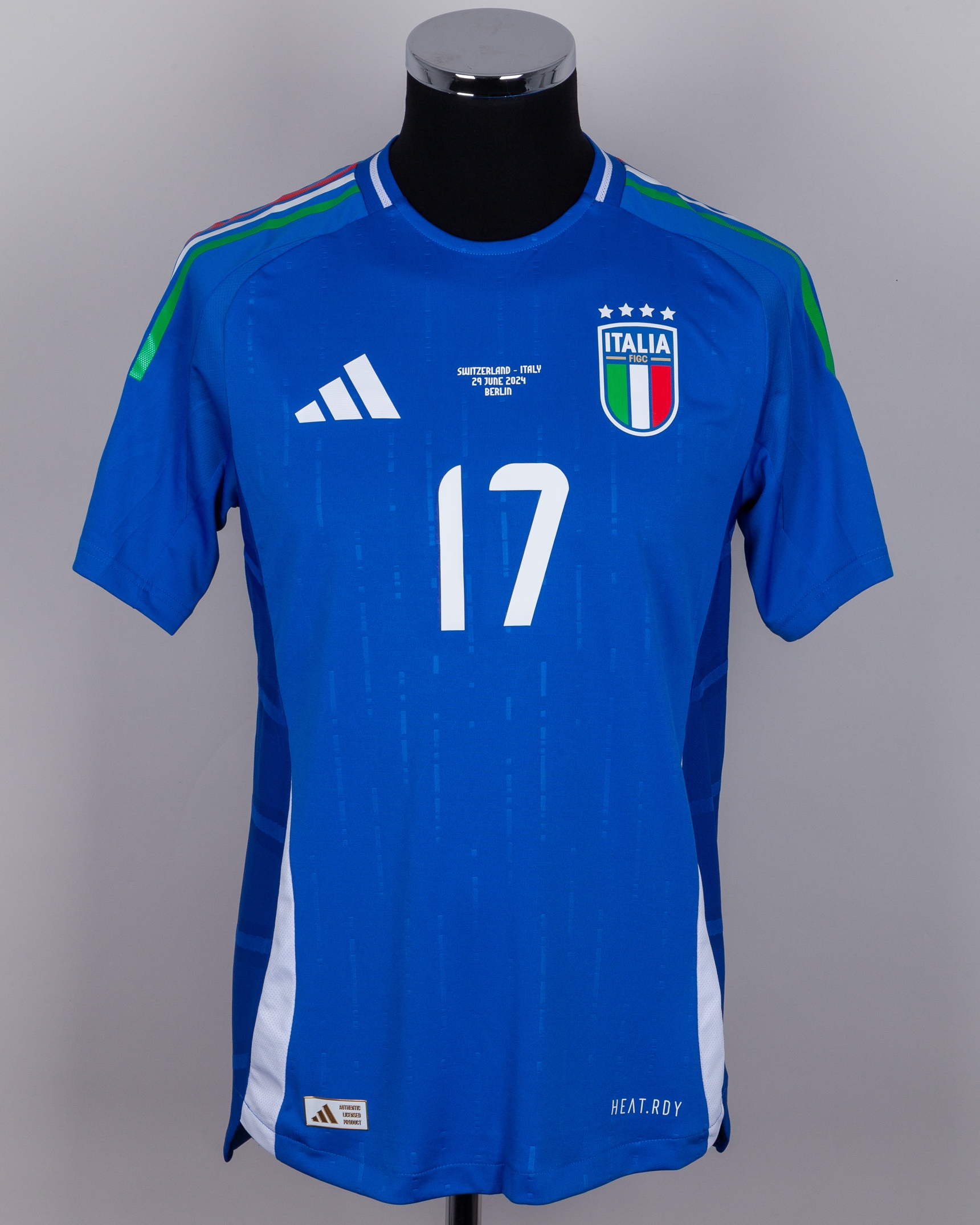 Gianluca Mancini blue No.17 Italy v. Switzerland short-sleeved shirt, 2024, Adidas, M, with crew-neck collar and printed badge, with SWITZERLAND - ITALY 29 JUNE 2024 BERLIN decal, the reverse lettered MANCINI, the right sleeve with UEFA European Champions 2020 flash and the left sleeve with UEFA foundation flash