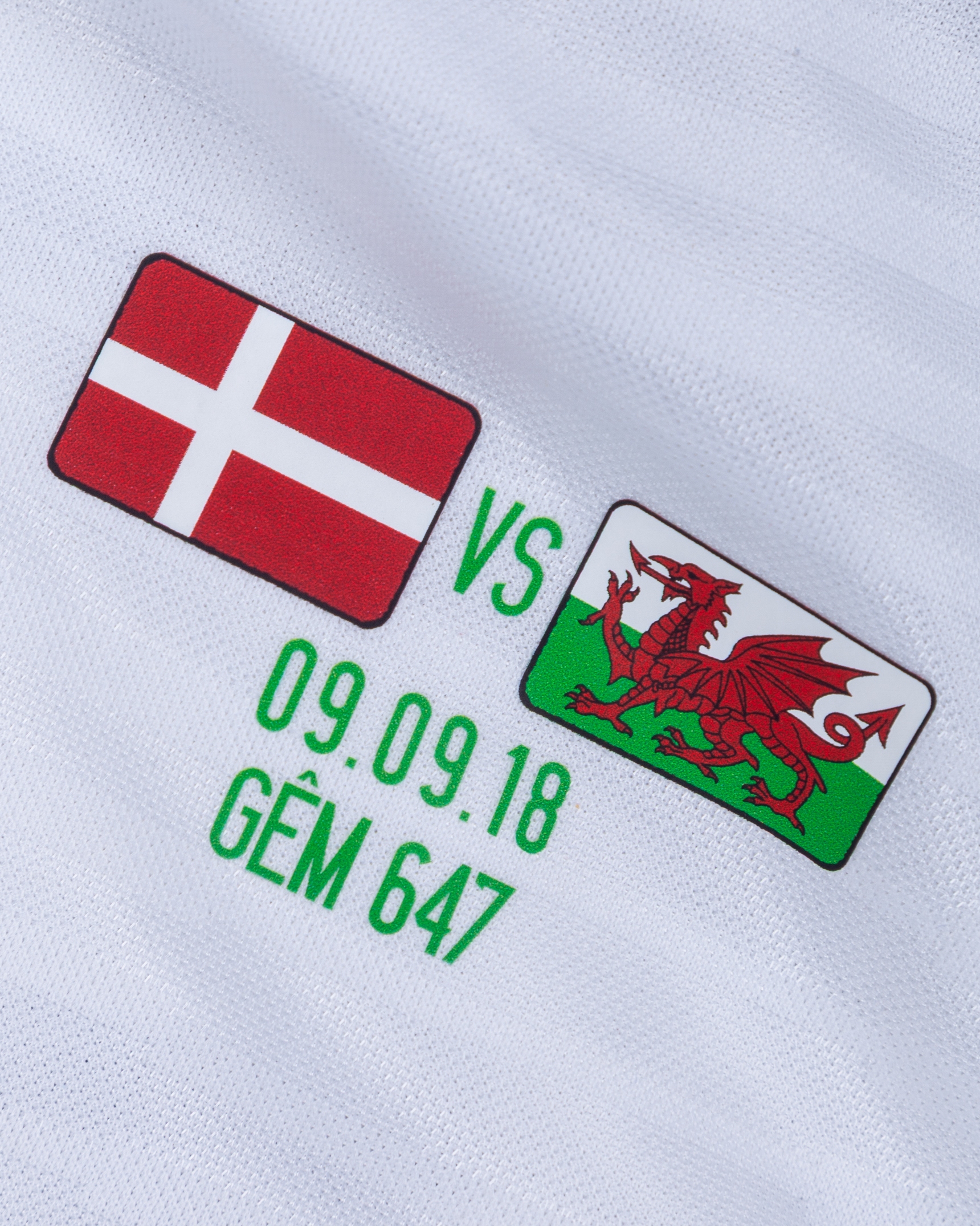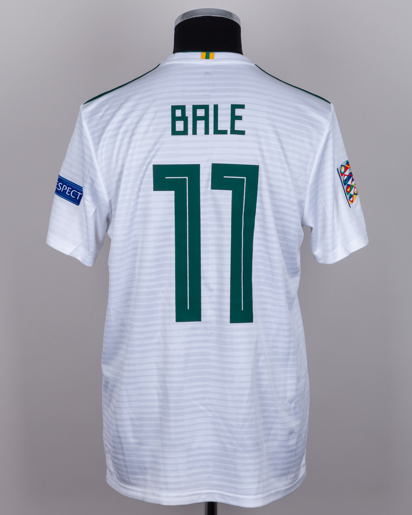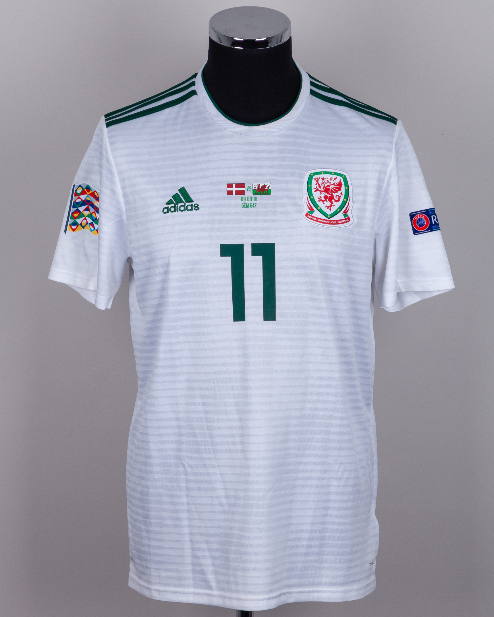 Gareth Bale white and green No.11 Wales v. Denmark short-sleeved shirt, 2018, Adidas, L, with crew-neck collar and embroidered cloth badge inscribed GORAU CHWARAE CYD CHWARAE, with Danish flag VS Welsh flag 09.09.18 GEM 647 decal, the reverse lettered BALE, the right sleeve with Nations League flash and the left sleeve with respect flash
