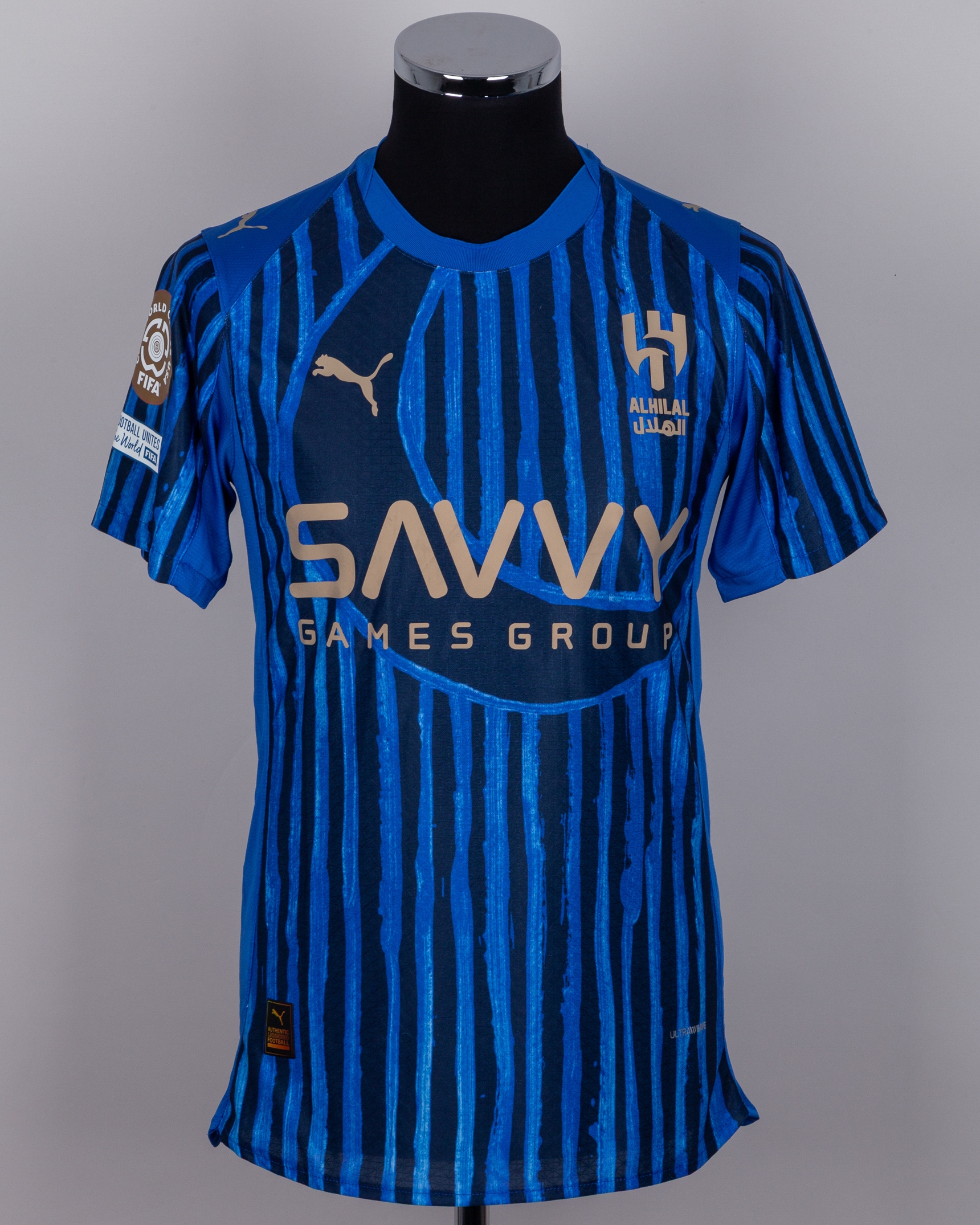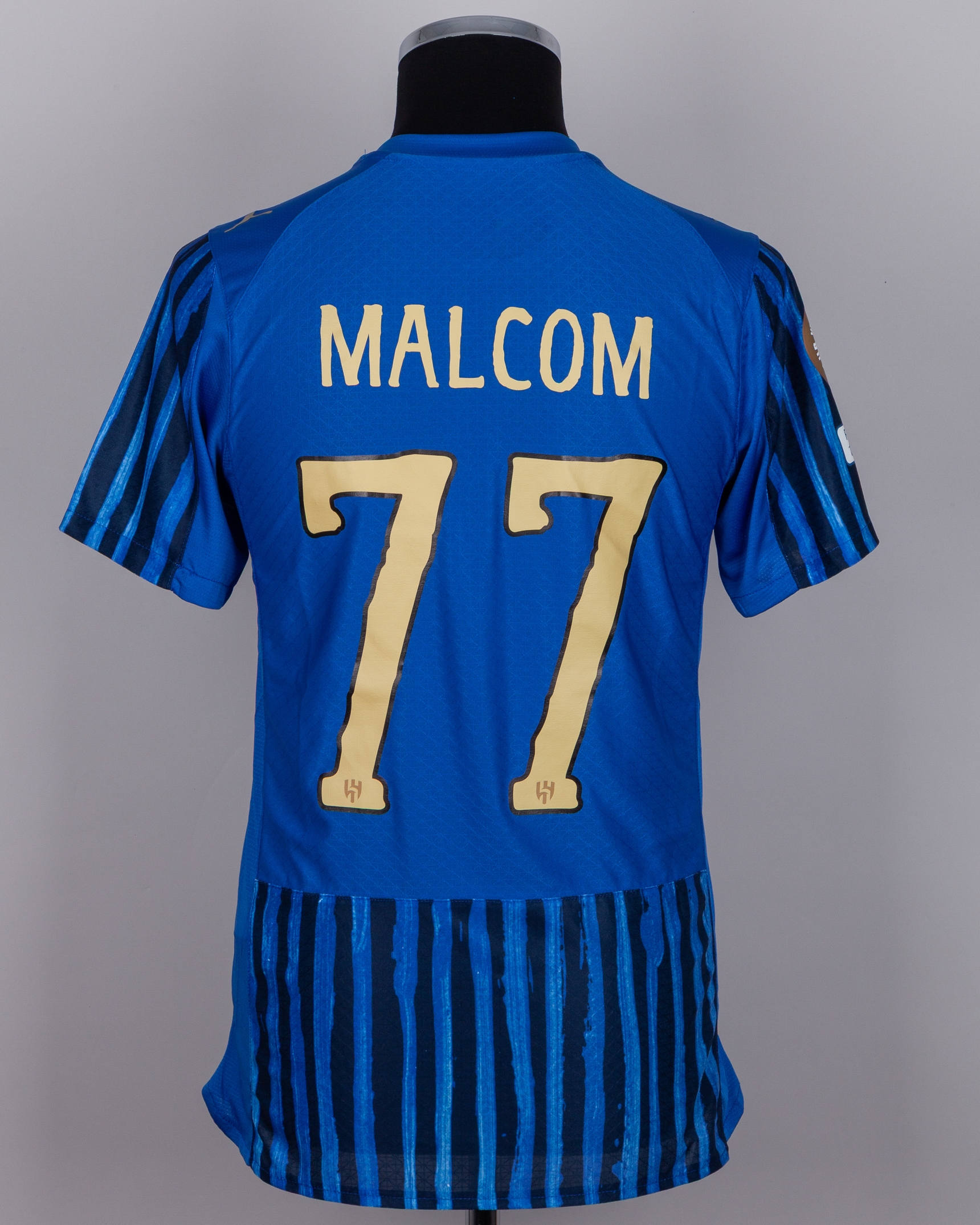 Malcom blue No.77 Al Hilal short-sleeved shirt, 2025, Puma, M, with crew-neck collar and printed badge, the reverse lettered MALCOM, the right sleeve with FIFA Club World Cup 25 USA flash