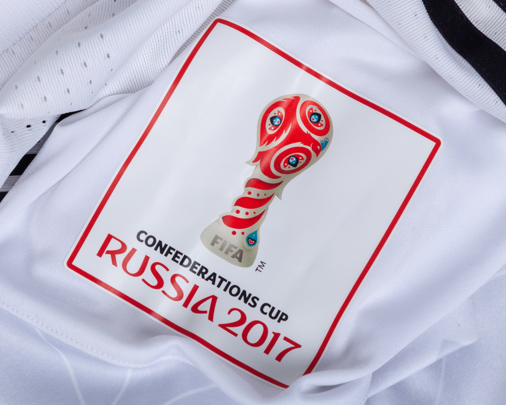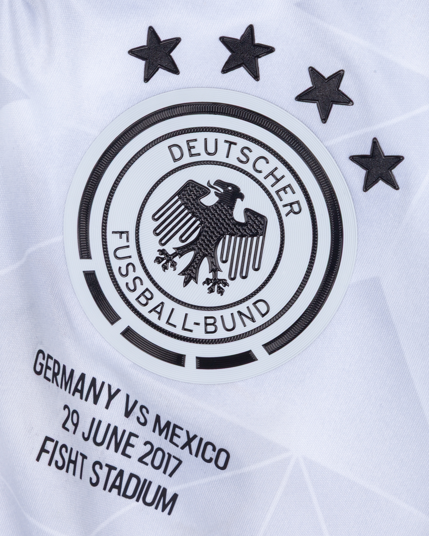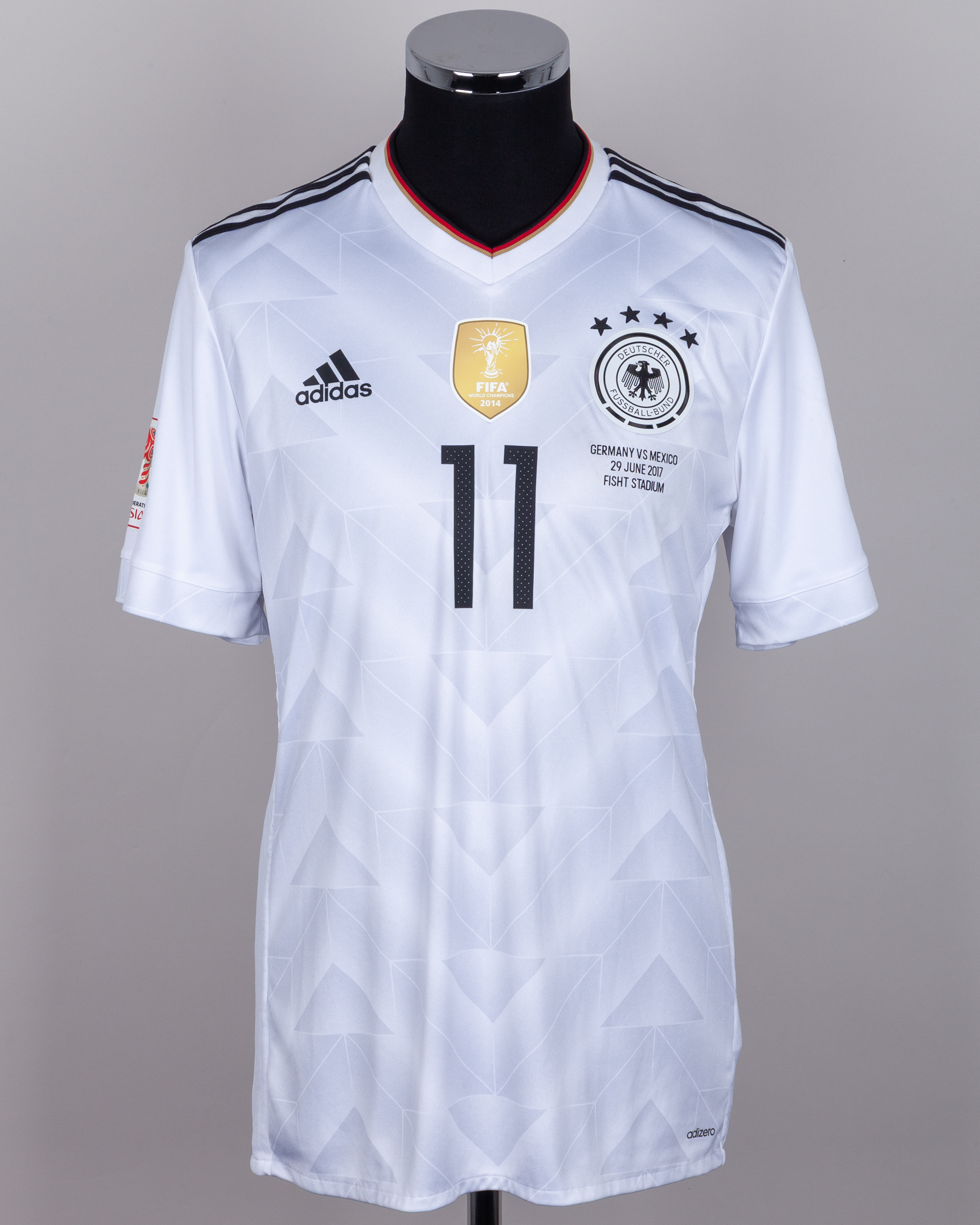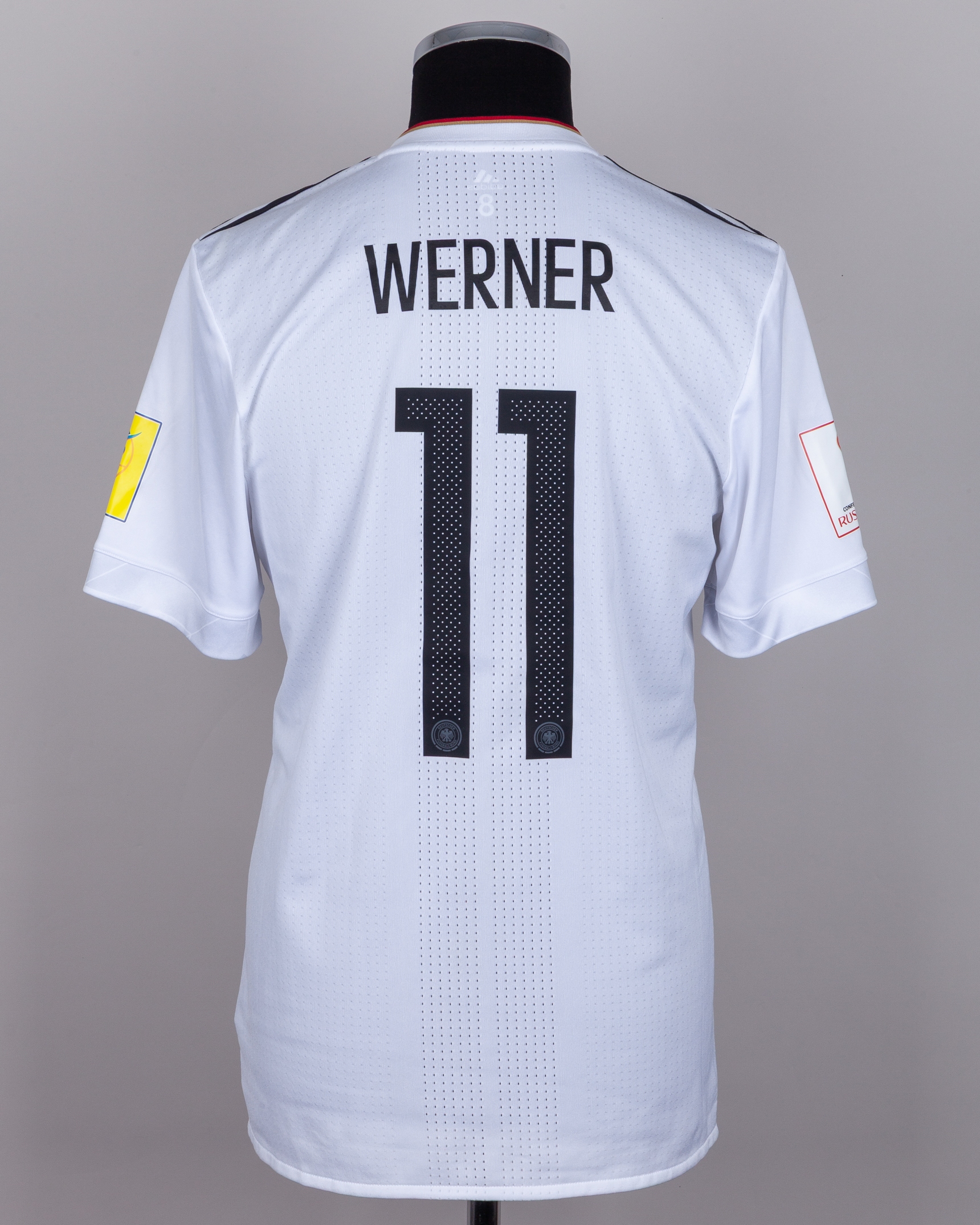 Timo Werner white No.11 Germany v. Mexico short-sleeved shirt, 2017, Adidas, 8, with v-neck collar and printed badge, with GERMANY VS MEXICO 29 JUNE 2017 FISHT STADIUM decal, with FIFA World Champions 2014 badge, the reverse lettered WERNER, the right sleeve with Confederations Cup Russia 2017 flash and the left sleeve with fair play flash