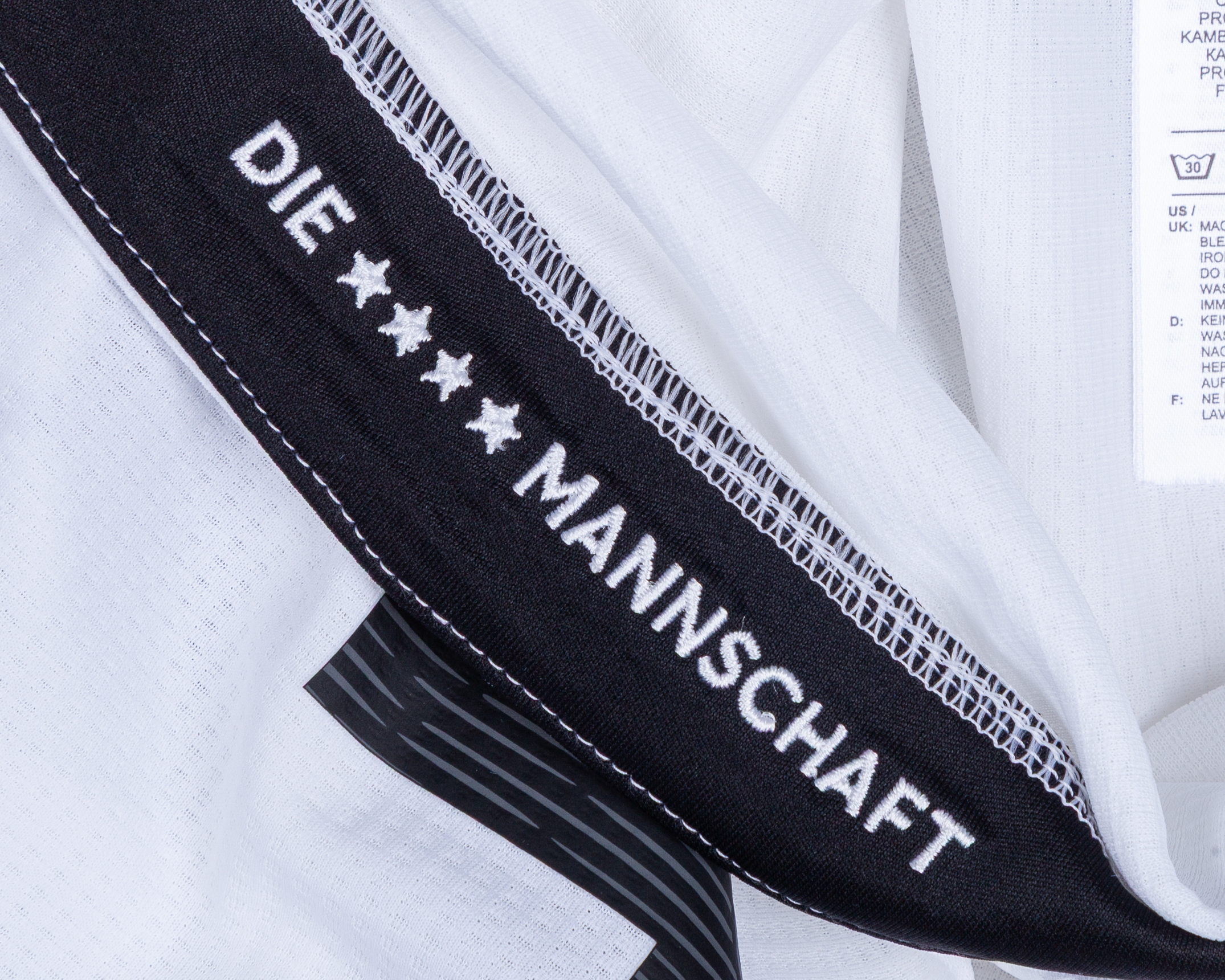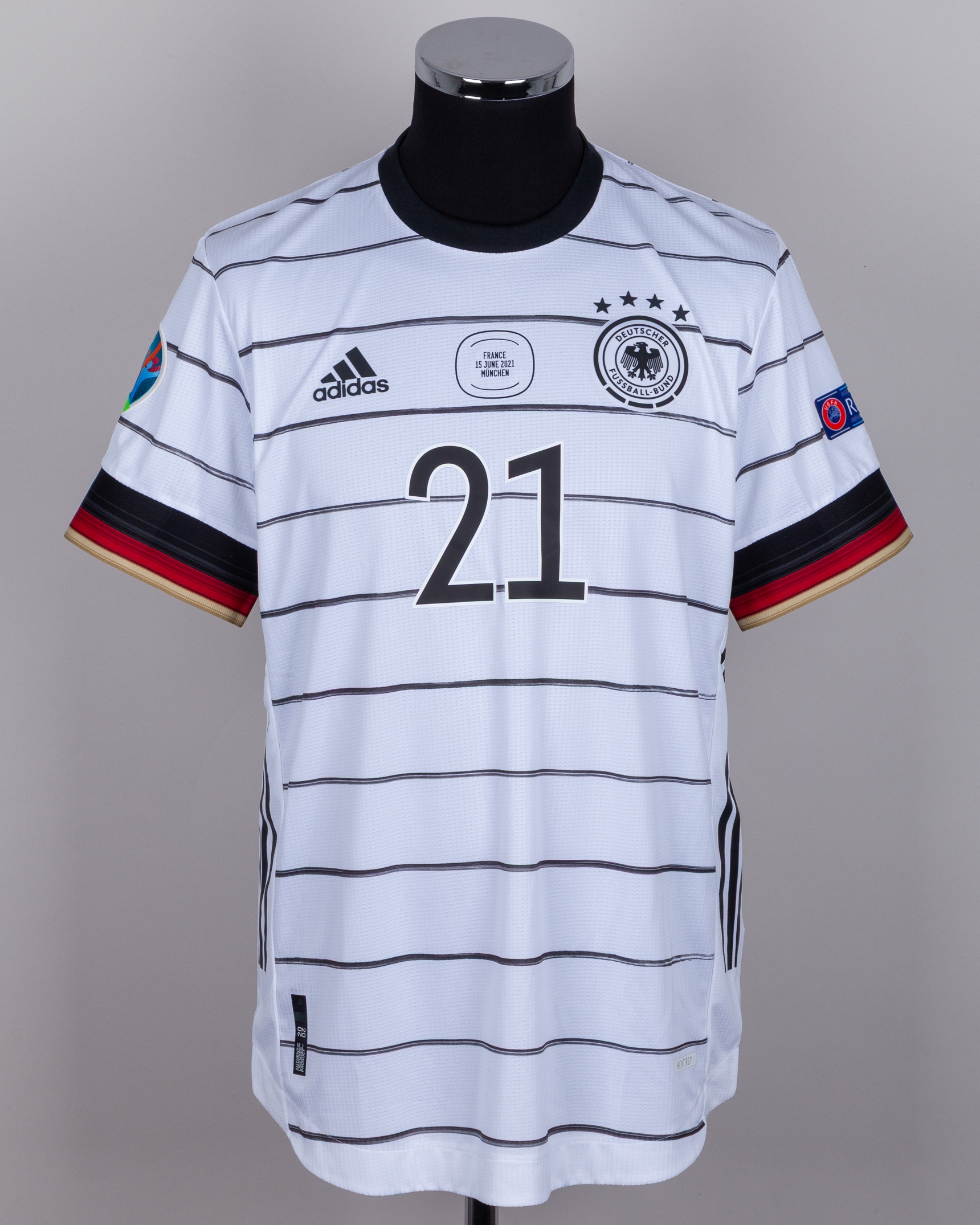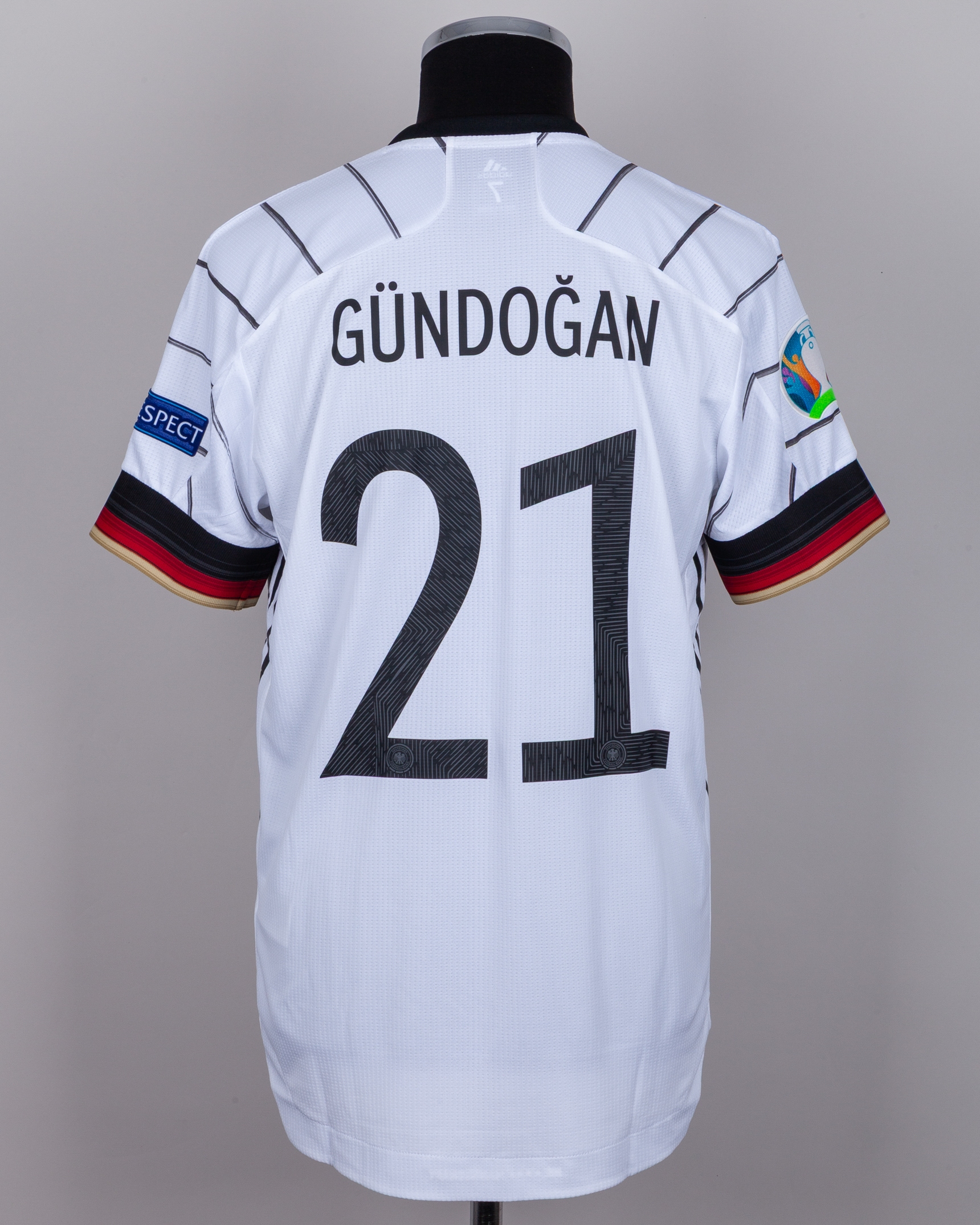 Ilkay Gundogan white and black No.21 Germany v. France short-sleeved shirt, 2021, Adidas, 7, with crew-neck collar and printed badge, with FRANCE 15 JUNE 2021 MUNCHEN decal, the reverse lettered GUNDOGAN, the right sleeve with Euros flash and the left sleeve with respect flash